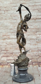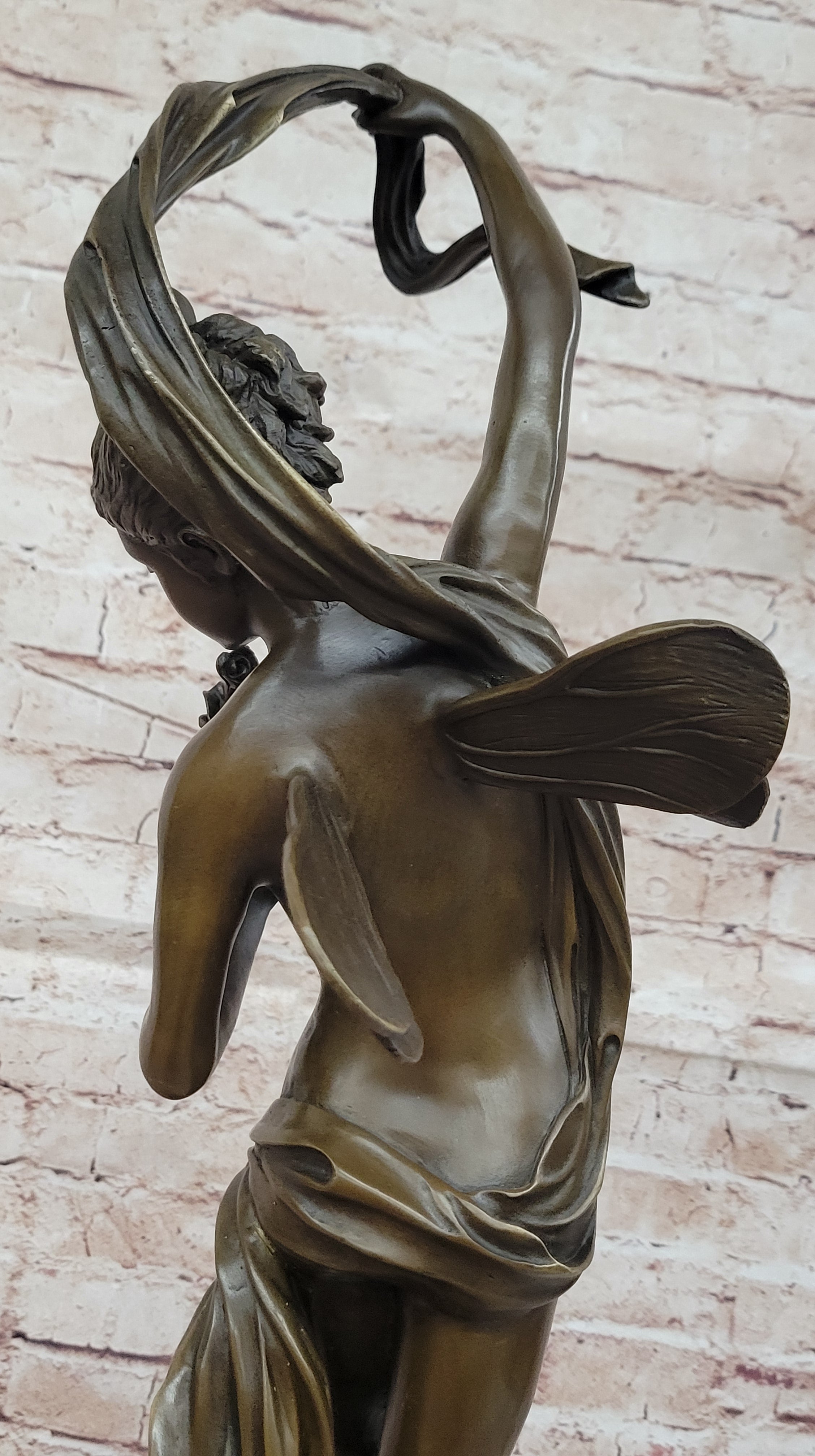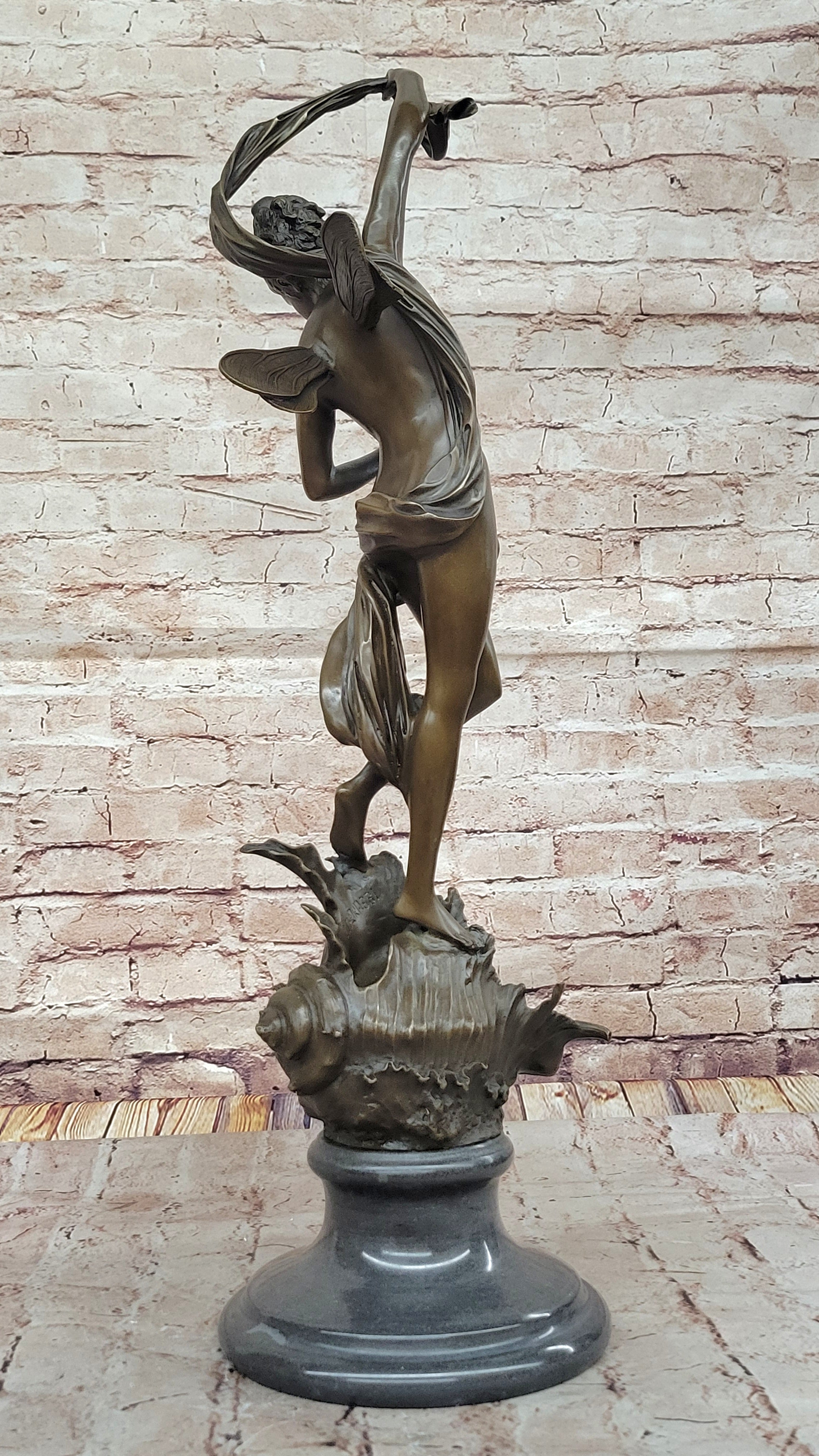 Mounted on a round black marble base, this stunning Art Nouveau fairy sculpture is a perfect addition to any home, office, or gallery. Whether displayed as a symbol of fantasy, spirituality, or artistic elegance, this signed Madrazzi artwork will captivate admirers and bring a touch of celestial beauty to any space.Bronze Dimensions with Marble Base: Height 26.5" X Width 9"
