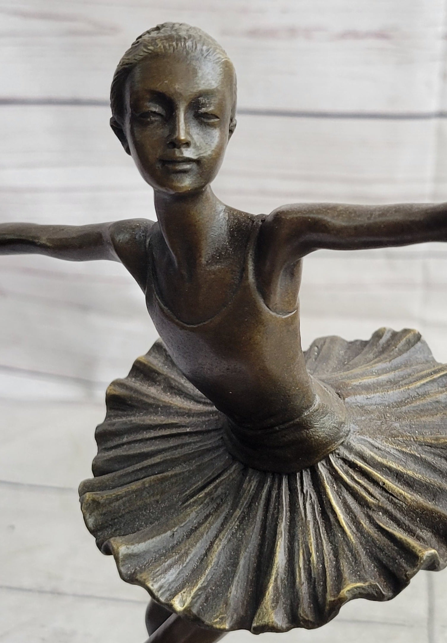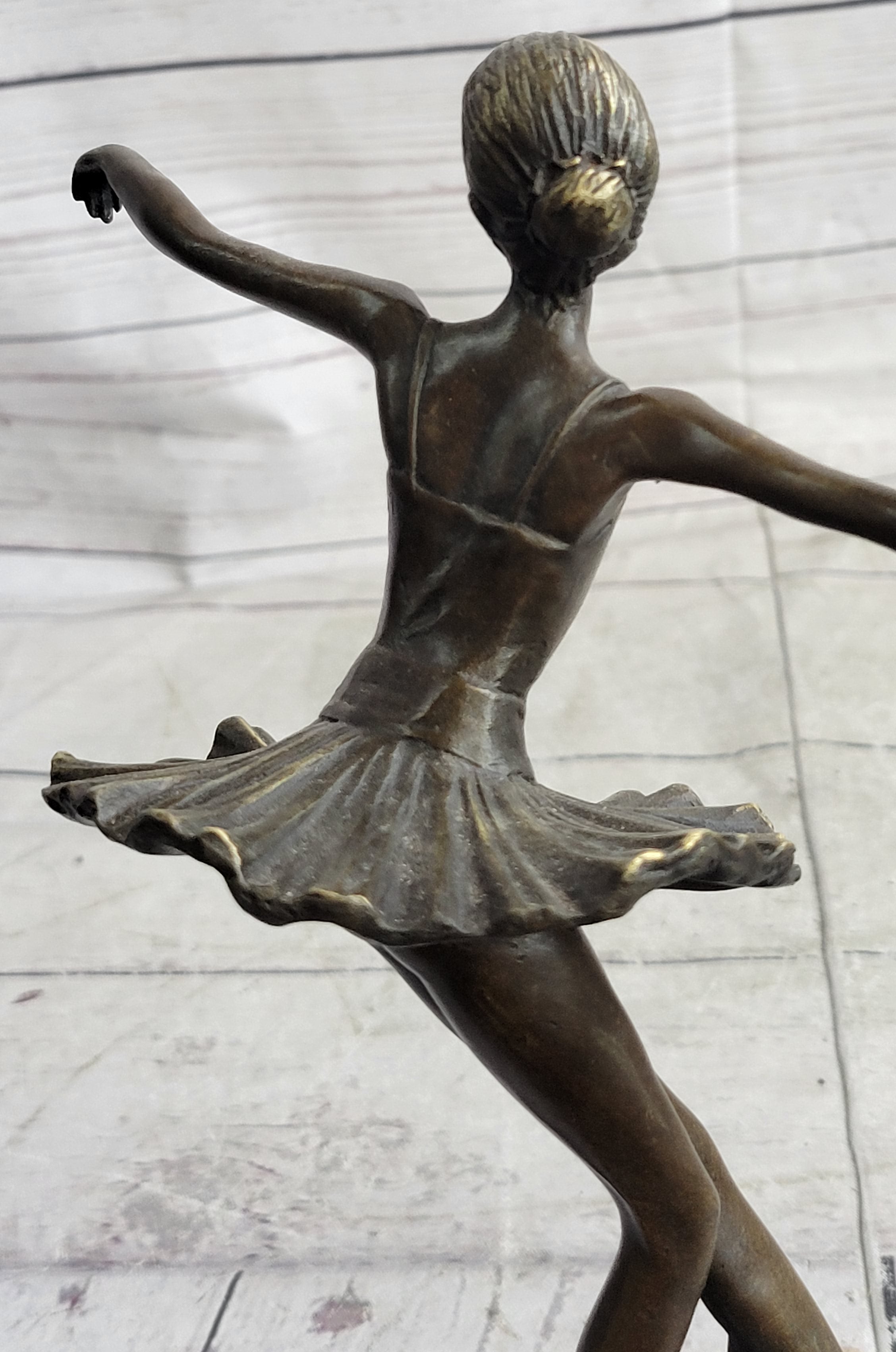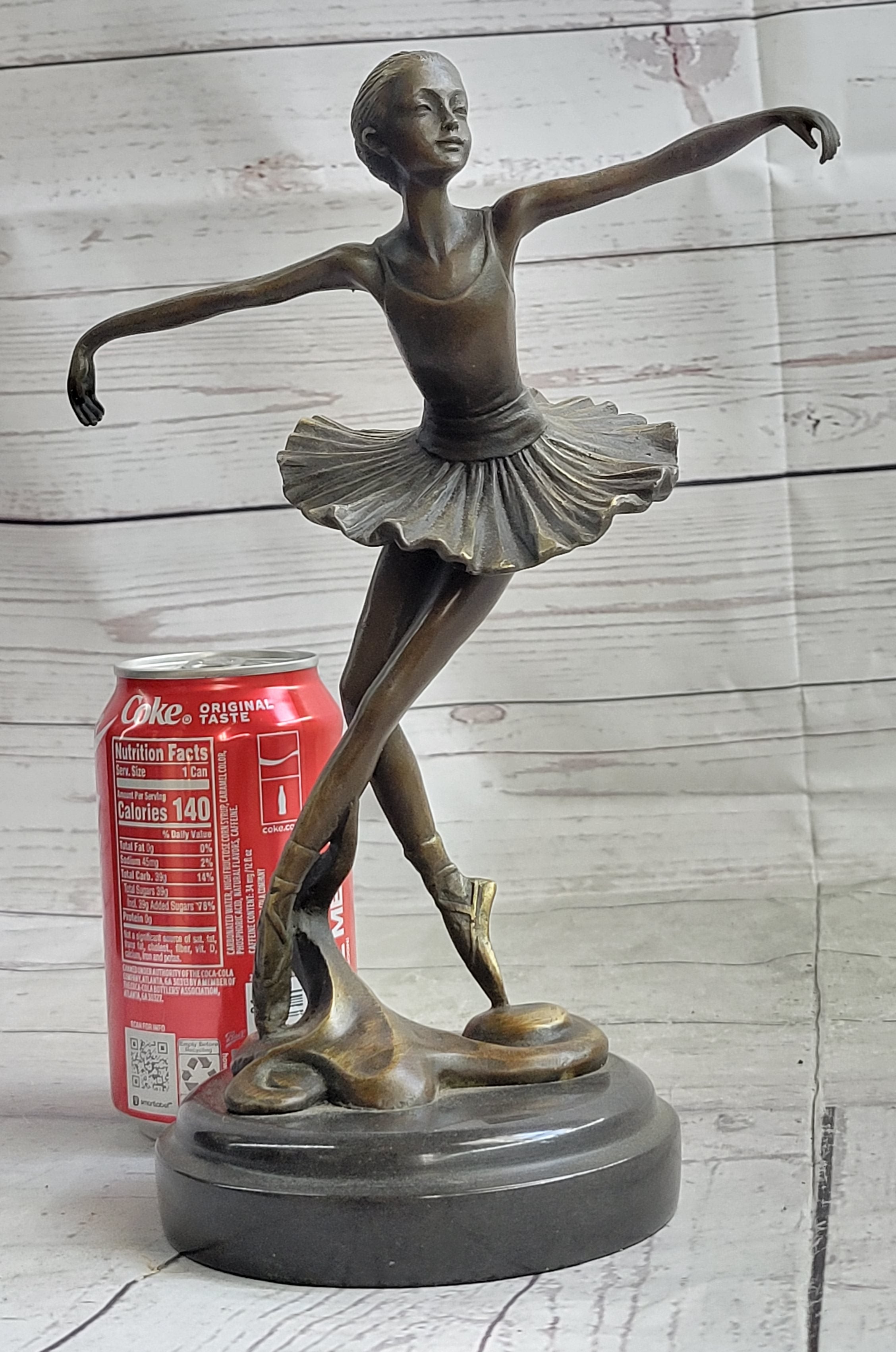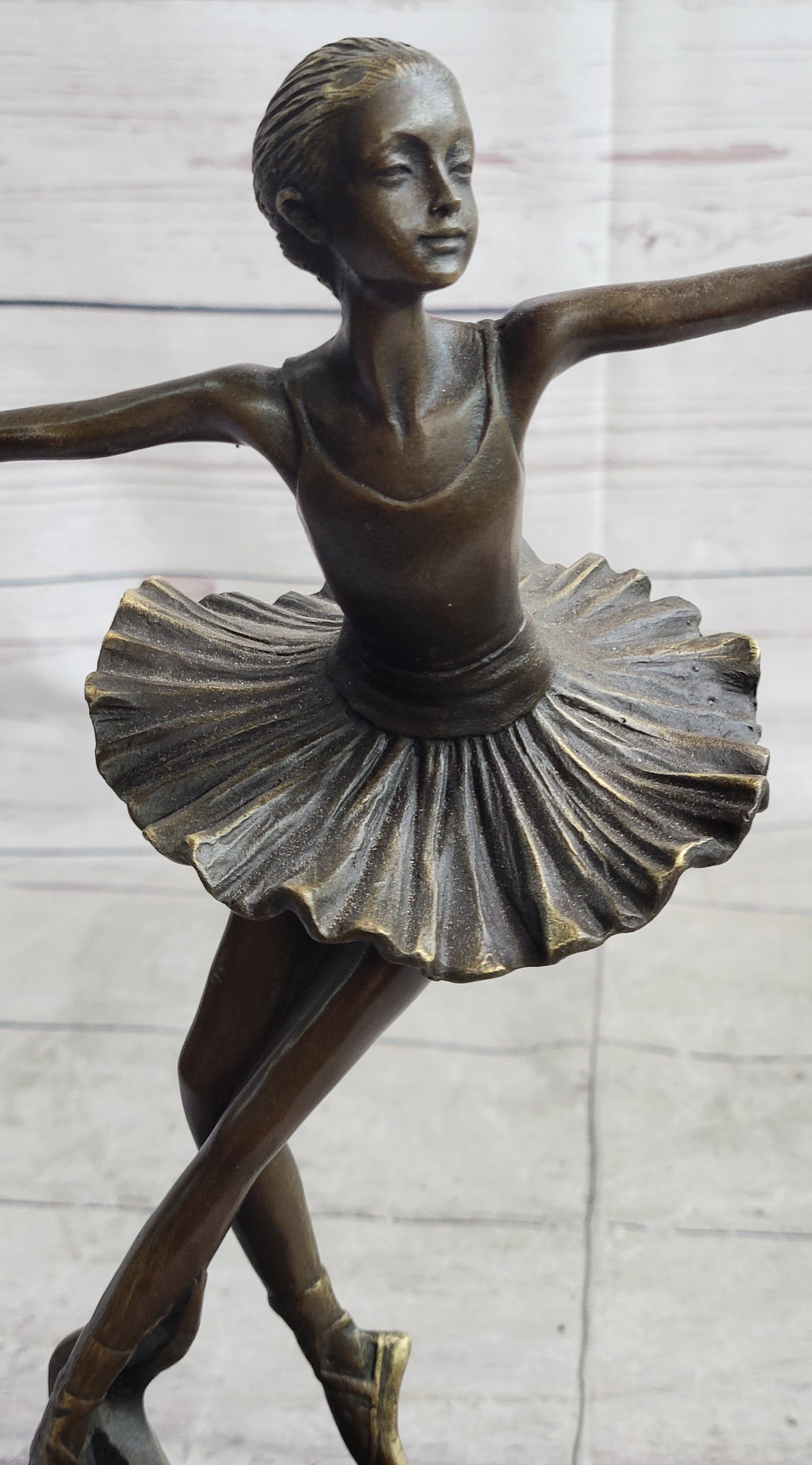 This captivating bronze sculpture beautifully portrays a young ballet dancer in a graceful and poised pose. Every detail, from the depth and warmth of the patina to the intricate features of the dancer, exudes a sense of calmness and elegance. As you gaze upon this sculpture, it evokes a feeling of witnessing a lullaby in still motion, capturing the artistry and serenity of ballet.