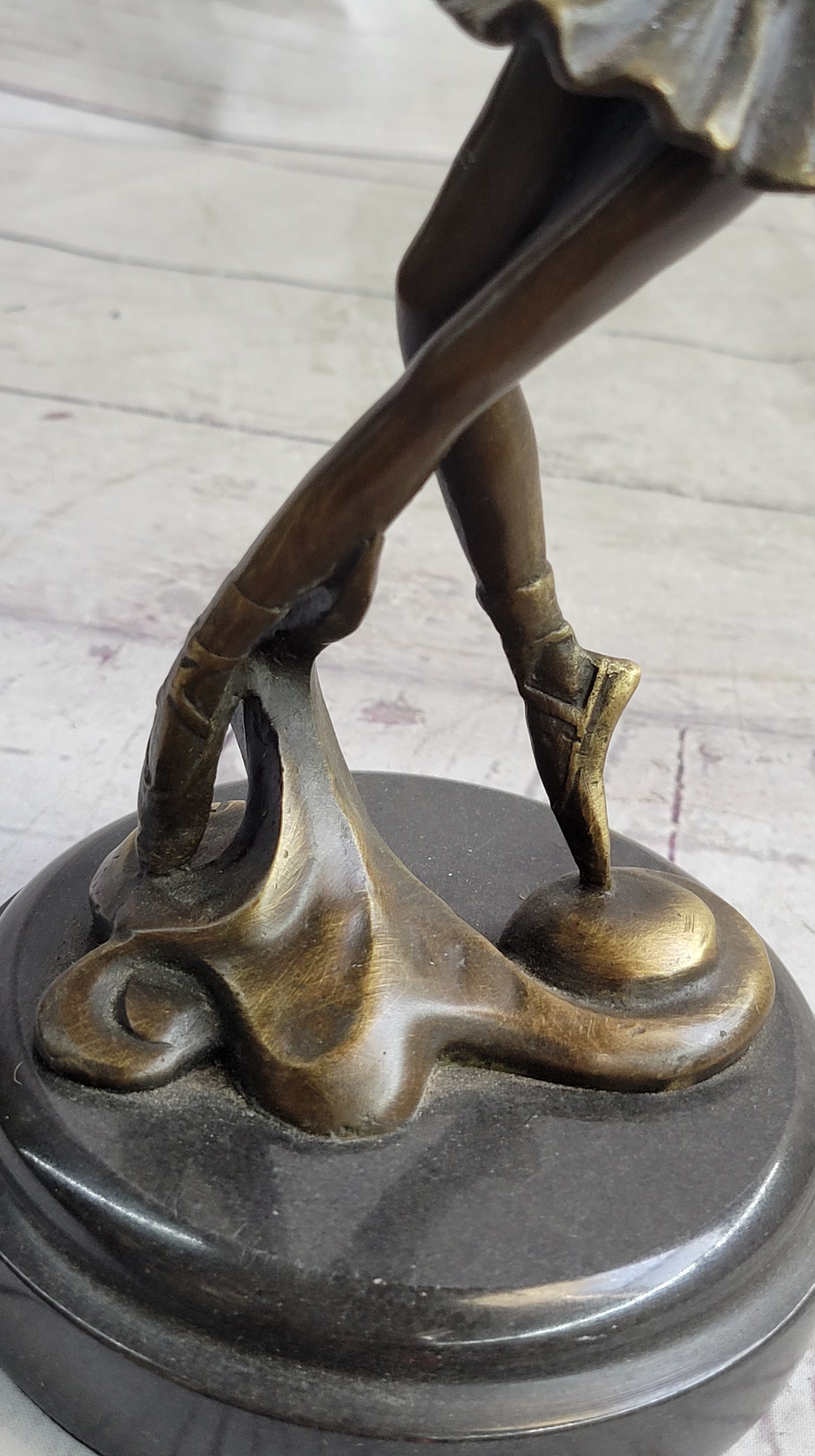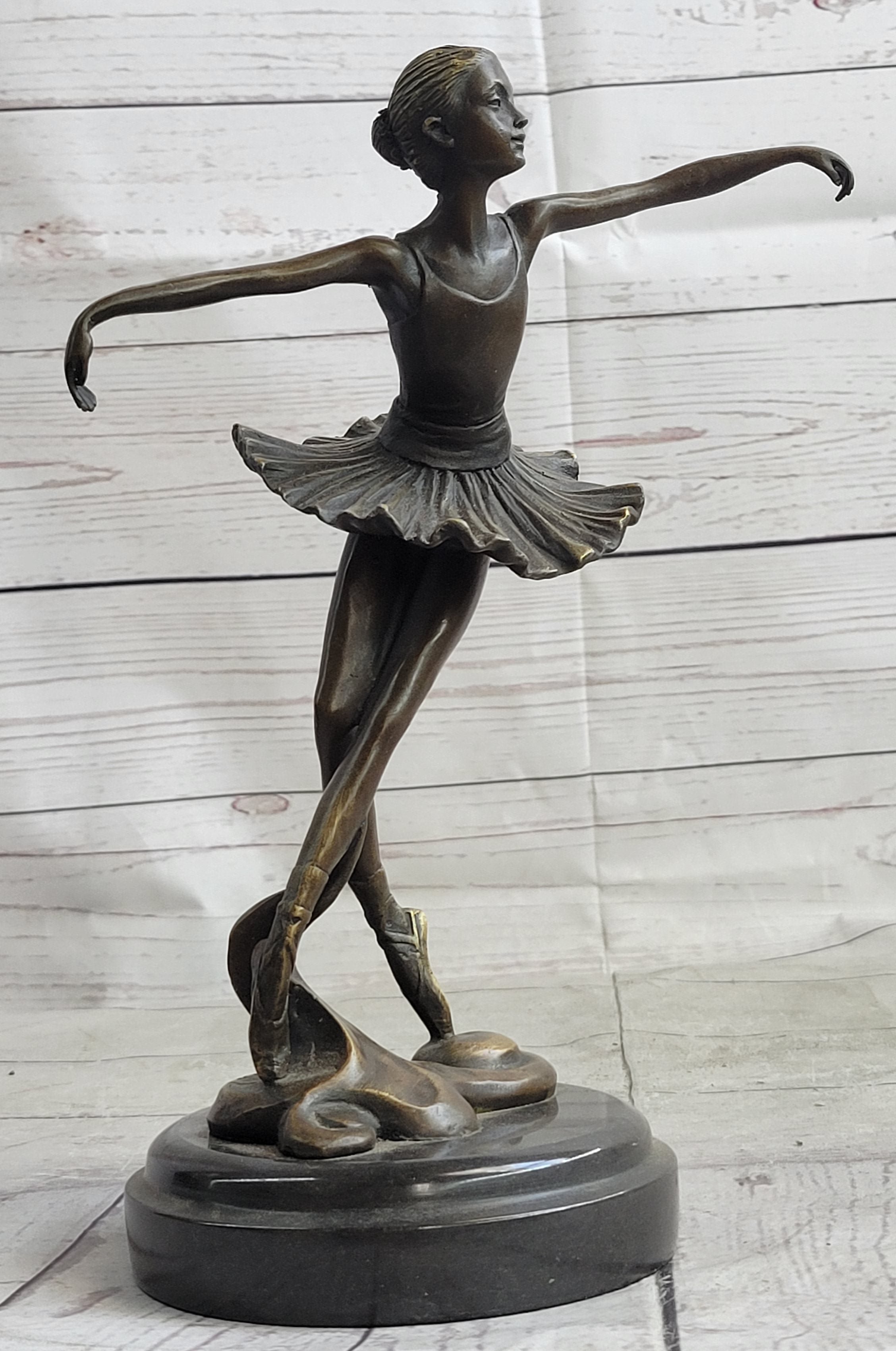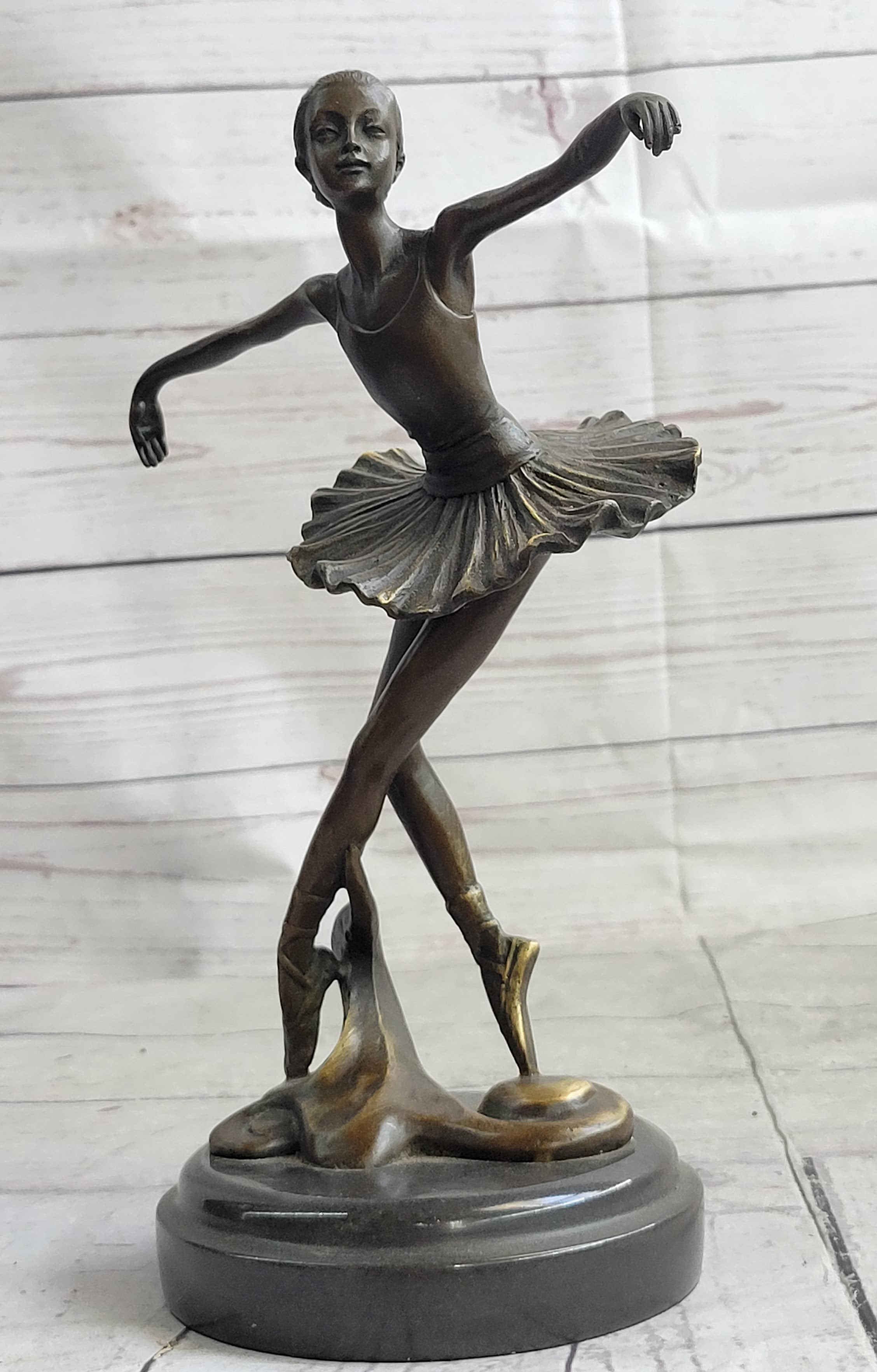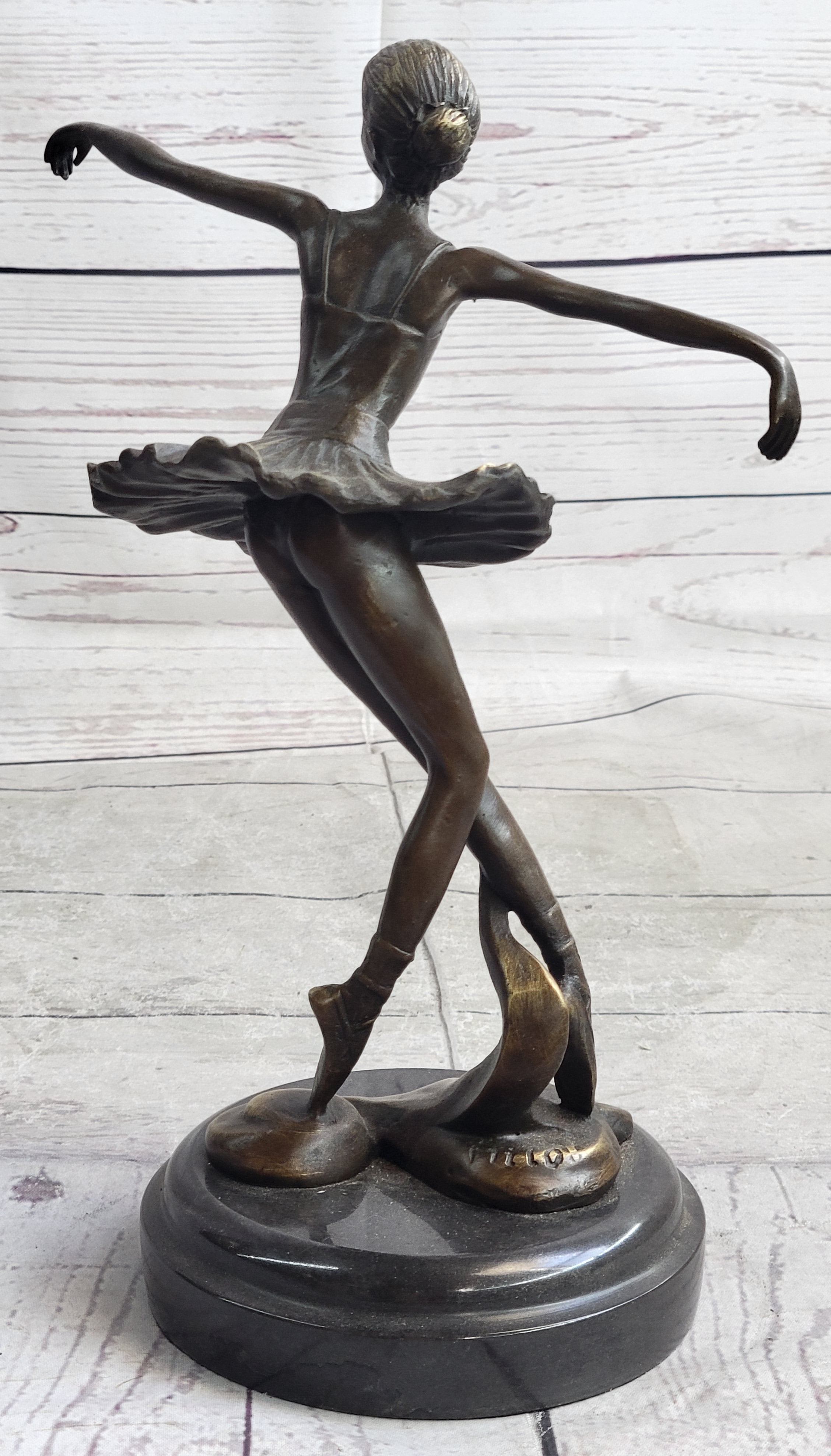 Crafted using the time-honored "Lost Wax Method" and adorned with a rich brown patina finish, this sculpture is a true work of art. Mounted on a black marble base, it exudes a classic and timeless quality. With its 100% bronze composition and meticulous handcraftsmanship, this sculpture is a testament to both the artist's talent and the enduring beauty of the ballet. It is proudly signed by the artist Milo, making it a cherished addition to any art collection.Bronze Dimensions with Marble Base: Height 10" X Width 7"