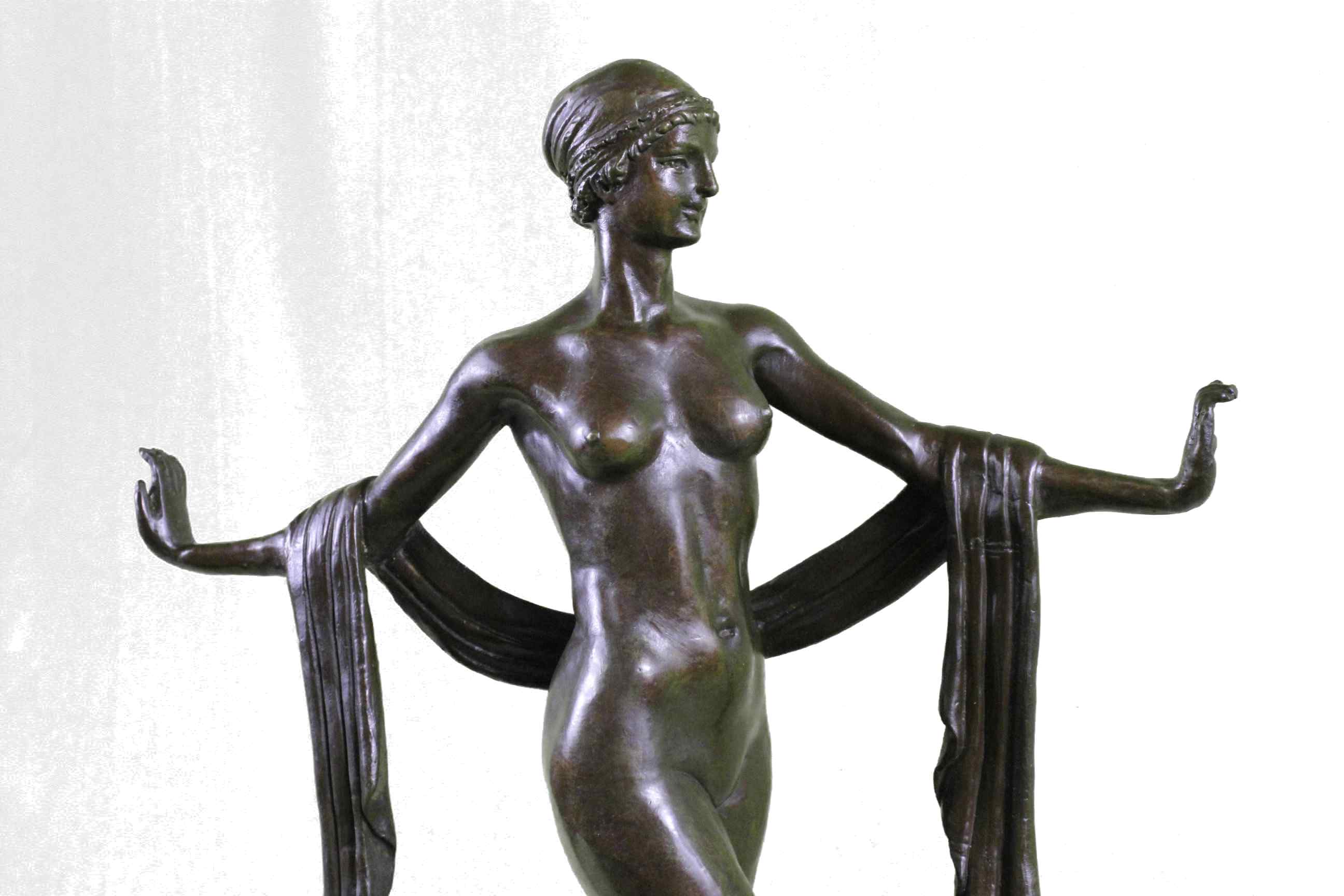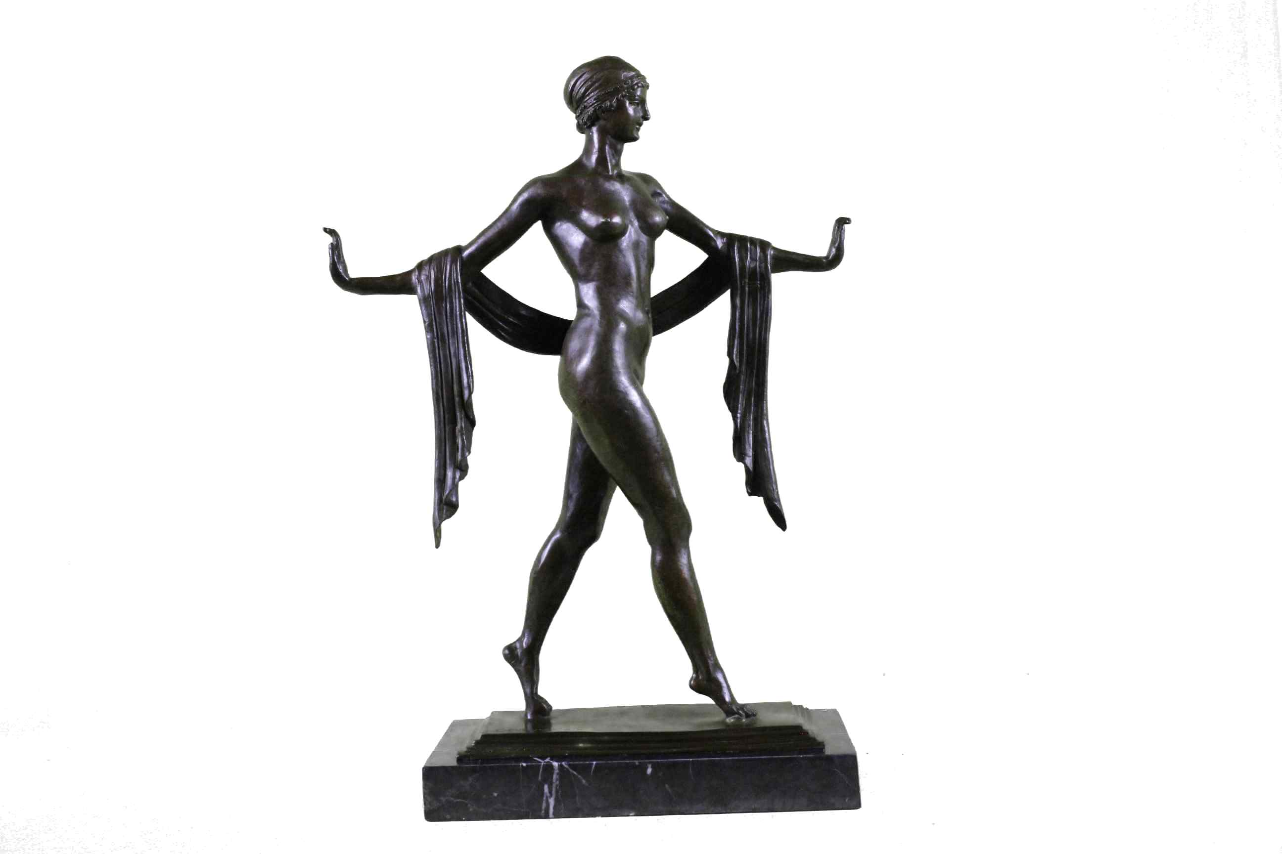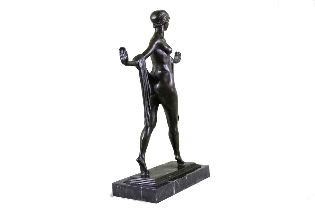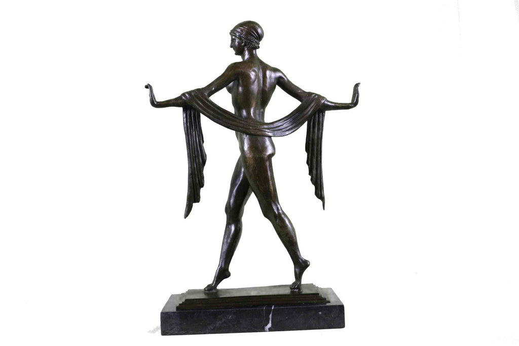 Born in Stuttgart, Germany, on December 20, 1890, Carl Paul Jennewein, came to the United States in 1907 and studied at the Art Students League in New York from 1908 to 1911. He returned to Europe and received the Prix de Rome in 1916. During four years of advanced study he produced a number of distinguished works including Cupid and Crane in 1925 as a companion piece to Cupid and Gazelle to celebrate the birth of his third child, Alessandro. Jennewein returned to the USA and executed an important sculptural commission, a polychromed terracotta in the Hellenistic style, for the west wing of the Philadelphia Museum of Art. While designing that work on a trip to Rome, Jennewein created the Art Deco classic you see here, The Greek Dance. In order to secure commissions, Jennewein necessarily applied traditional styles for his larger works, but he was strongly influenced by Modernist styles for his smaller works. One of his designs defies Bronze Dimensions with Marble Base:Height 16" x Width 12"