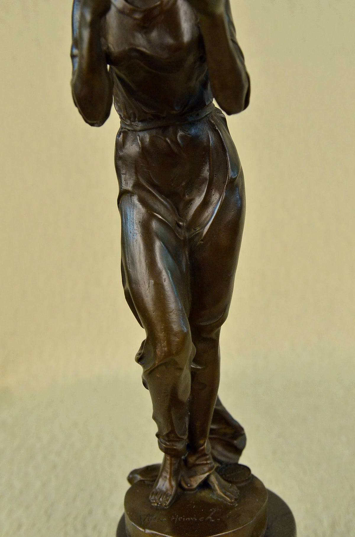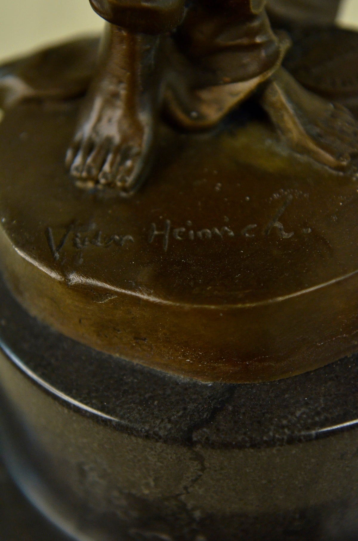 This lovely woman stands up while she drinks soup out of a little soup bowl. She seems to be blowing into the hot bowl careful not to burn herself as she is about to drink it. She has the most amazing one piece dress that hangs real low to the floor barely exposing her feet. Her hair is nicely comb into an elegant style, and she wears this amazing necklace that cover her dress collar. She is cast using the ancient "Lost Wax Method" stained in brown patina and is mounted atop a double marble base, signed by Viclor Heinvich.Bronze Dimensions with Marble Base:Height 17" x Width 6"