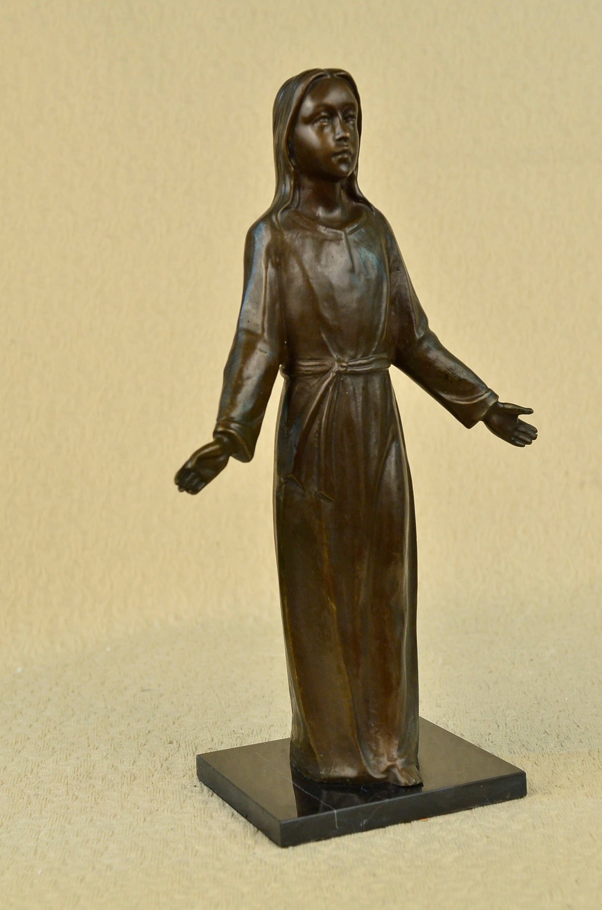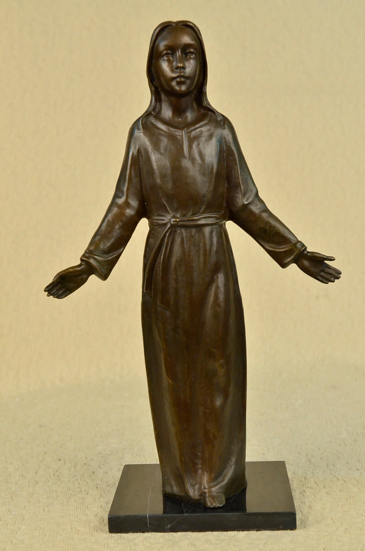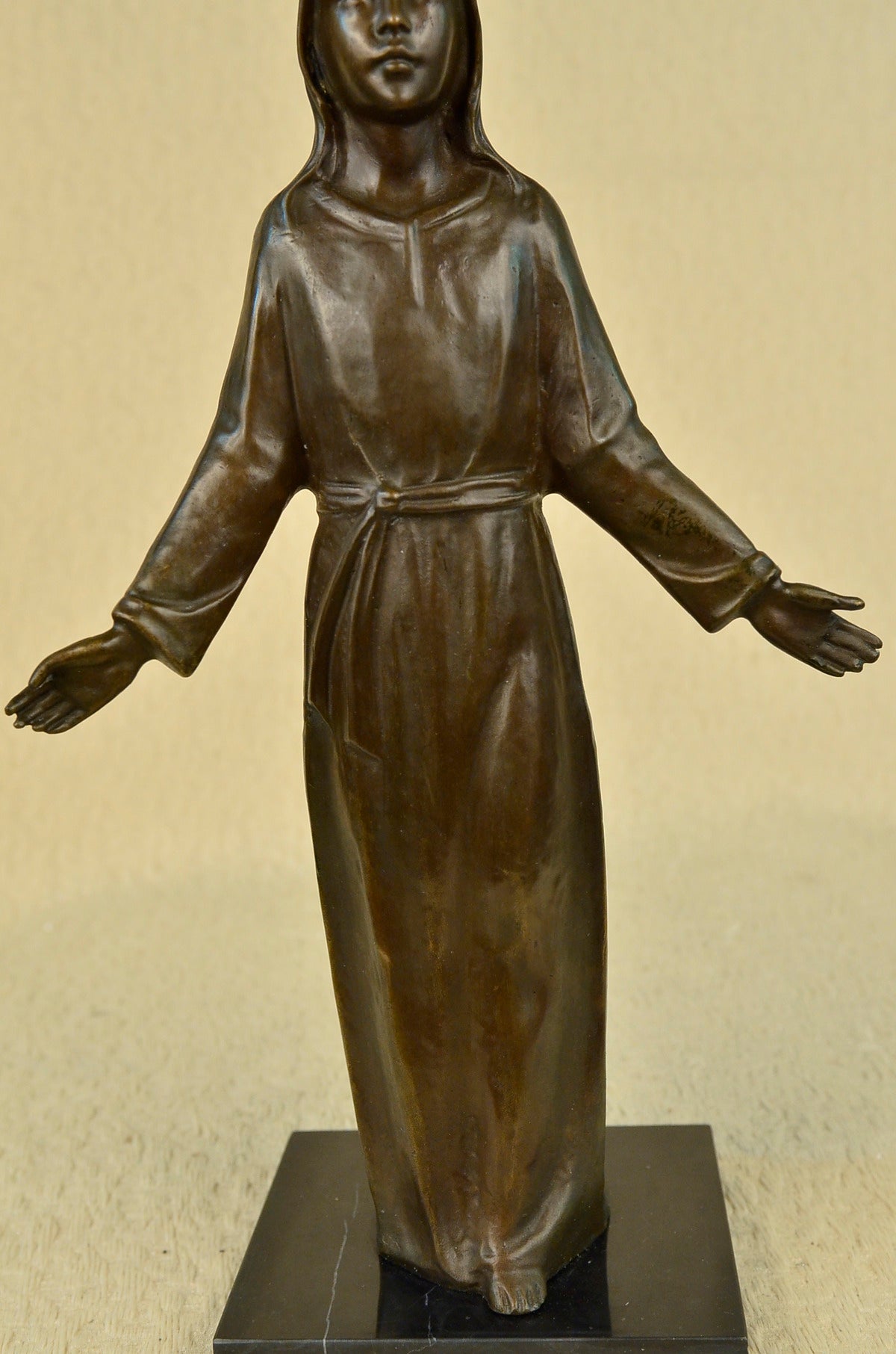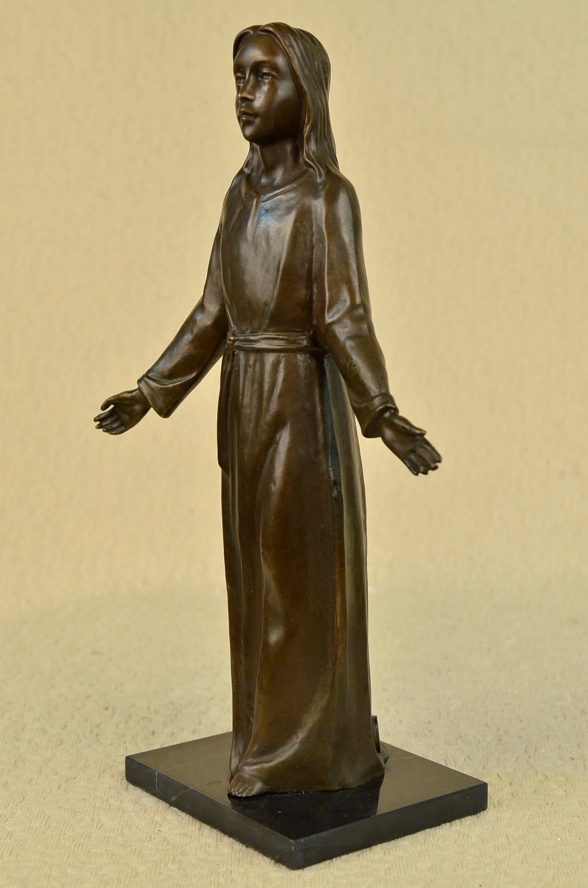 This unique piece is a work of art of a young Jesus is beautiful, his hands are spread to his sides as he gracefully smiles. He wears a full body robe that ties around his waist. His hair is straight down his back, as he stand barefoot he looks up to the sky and prays for all man kind. Thanking his father above for all he has giving us and as well as asking for forgiveness for all who sin before him. This image was molded by using the lost-wax method of casting. This powerful sculpture is finished with brown patina and is mounted upon a black marble base signed by the artist Franz Von Stuck. Stuck was born at Tettenweis, in Bavaria. From an early age he displayed an affinity for drawing and caricature. To begin his artistic education in 1878 he went to Munich, where he would settle for life. From 1881 to 1885 Stuck attended the Munich Academy. He first made a name with cartoons for Fliegende Blätter, and vignette designs for programmes and book decoration. In 1889 he exhibited his first paintings at the Munich Glass Palace, winning a gold medal for The Guardian of Paradise. In 1892 Stuck co-founded the Munich Secession, and also executed his first sculpture, Athlete. The following year he won further acclaim with the critical and public success of what is now his most famous work, The Sin. Also in 1893, Stuck was awarded a gold medal for painting at the Chicago World`s Fair and was appointed to a royal professorship. In 1895 he began teaching painting at the Munich Academy. In 1897 Stuck married an American widow, Mary Lindpainter, and began work designing his own residence and studio, the Villa Stuck. His designs for the villa included everything from layout to interior decorations; for his furniture Stuck received another gold medal at the 1900 Paris World Exposition.Having attained a high degree of fame by this time, Stuck was elevated to the aristocracy on December 9, 1905 and would receive further public honours from around Europe during the remainder of his life. Even as new trends in art left Stuck behind, he continued to be highly respected among young artists in his capacity as professor at the Munich Academy. Notable students of his over the years include Paul Klee, Hans Purrmann, Wassily Kandinsky, and Josef Albers. Franz von Stuck died in 1928; his funeral address memorialized him as "the last prince of art of Munich`s great days". He is buried in the Munich Waldfriedhof next to his wife Mary.Sale$&