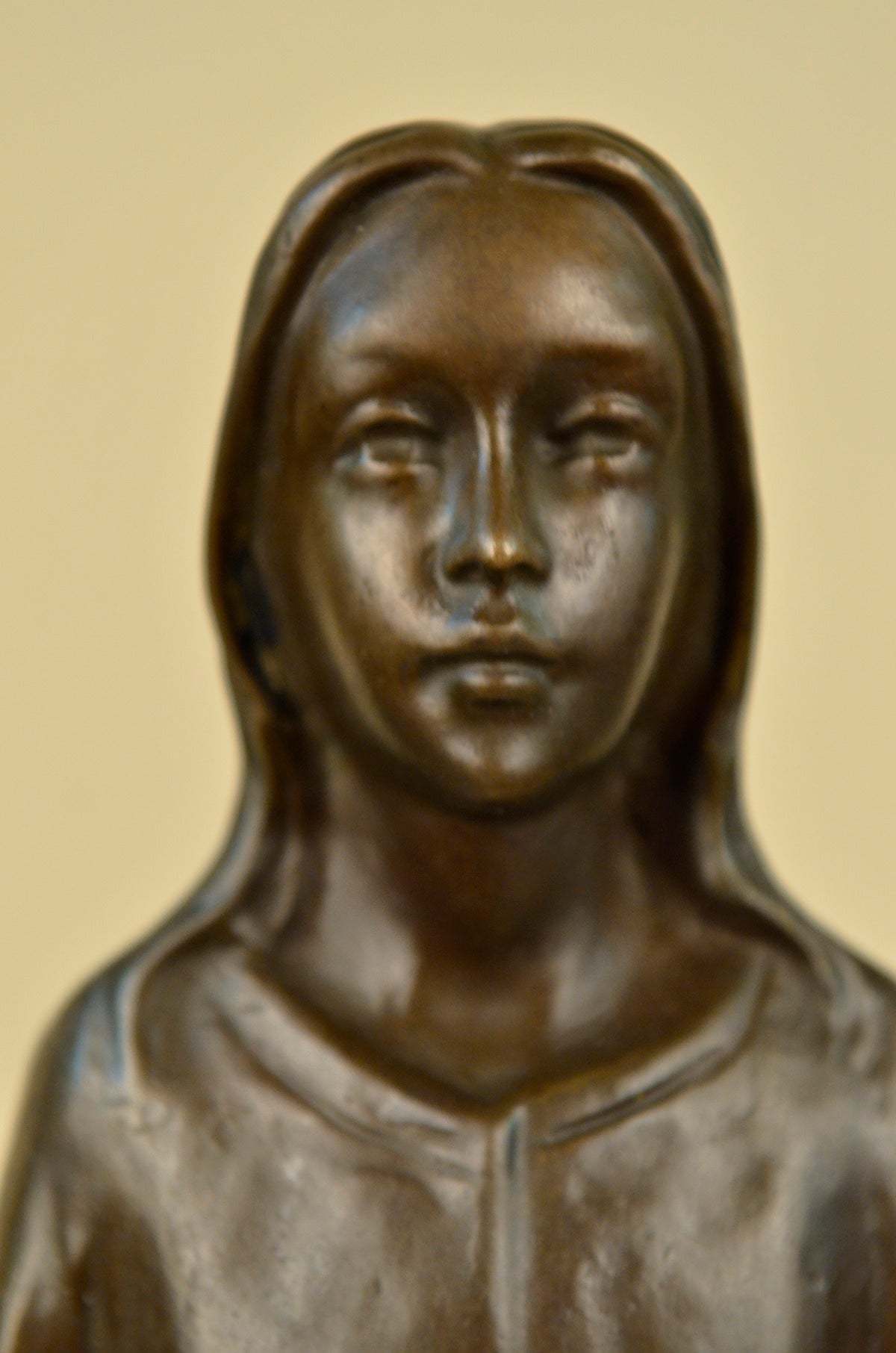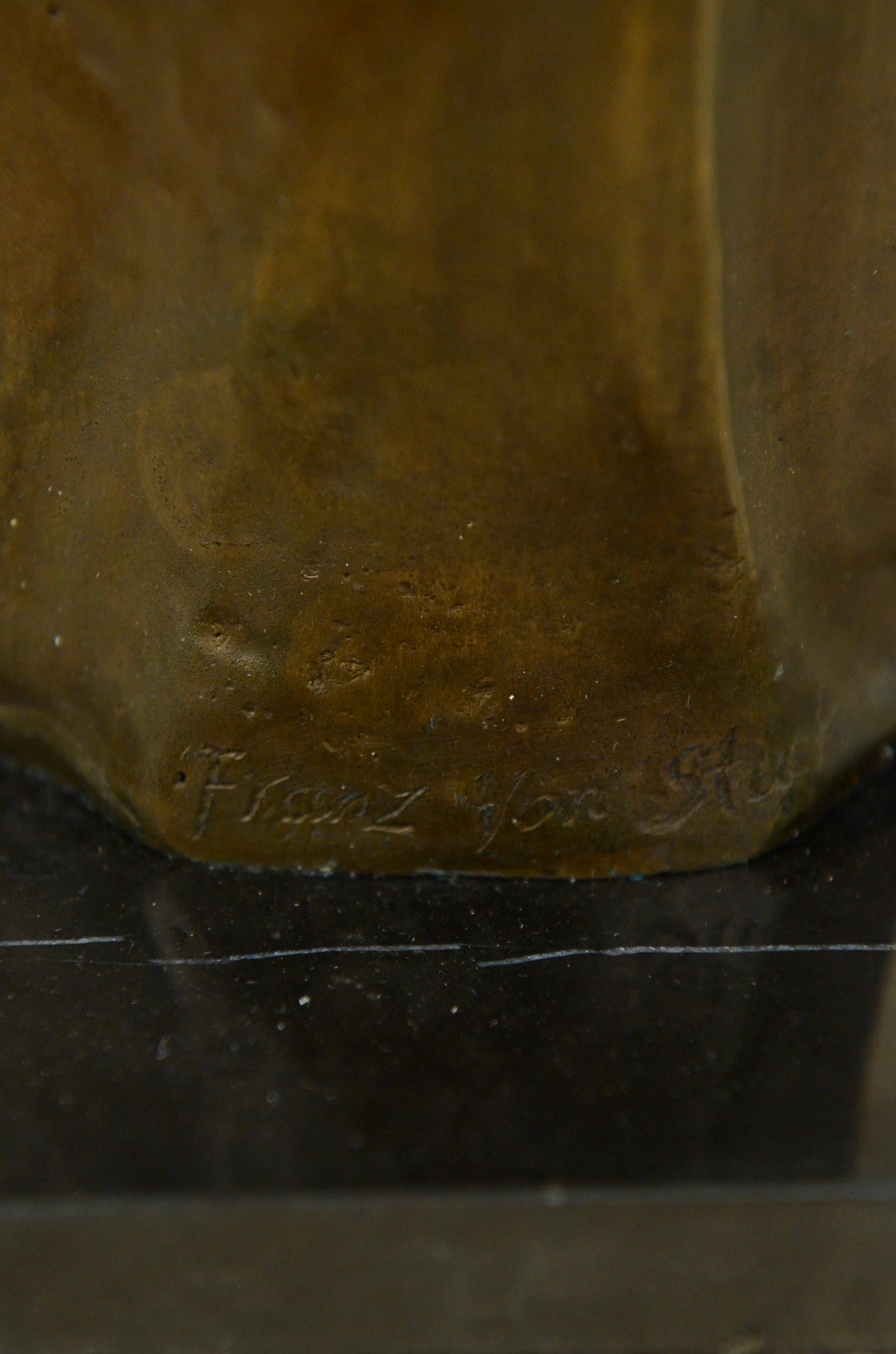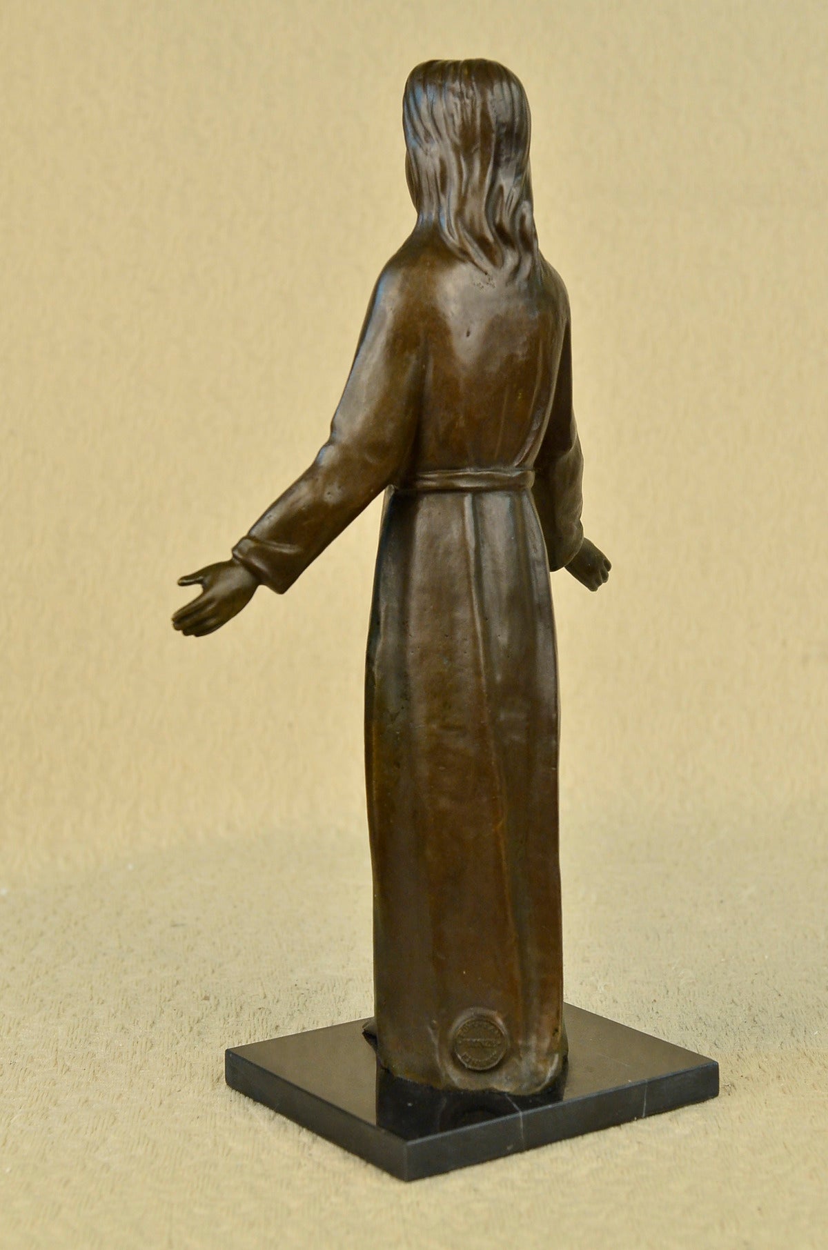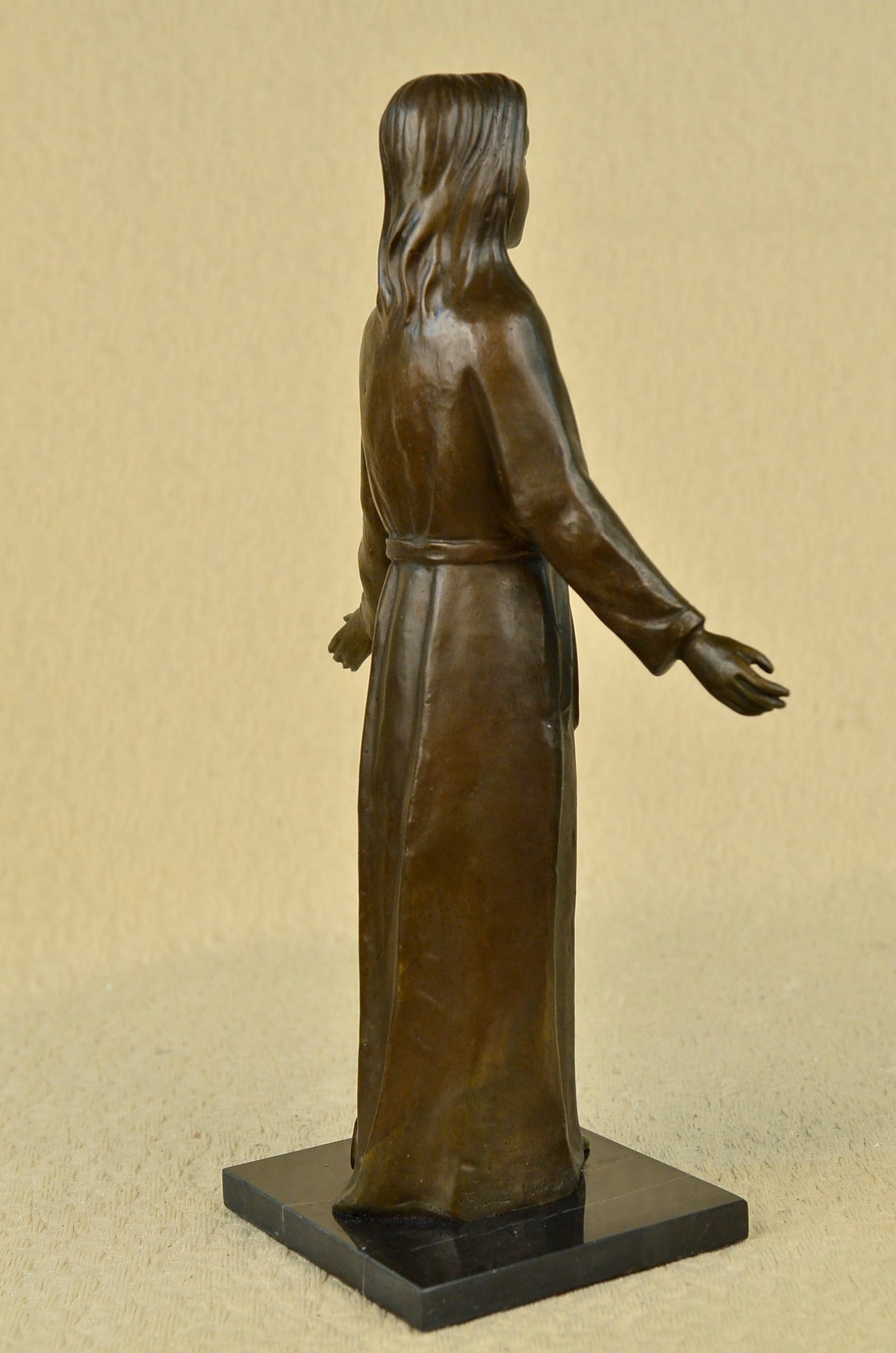 This unique piece is a work of art of a young Jesus is beautiful, his hands are spread to his sides as he gracefully smiles. He wears a full body robe that ties around his waist. His hair is straight down his back, as he stand barefoot he looks up to the sky and prays for all man kind. Thanking his father above for all he has giving us and as well as asking for forgiveness for all who sin before him. This image was molded by using the lost-wax method of casting. This powerful sculpture is finished with brown patina and is mounted upon a black marble base signed by the artist Franz Von Stuck. Stuck was born at Tettenweis, in Bavaria. From an early age he displayed an affinity for drawing and caricature. To begin his artistic education in 1878 he went to Munich, where he would settle for life. From 1881 to 1885 Stuck attended the Munich Academy. He first made a name with cartoons for Fliegende Blätter, and vignette designs for programmes and book decoration. In 1889 he exhibited his first paintings at the Munich Glass Palace, winning a gold medal for The Guardian of Paradise. In 1892 Stuck co-founded the Munich Secession, and also executed his first sculpture, Athlete. The following year he won further acclaim with the critical and public success of what is now his most famous work, The Sin. Also in 1893, Stuck was awarded a gold medal for painting at the Chicago World`s Fair and was appointed to a royal professorship. In 1895 he began teaching painting at the Munich Academy. In 1897 Stuck married an American widow, Mary Lindpainter, and began work designing his own residence and studio, the Villa Stuck. His designs for the villa included everything from layout to interior decorations; for his furniture Stuck received another gold medal at the 1900 Paris World Exposition.Having attained a high degree of fame by this time, Stuck was elevated to the aristocracy on December 9, 1905 and would receive further public honours from around Europe during the remainder of his life. Even as new trends in art left Stuck behind, he continued to be highly respected among young artists in his capacity as professor at the Munich Academy. Notable students of his over the years include Paul Klee, Hans Purrmann, Wassily Kandinsky, and Josef Albers. Franz von Stuck died in 1928; his funeral address memorialized him as "the last prince of art of Munich`s great days". He is buried in the Munich Waldfriedhof next to his wife Mary.Sale$&