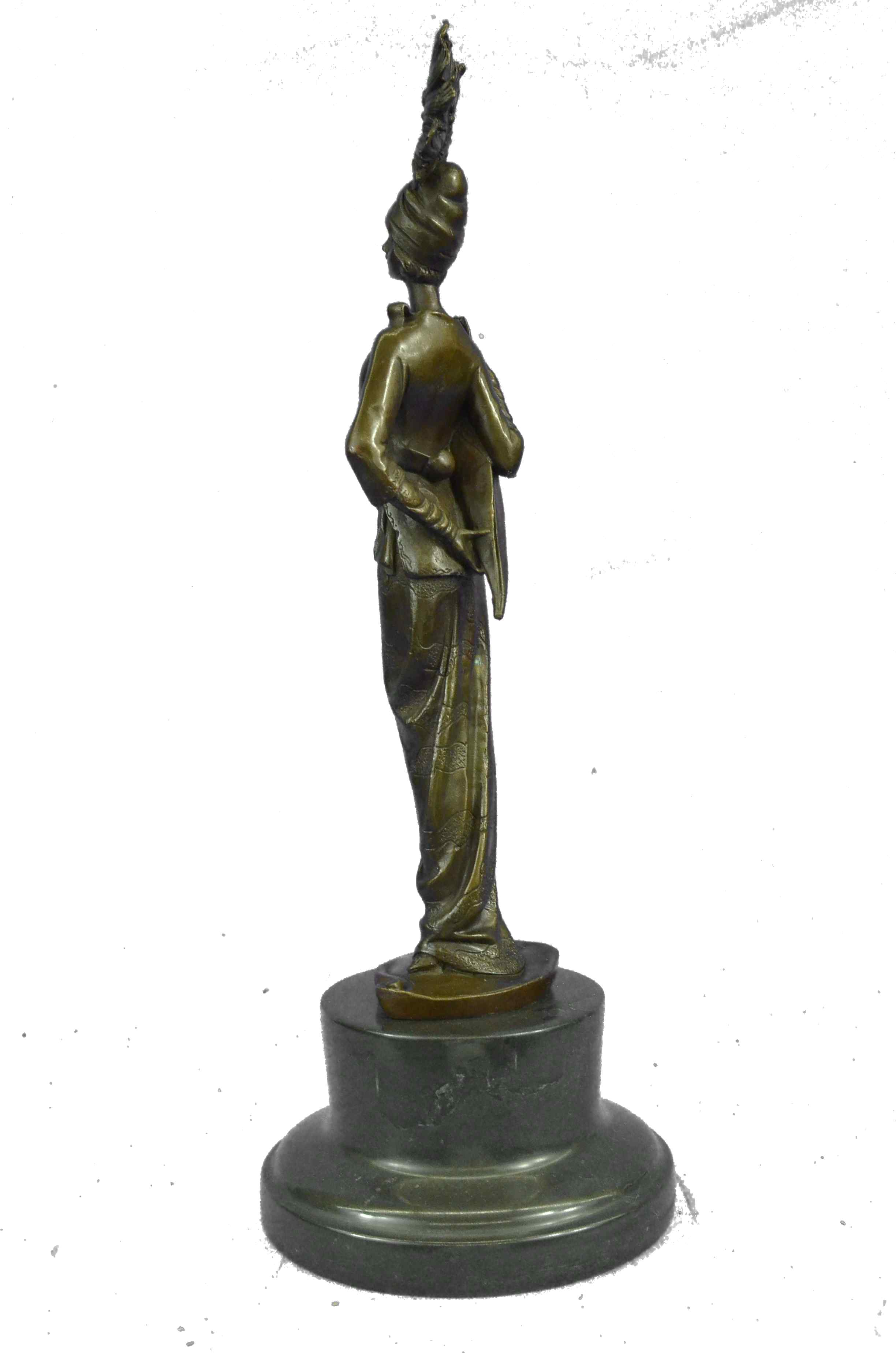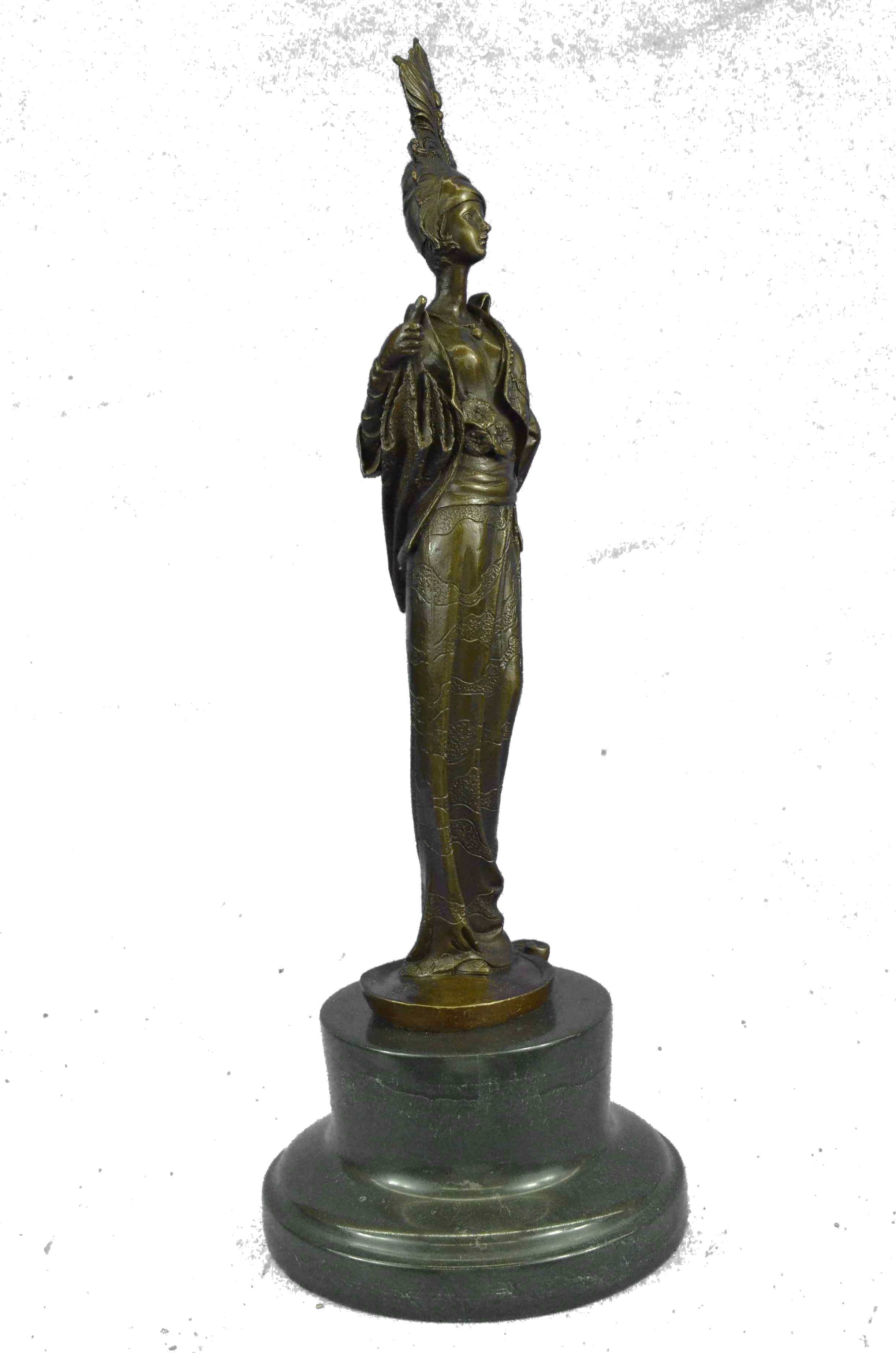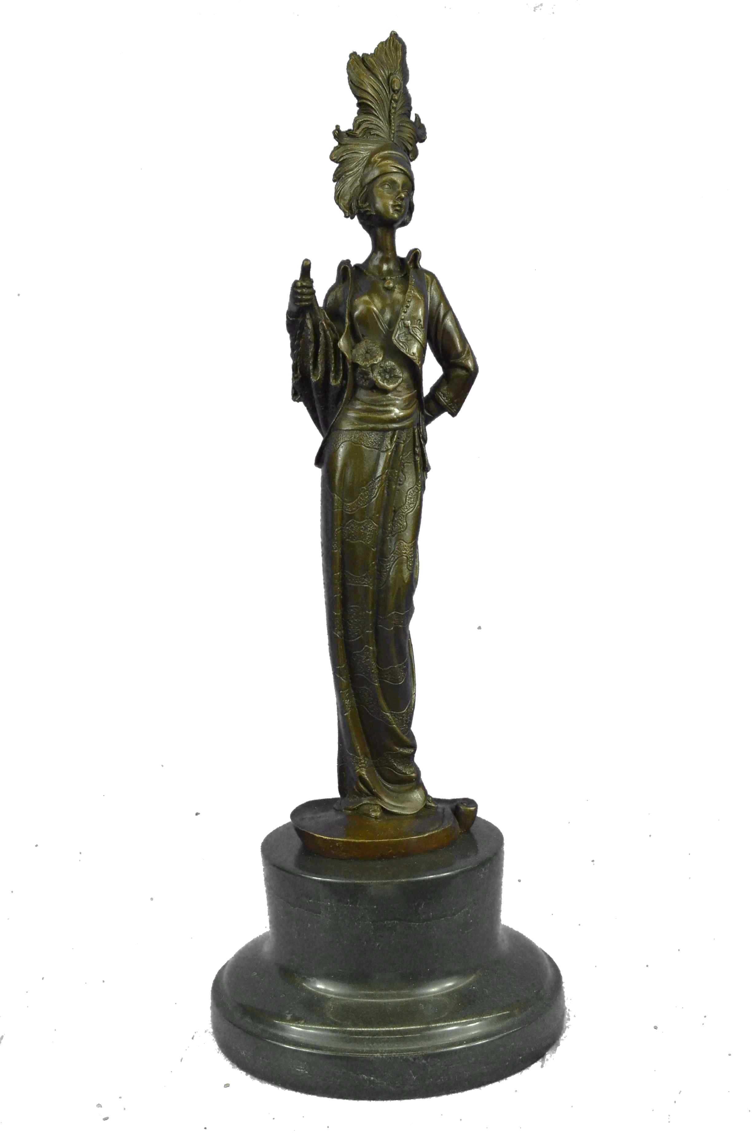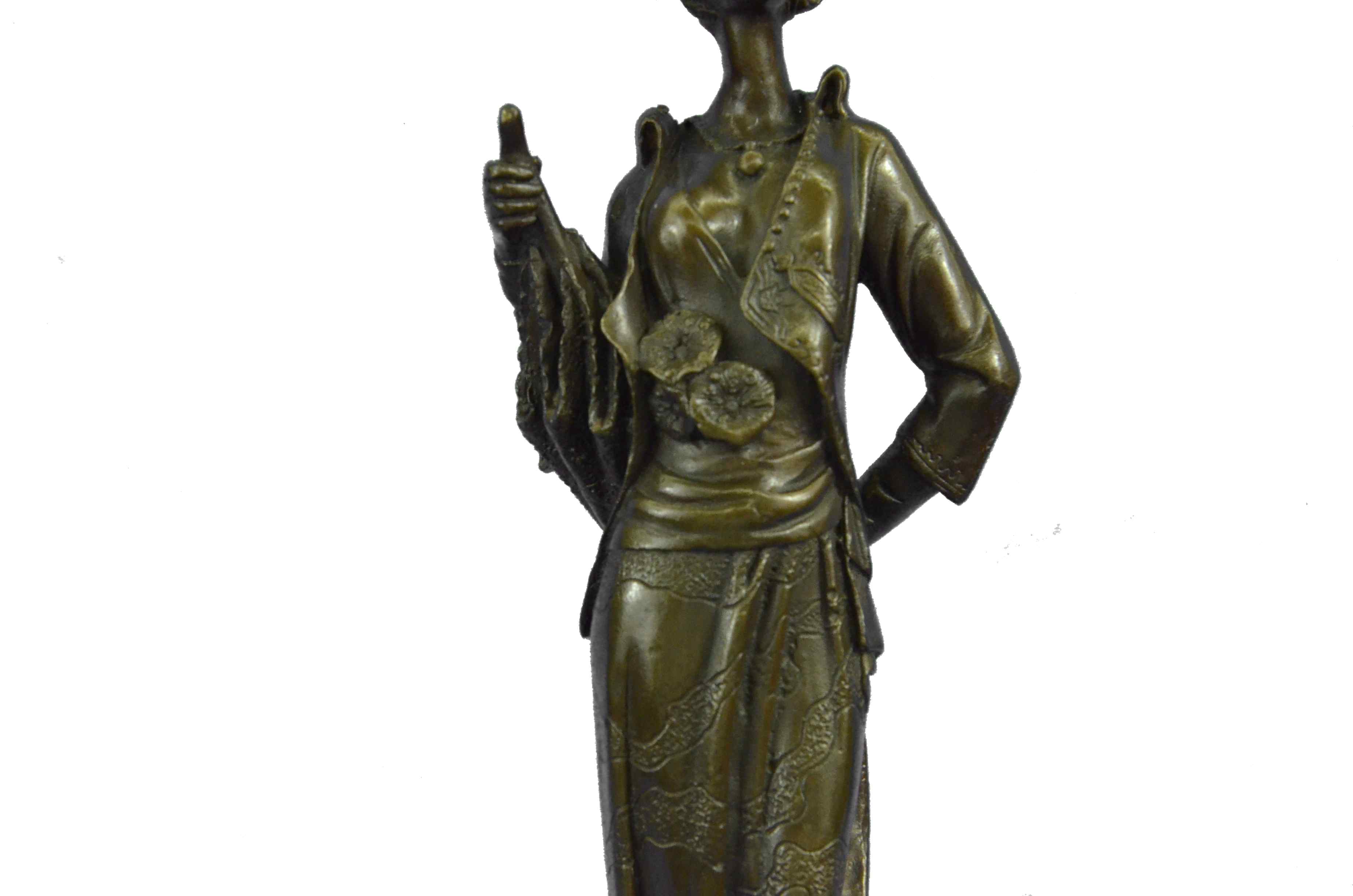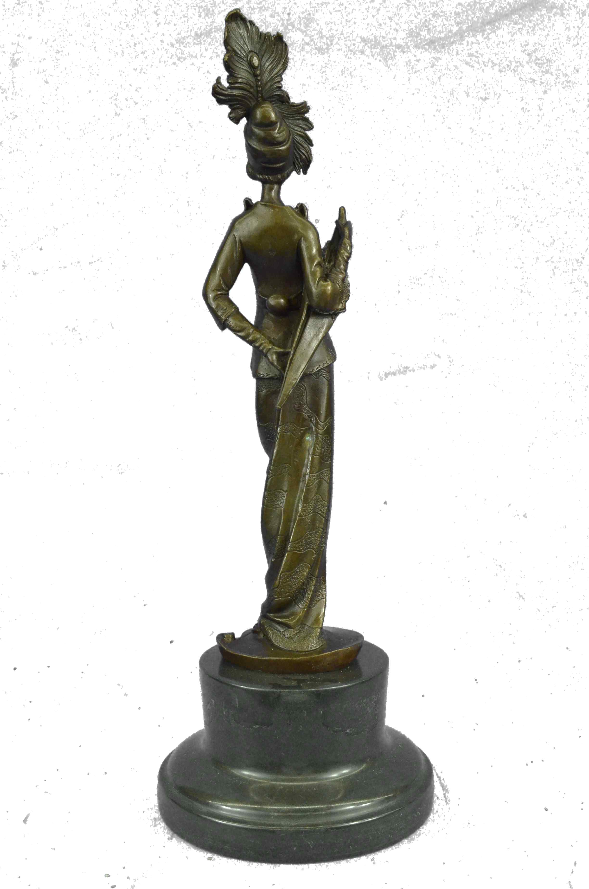 This unique sculpture of a 1920`s woman is a beautiful piece for an exquisite living room or a young lady`s bedroom. As she stands elegantly for her photo-shoot, who can forget to mention her unforgettable dress that drops all the way to the floor, while she holds an umbrella under her right arm. The details on her neck-less,waist belt, over coat, and her Charleston hat, are unbelievably carved leaving her picture perfected. This is a beautiful bronze sculpture cast using the "Lost Wax Method" and has a gorgeous brown patina. It is mounted on a marble base and is 100% bronze and handmade. This sculpture is signed by the artist Milo.Bronze Dimensions with Marble Base:Height 18" x Width 6"