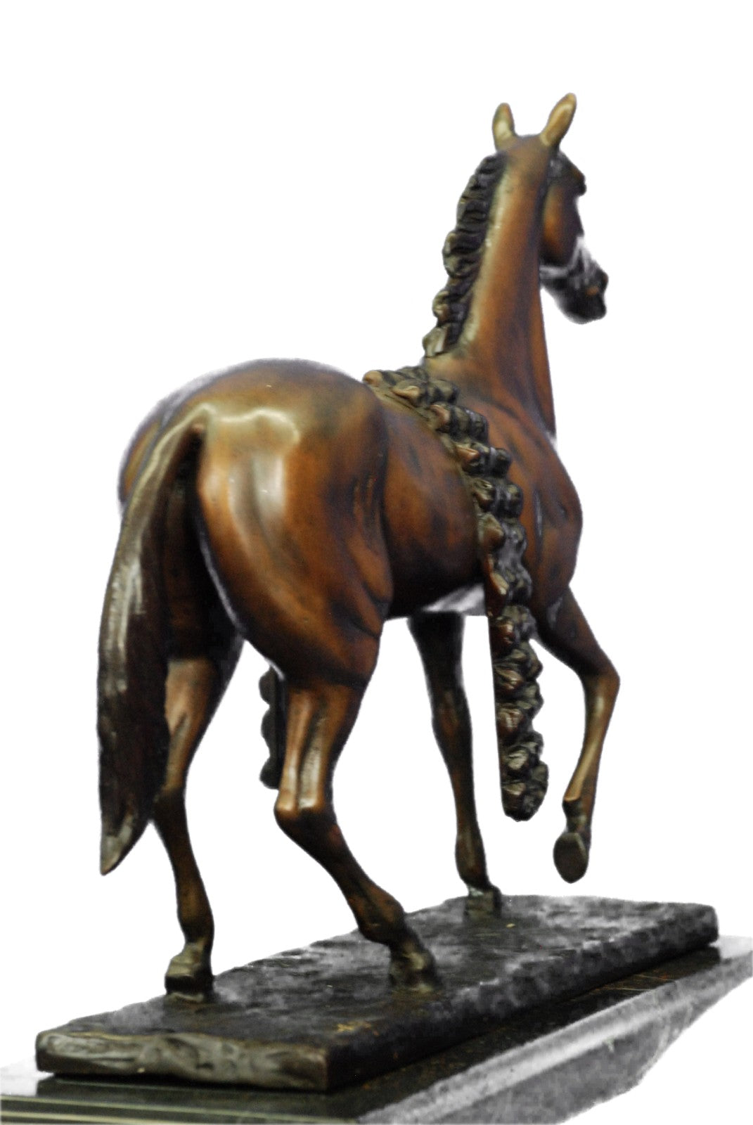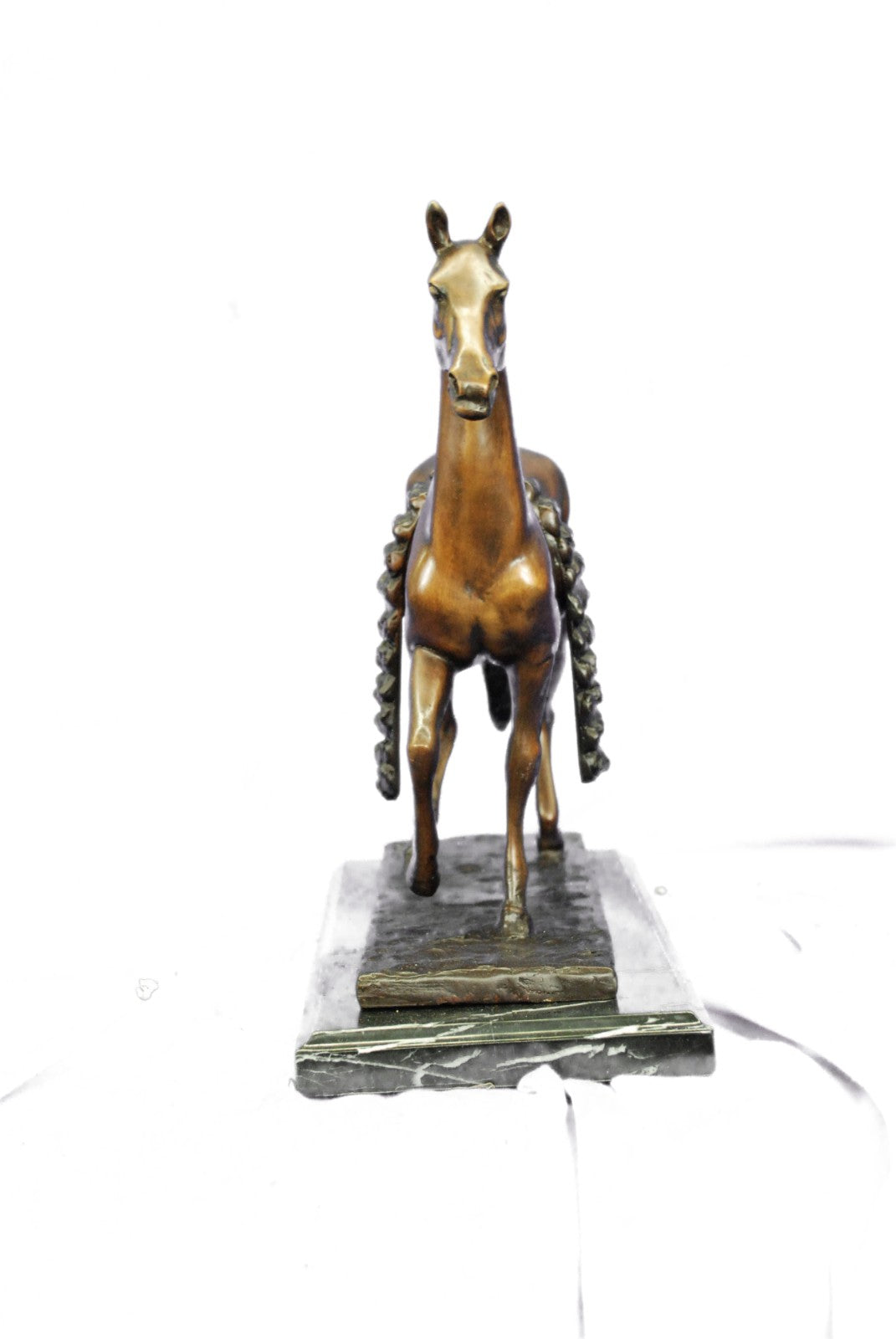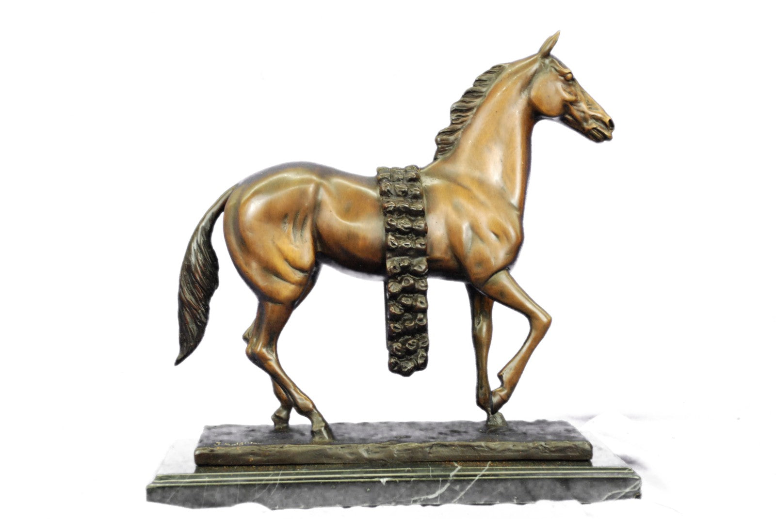 The horse comes across in its natural and free state. With a jerk of the head and a cock of an ear, he notices the viewer, and continues to trot along without the burden of a weight on it's back. Serving man in war, mobility, productivity, agriculture, development of all kinds, the horse is by far one of the largest contributor to the enhancement of our civilization. With such recognition and accomplishments, a vast and diverse trail of symbol meanings is sure to follow the horse’s rich history with humankind. Some that are seen in this sculpture are power, grace, beauty, nobility, strength and freedom. The sculpture was cast using the age-old method of lost-wax casting and stained with a brown patina finish for perpetuation. He is mounted upon a bronze plinth and is signed J.Moigniez.Bronze Dimensions with Marble Base:Height 14" x Width 14"
