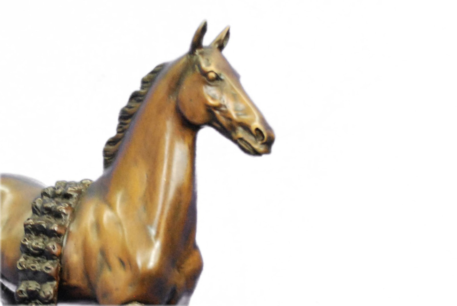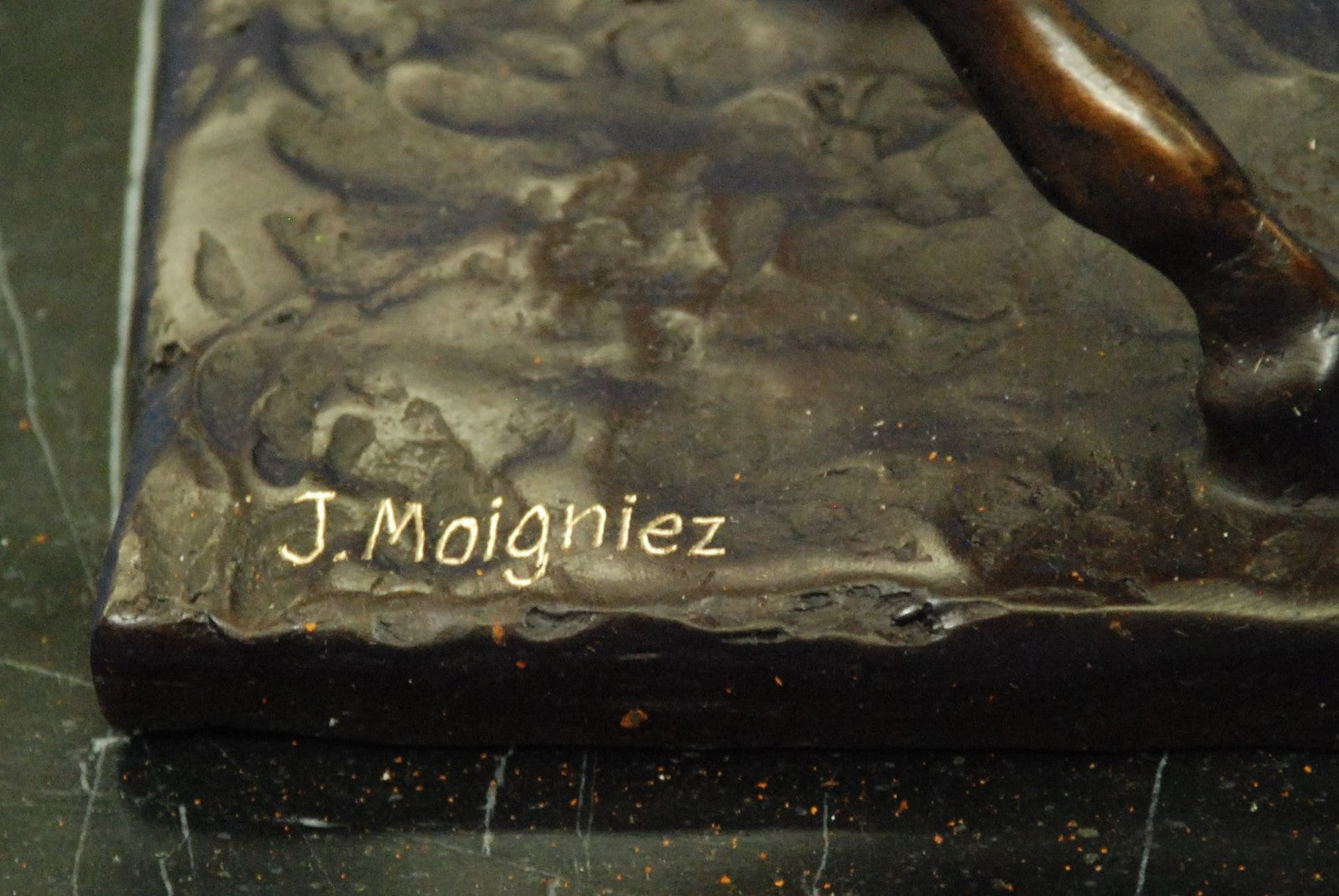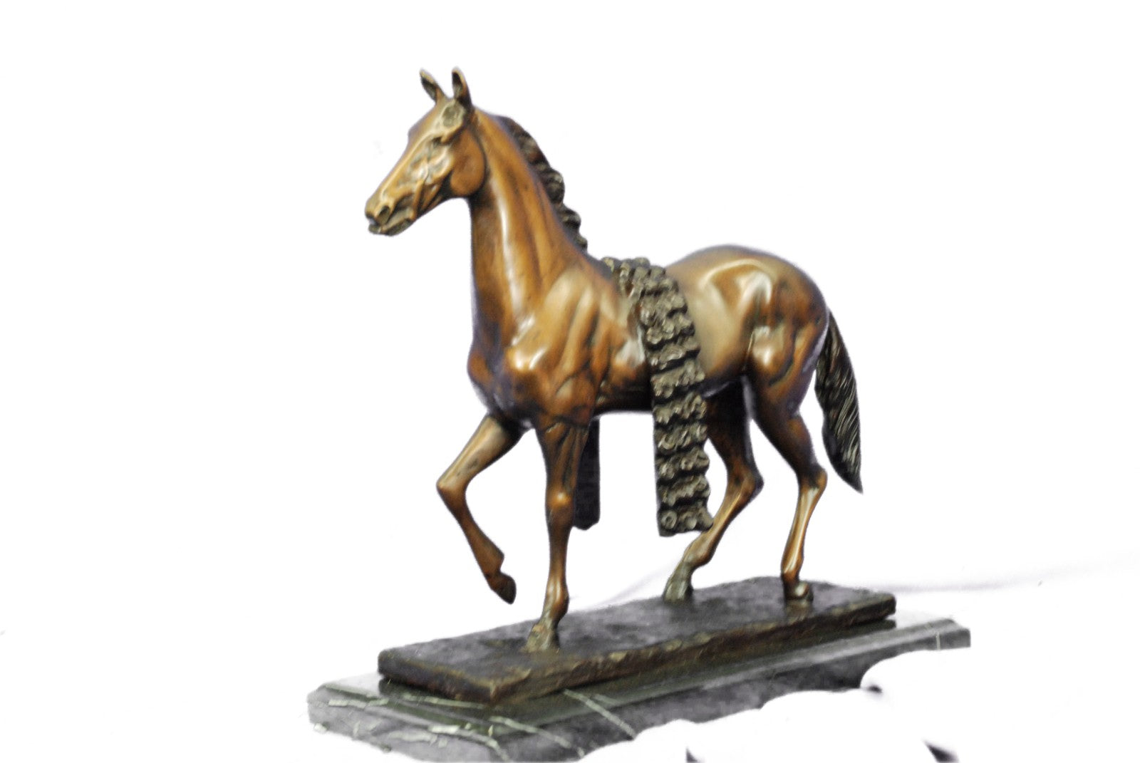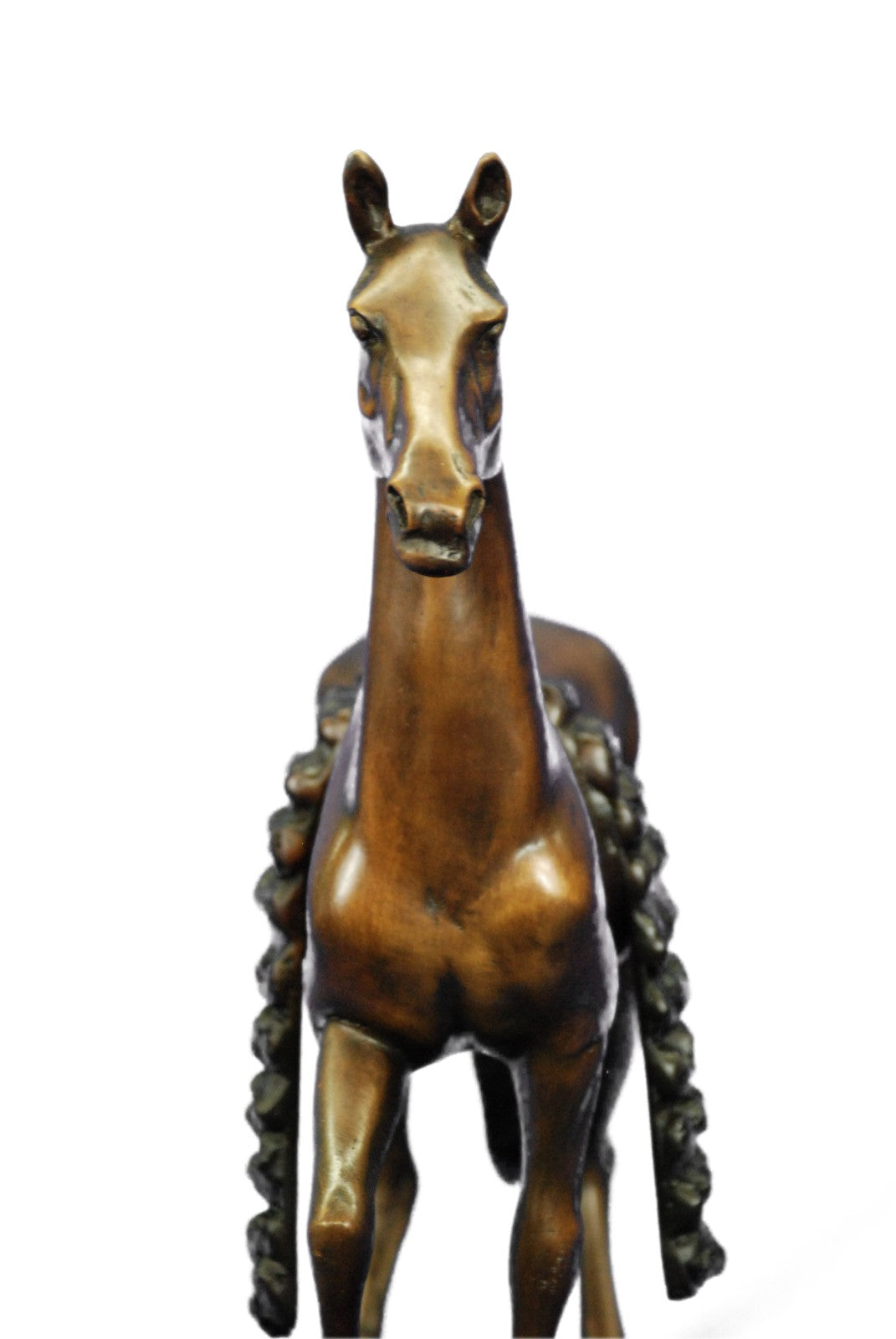 The horse comes across in its natural and free state. With a jerk of the head and a cock of an ear, he notices the viewer, and continues to trot along without the burden of a weight on it's back. Serving man in war, mobility, productivity, agriculture, development of all kinds, the horse is by far one of the largest contributor to the enhancement of our civilization. With such recognition and accomplishments, a vast and diverse trail of symbol meanings is sure to follow the horse’s rich history with humankind. Some that are seen in this sculpture are power, grace, beauty, nobility, strength and freedom. The sculpture was cast using the age-old method of lost-wax casting and stained with a brown patina finish for perpetuation. He is mounted upon a bronze plinth and is signed J.Moigniez.Bronze Dimensions with Marble Base:Height 14" x Width 14"