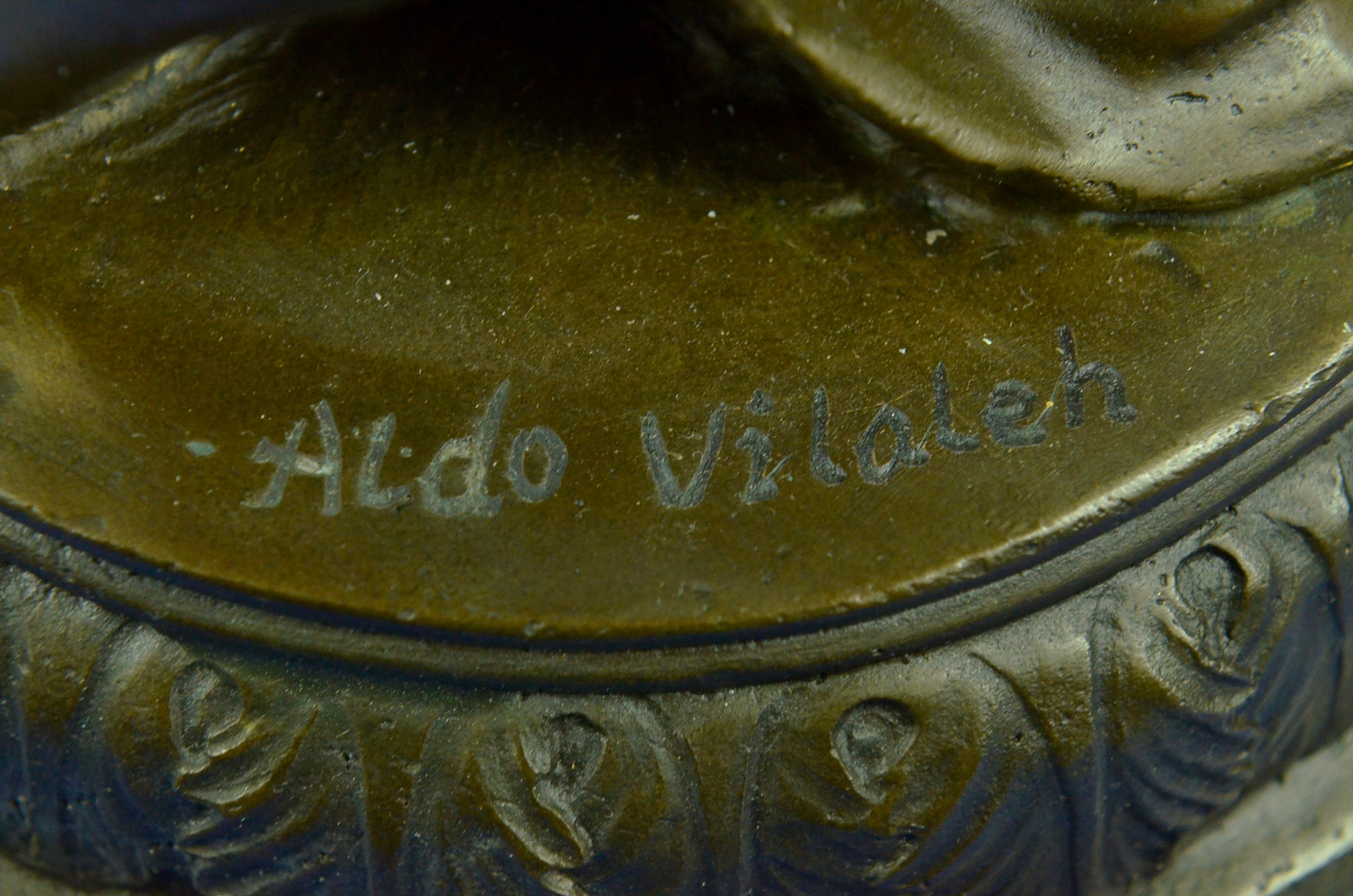 Superb Bronze Statuette of Fortuna-Tyche. Roman Empire, c. 1st Century AD. The standing Roman goddess of "Fortune" and the Greek goddess and protector of Cities, "Tyche", wearing chiton and himation, a diadem in her bound hair, holding a Cornucopiain her right hand, her eyes with silvered corneas and pupils recessed for inlay. In choice preservation, with mostly dark brown patina. Height: 32"; on custom base. A delightful work of art -- the modeling sure and elegant, the incised details neat. . It features the lost wax method of casting, founded thousands of years ago, ensuring an exquisitely detailed sculpture that will add grace and beauty to your business or home and is signed by artist Aldo Vitaleh.Original or Reproduction: Original