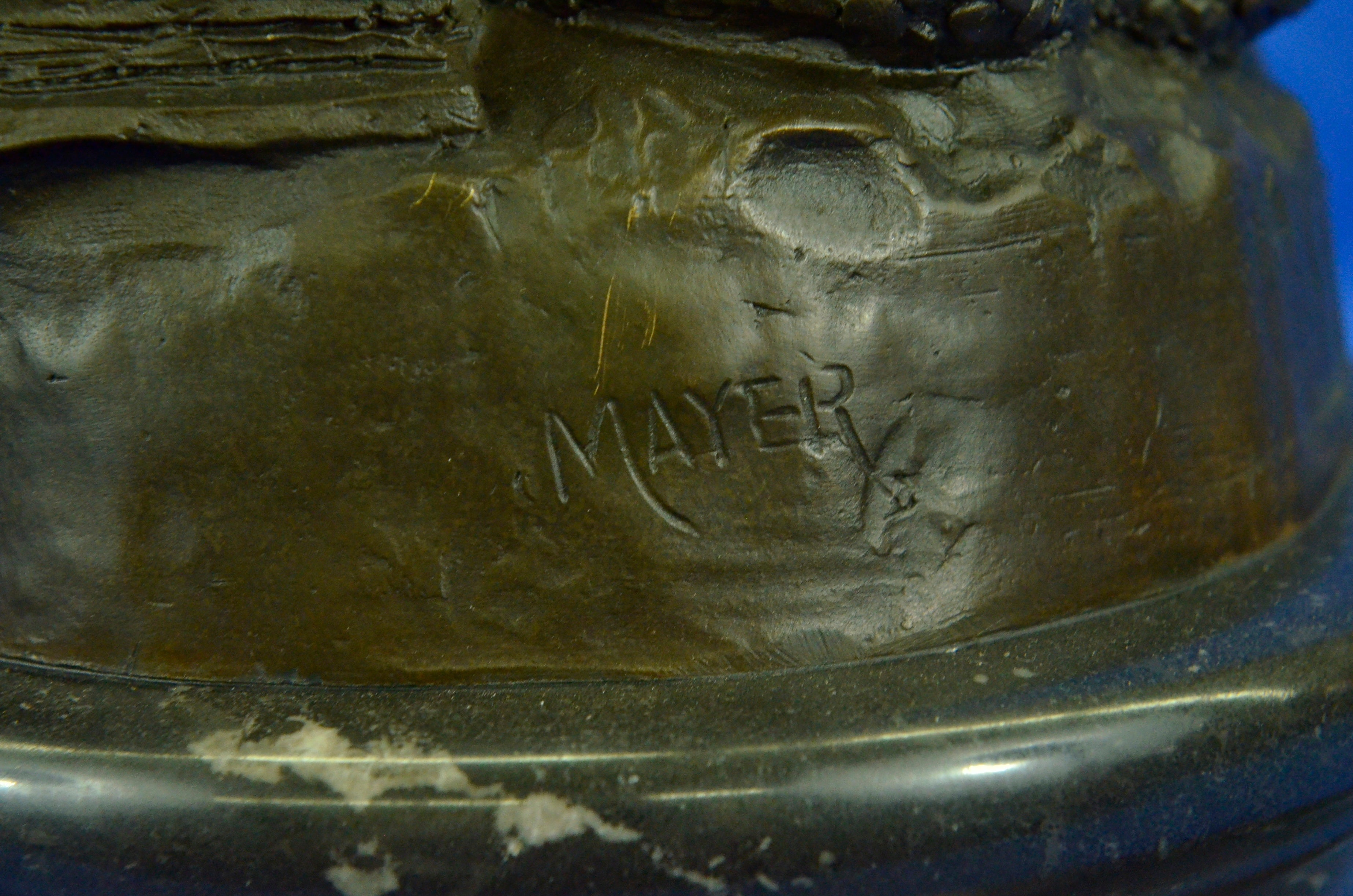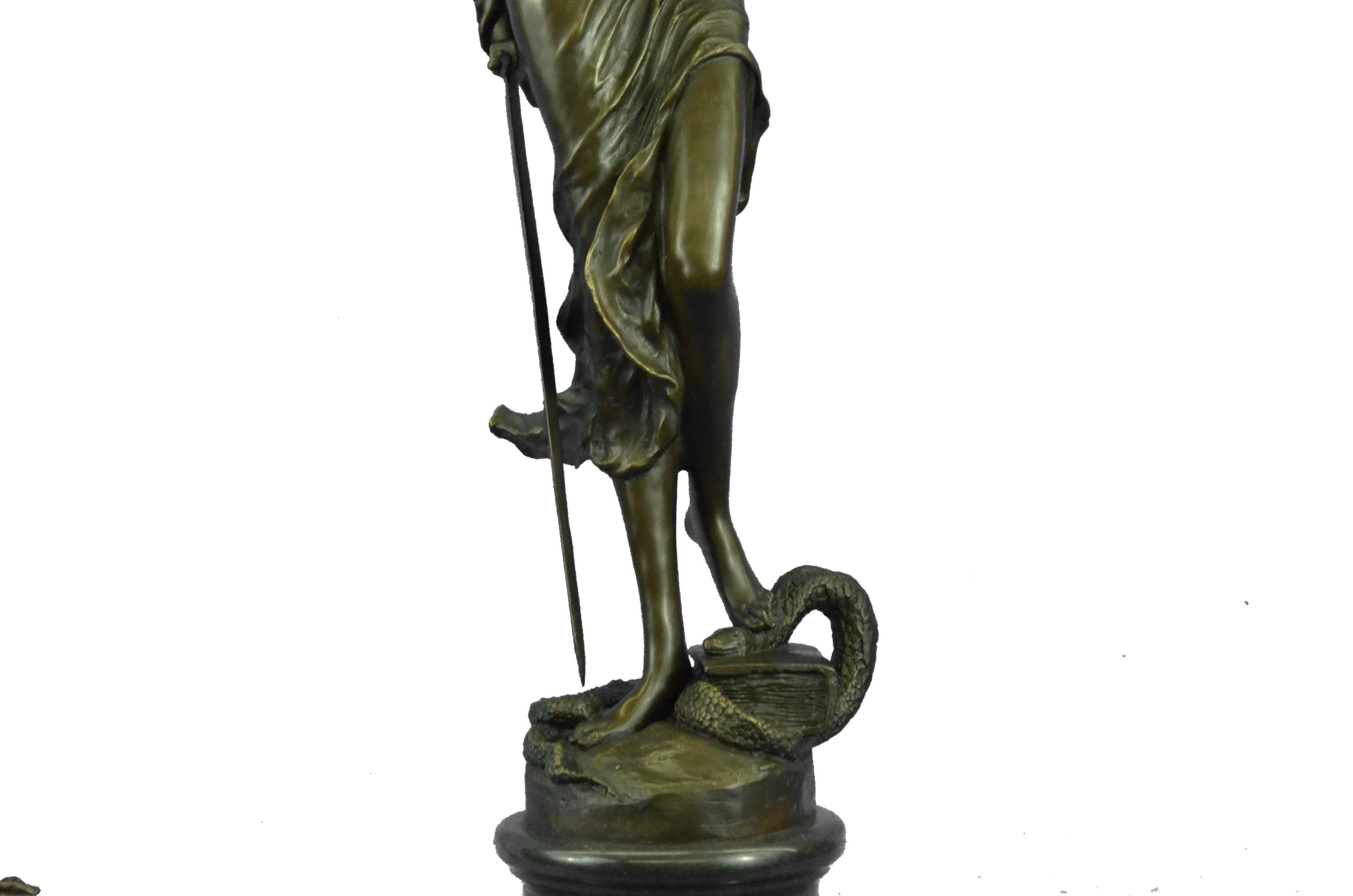 The bronze sculpture is of Lady Justice (Roman goddess of Justice) who is the symbolic personification of the moral force in judicial systems. As anciently depicted, the blindfolded Lady Justice, is seen balancing the scales of truth and fairness from her left hand, holding a sword, while stepping on a book and a snake that coils around her feet. The scales, represent truth and fairness and measures the strength of a case`s support and opposition. The blindfold, represents objectivity, in that justice is (or should be) meted out objectively without biases. The sword, symbolizes the power of reason and justice, which may be wielded either for or against any party. The book represents history; signifying to stand against wrongdoings or with the good doings of the past. The snake symbolizes hatred hence the foot that stops it from getting its grip. She was captured using the age-old method of lost-wax casting and stained with a brown patina finish. She is mounted upon a black marble base and is signed Mayer.Bronze Dimensions with Marble Base:Height 39" x Width 18"