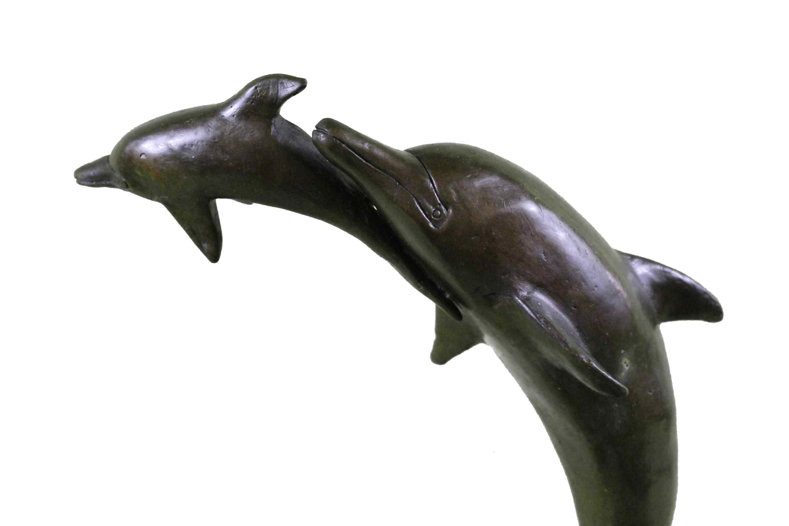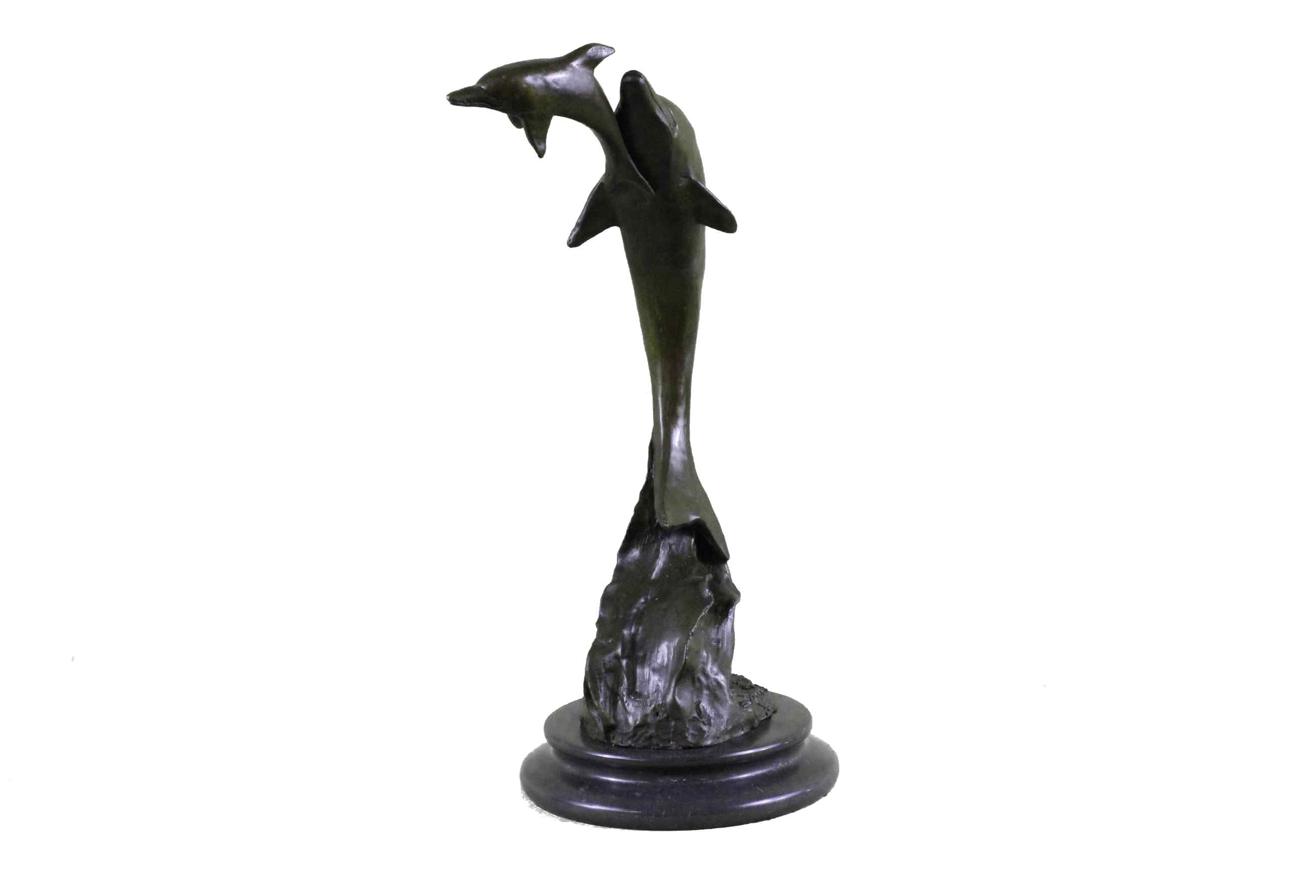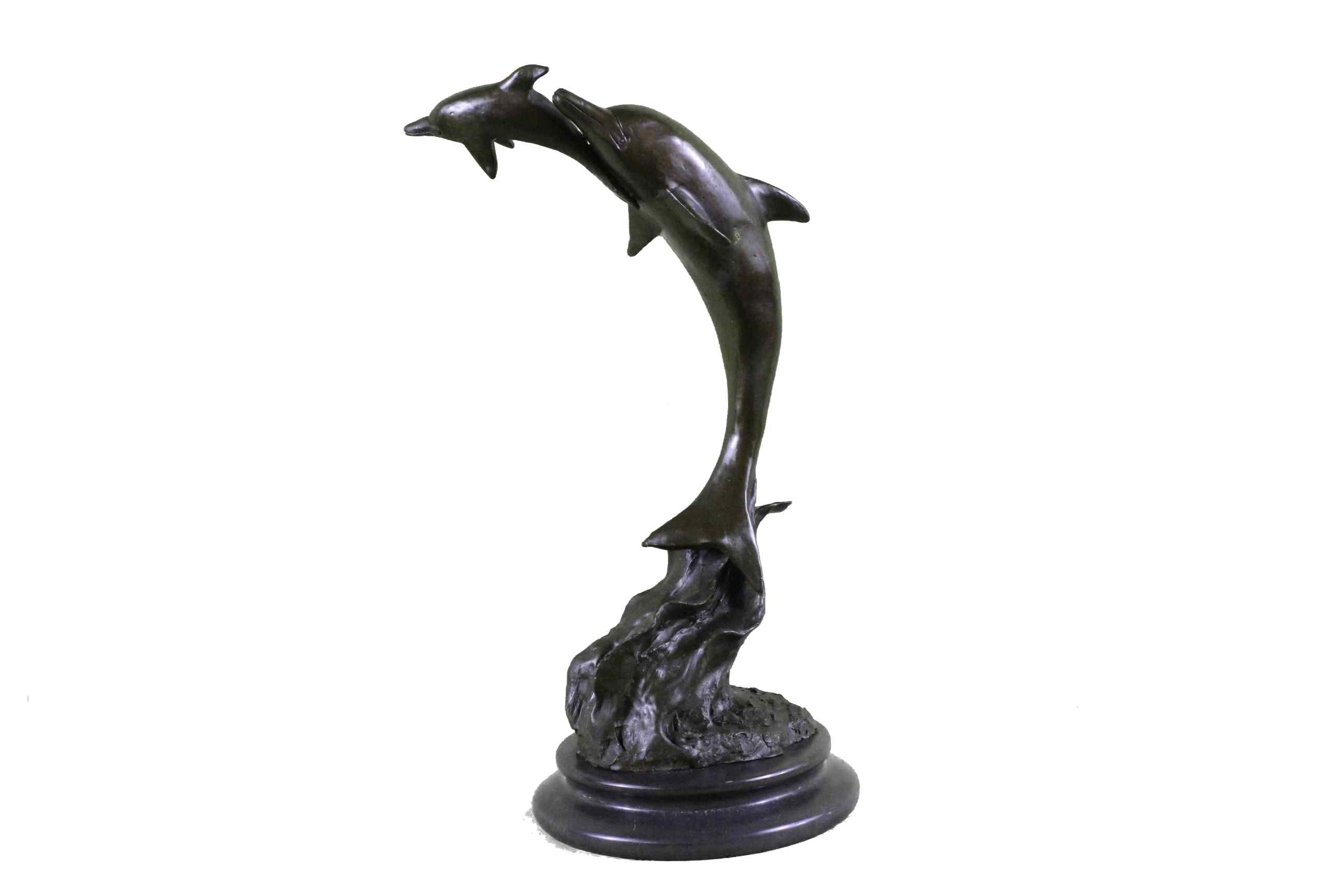Dolphins are among the most intelligent animals, and their often friendly appearance and seemingly playful attitude have made them popular in human culture. This piece of art is one of a kind and will go just about right in every room of your or a friends house. These beautiful animals are the cutest things you will ever meet, so why not own a gorgeous piece like this one. Watch as the Mama Dolphin plays with her Baby throwing him in the air to teach him how to jump up high in and out the water. This sculpture was cast using the “Lost Wax Method” and is mounted on a gorgeous heavy marble base with a delightful bronze trim around the base. This sculpture is signed F. Pautrot.Original or Reproduction: Reproduction