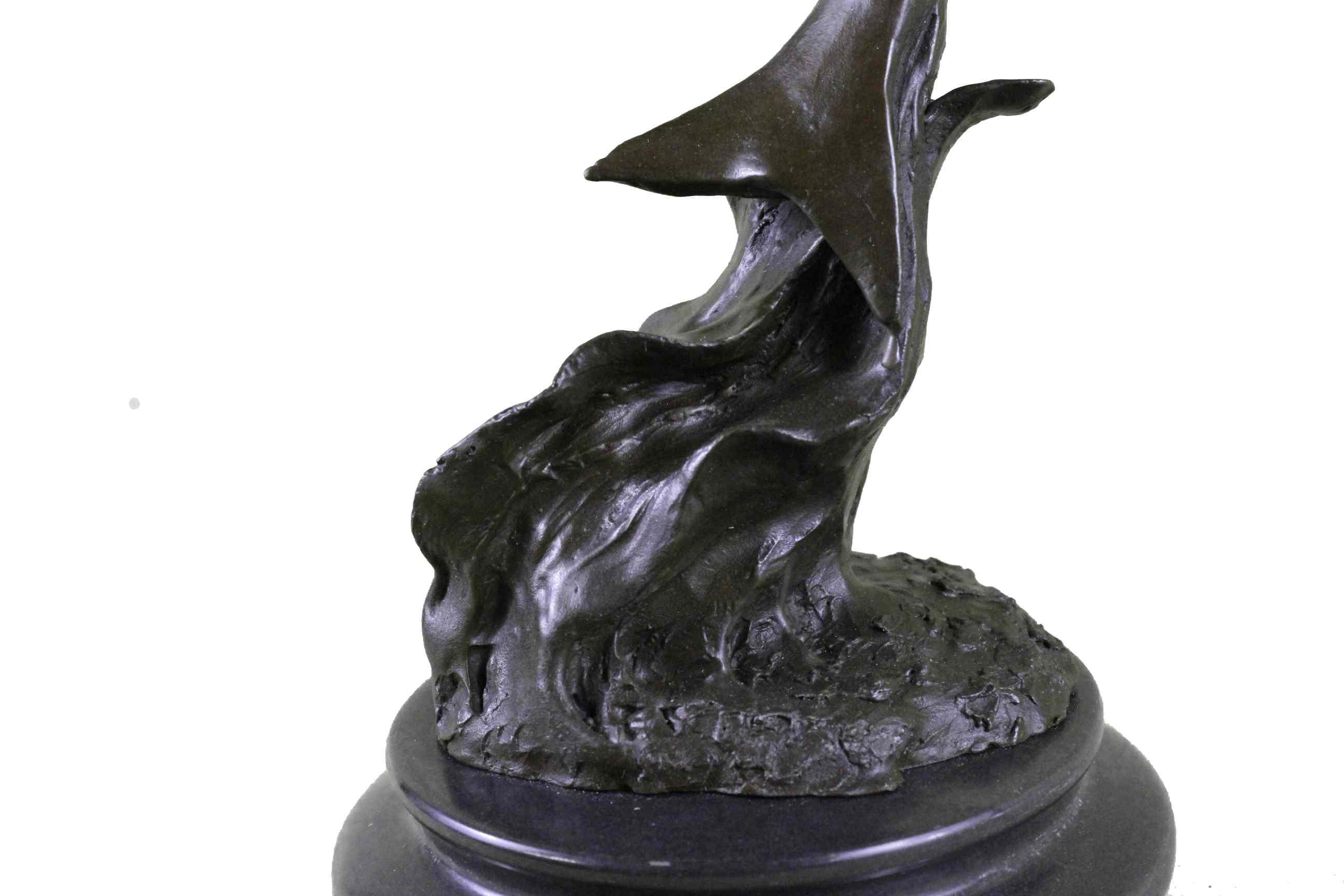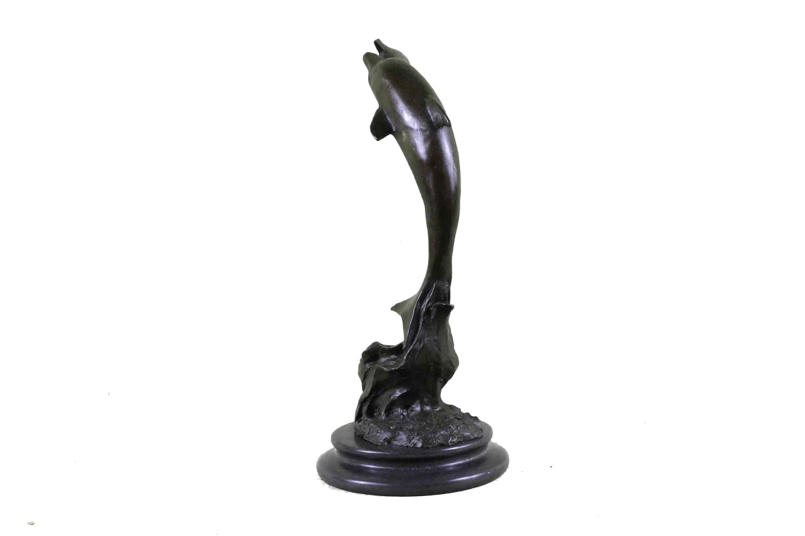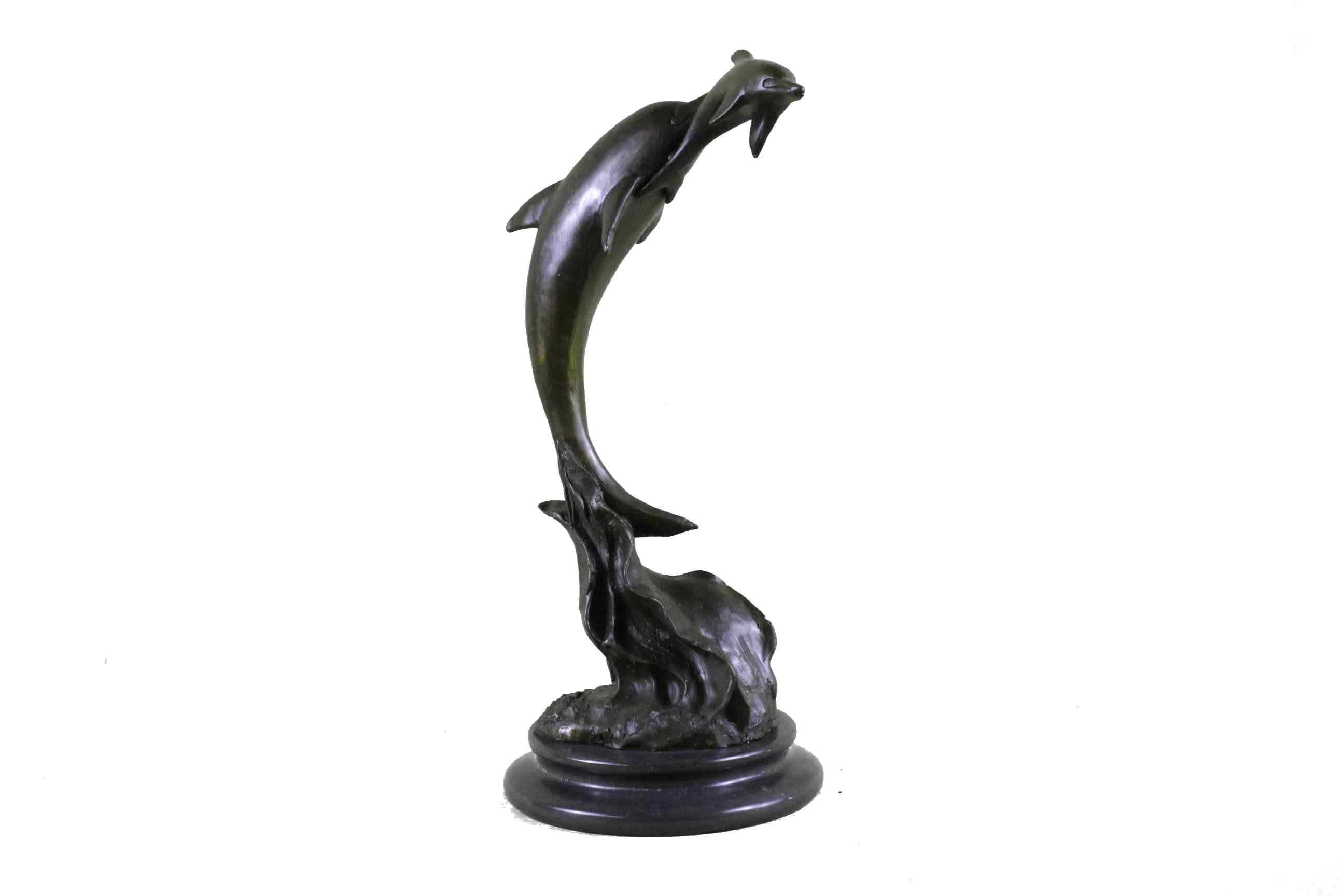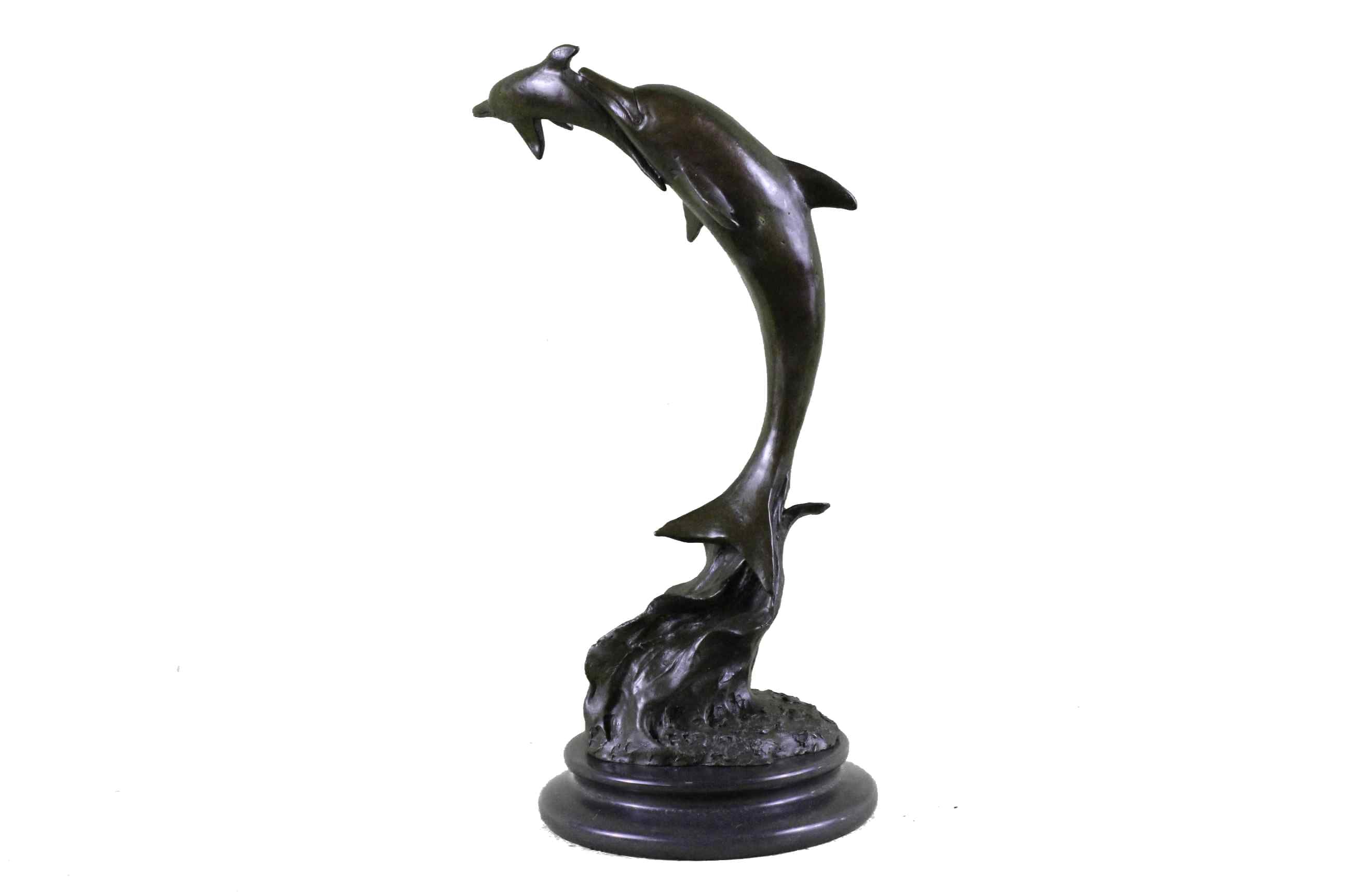 Dolphins are among the most intelligent animals, and their often friendly appearance and seemingly playful attitude have made them popular in human culture. This piece of art is one of a kind and will go just about right in every room of your or a friends house. These beautiful animals are the cutest things you will ever meet, so why not own a gorgeous piece like this one. Watch as the Mama Dolphin plays with her Baby throwing him in the air to teach him how to jump up high in and out the water. This sculpture was cast using the “Lost Wax Method” and is mounted on a gorgeous heavy marble base with a delightful bronze trim around the base. This sculpture is signed F. Pautrot.Original or Reproduction: Reproduction