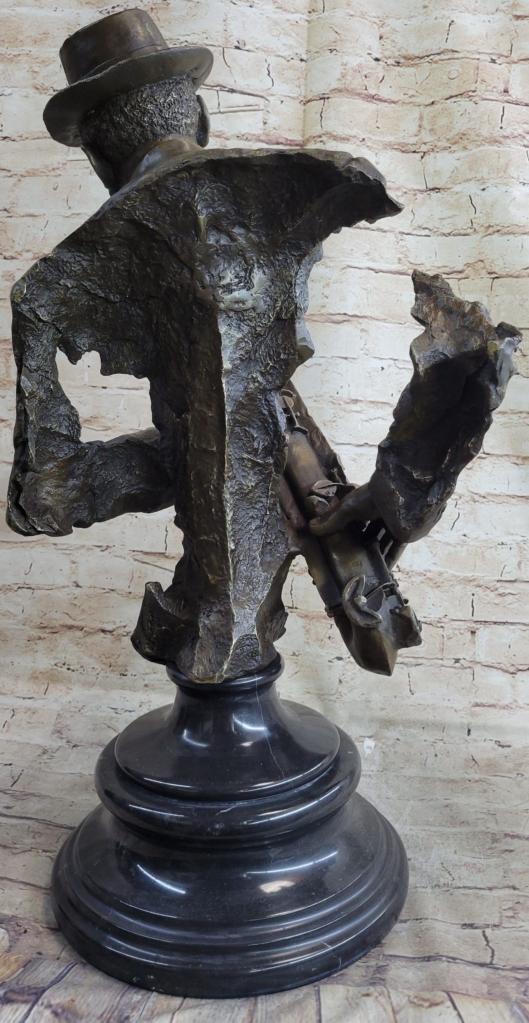 Adorned with a rich brown patina finish that highlights the intricacies of its design, this magnificent figurine exudes a sense of timeless elegance and sophistication, reflecting the enduring legacy and cultural significance of the jazz tradition. Mounted upon a sturdy bronze plinth that gracefully rests atop a sleek black marble base, this exquisite piece serves as a captivating focal point, infusing any room with a vibrant sense of musicality and artistic expression. Bearing the unmistakable signature artist , this masterful creation stands as a timeless testament to the enduring power of music and the profound impact of its melodic influence within the realm of artistic expression.Bronze Dimensions with Marble Base: Height 25" X Width 13"