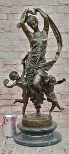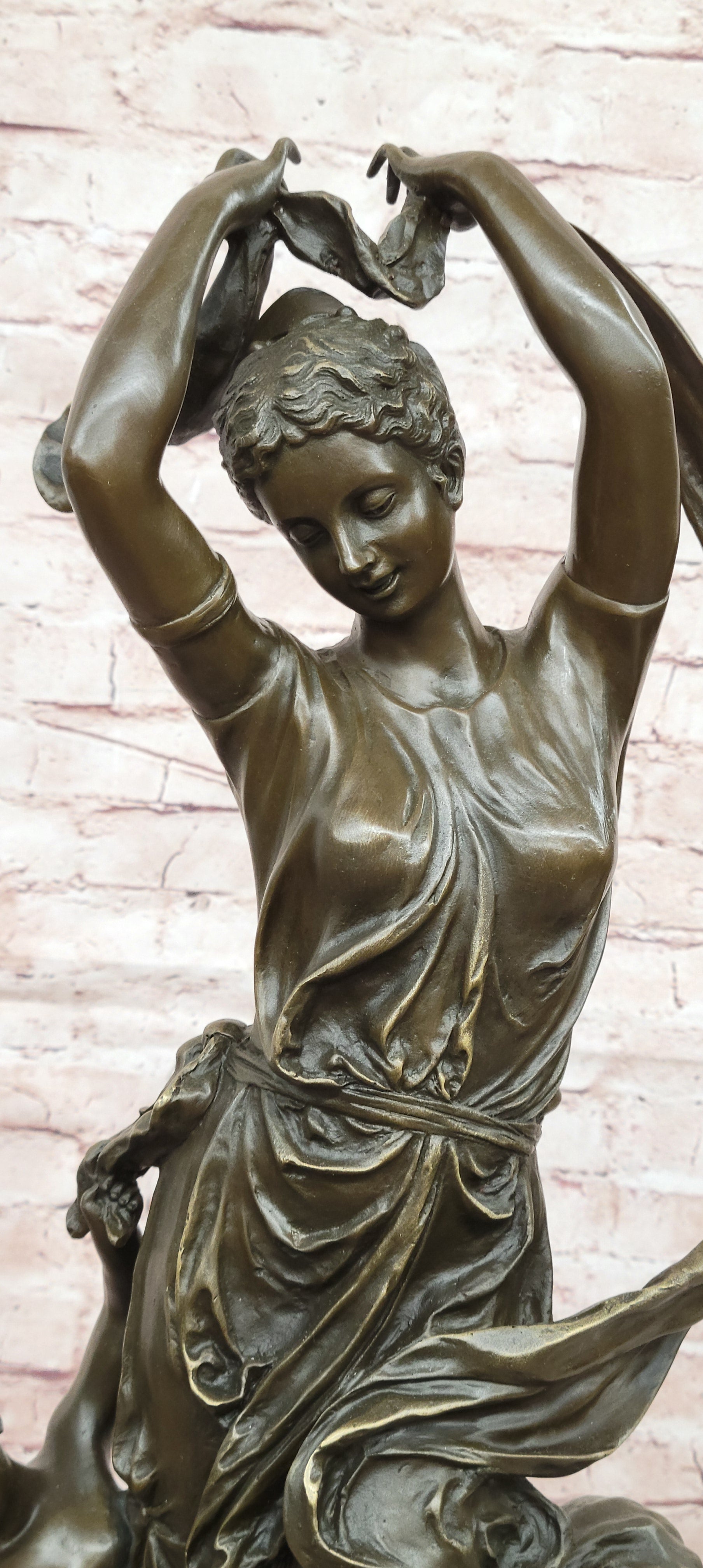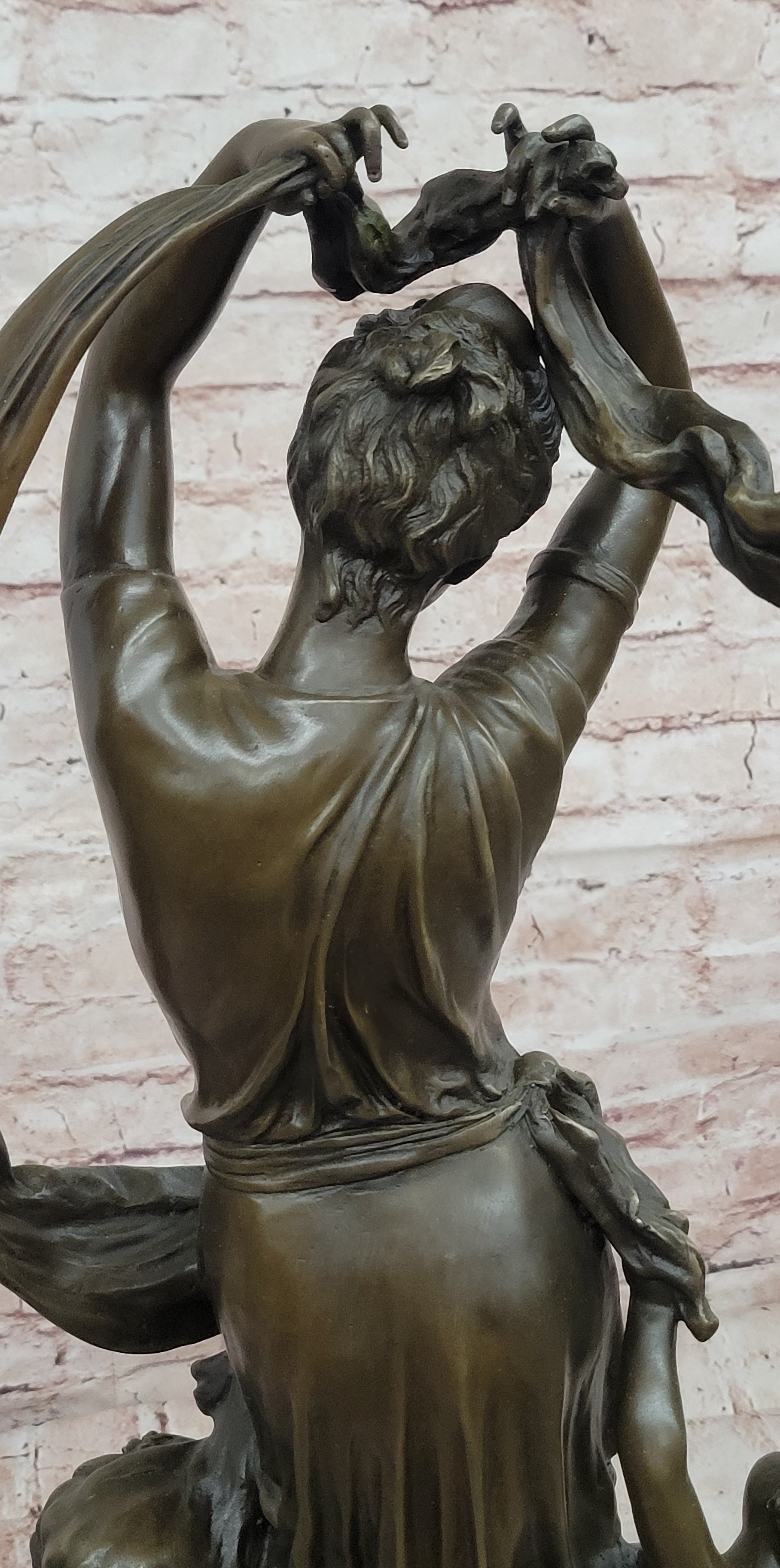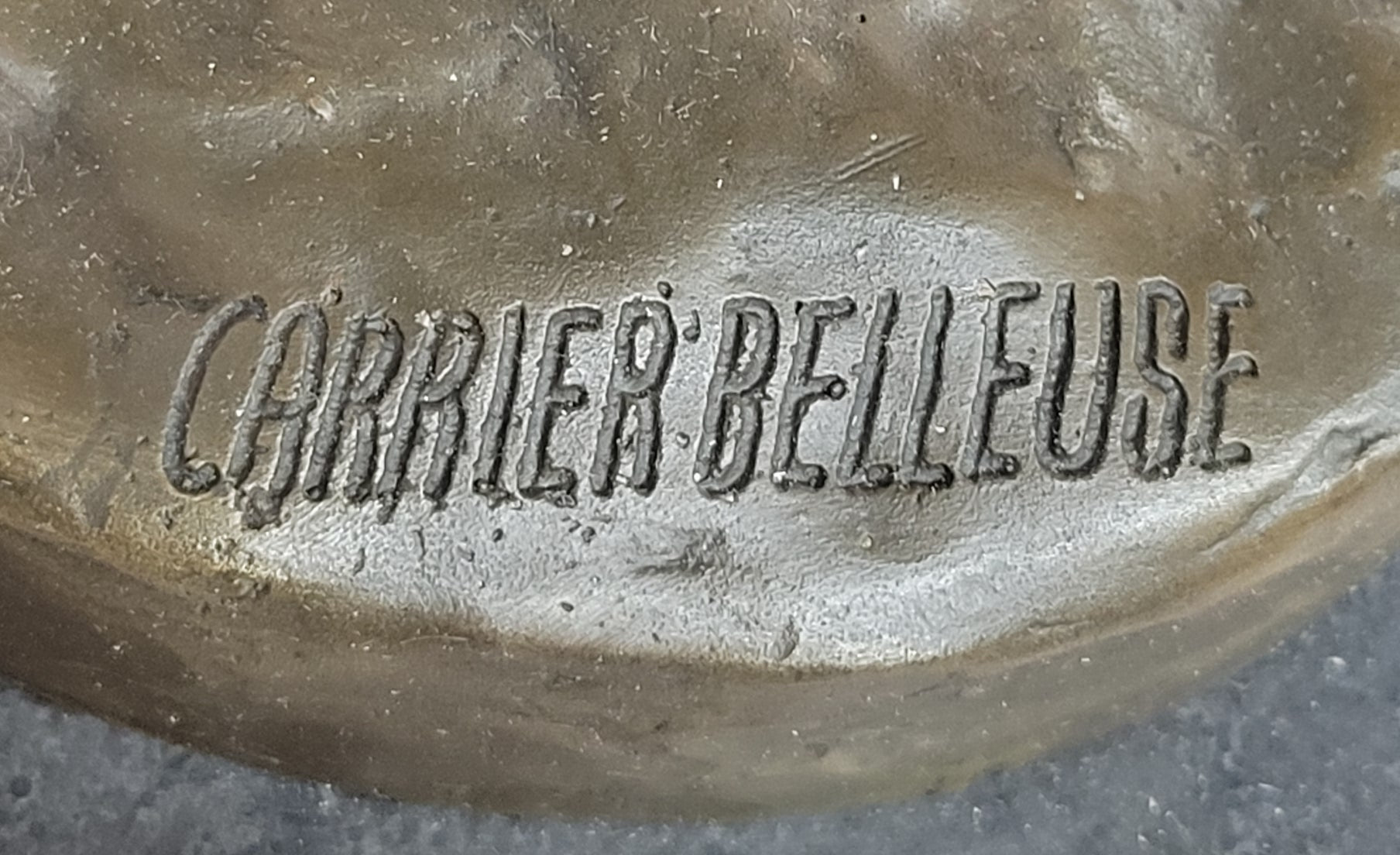 This Genuine French Bronze Art Deco “Festival Bound” sculpture by Carrier-Belleuse is an impressive and commanding work of art that celebrates elegance, movement, and classical refinement. The figure is captured in a graceful, forward-moving pose, embodying the spirit of festivity and sophistication associated with early 20th-century French sculpture. The flowing drapery and poised stance create a dynamic yet balanced composition, reflecting the timeless beauty of Art Deco design. Hand made using the traditional lost-wax casting method, this extra-large and heavy bronze statue showcases exceptional craftsmanship and fine detailing. The rich brown patina enhances the depth and texture of the figure, accentuating the contours, expressive features, and intricate sculptural elements. The substantial weight and scale of the piece further emphasize its quality and presence. Mounted on a round black marble base, the sculpture is presented with stability and elegant contrast, perfectly complementing the warm bronze tones. A striking centerpiece for any refined interior, gallery, or distinguished collection, this Carrier-Belleuse bronze offers both artistic heritage and enduring decorative appeal.