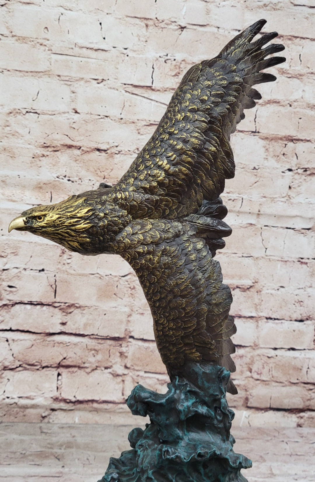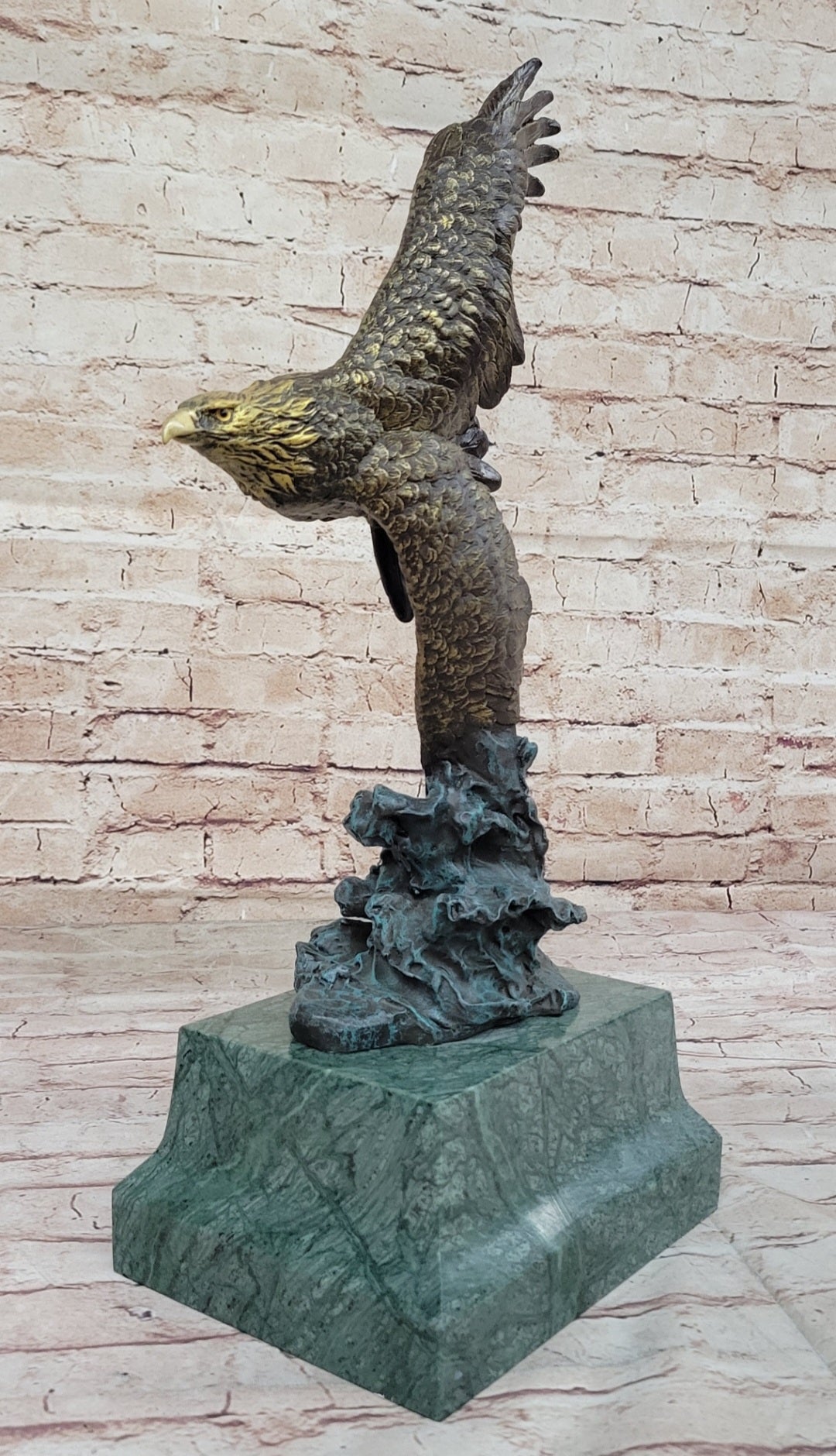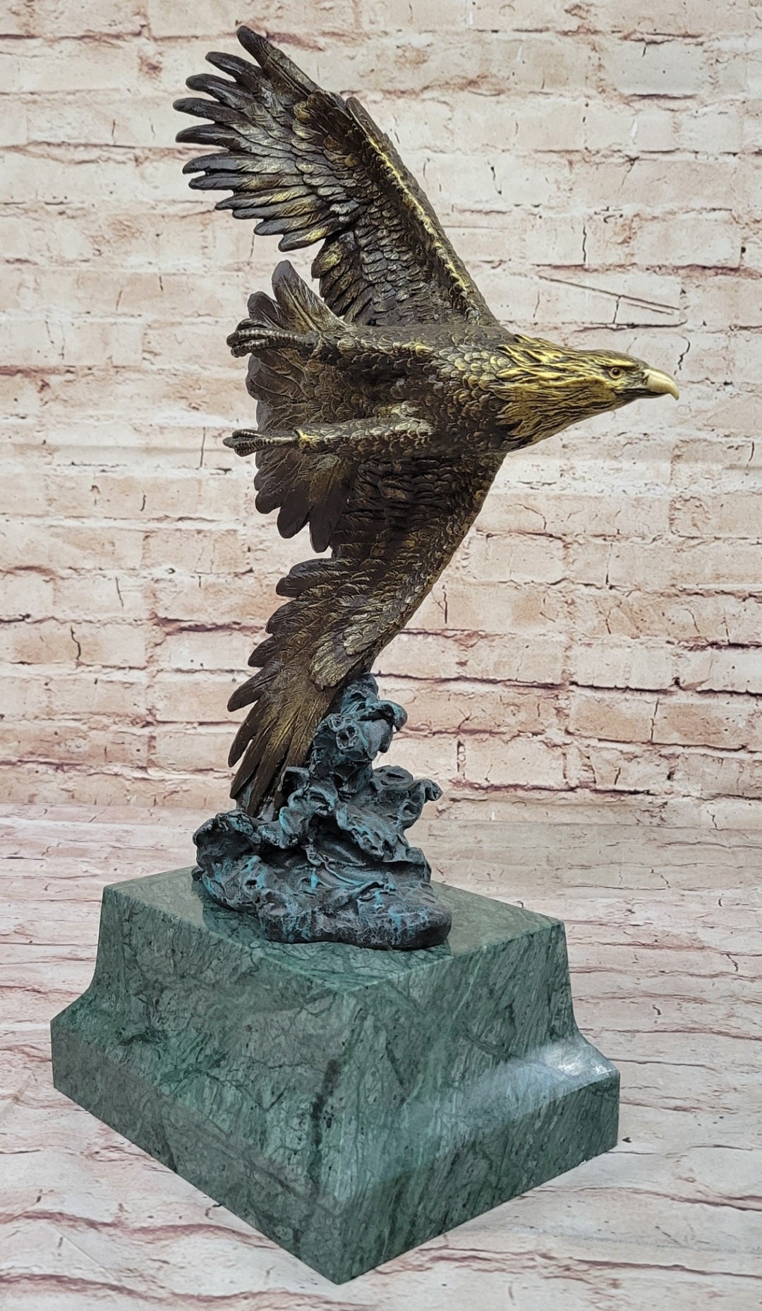 American Bald Eagle Flying Sideways Bronze Sculpture Statue on Green Marble Base