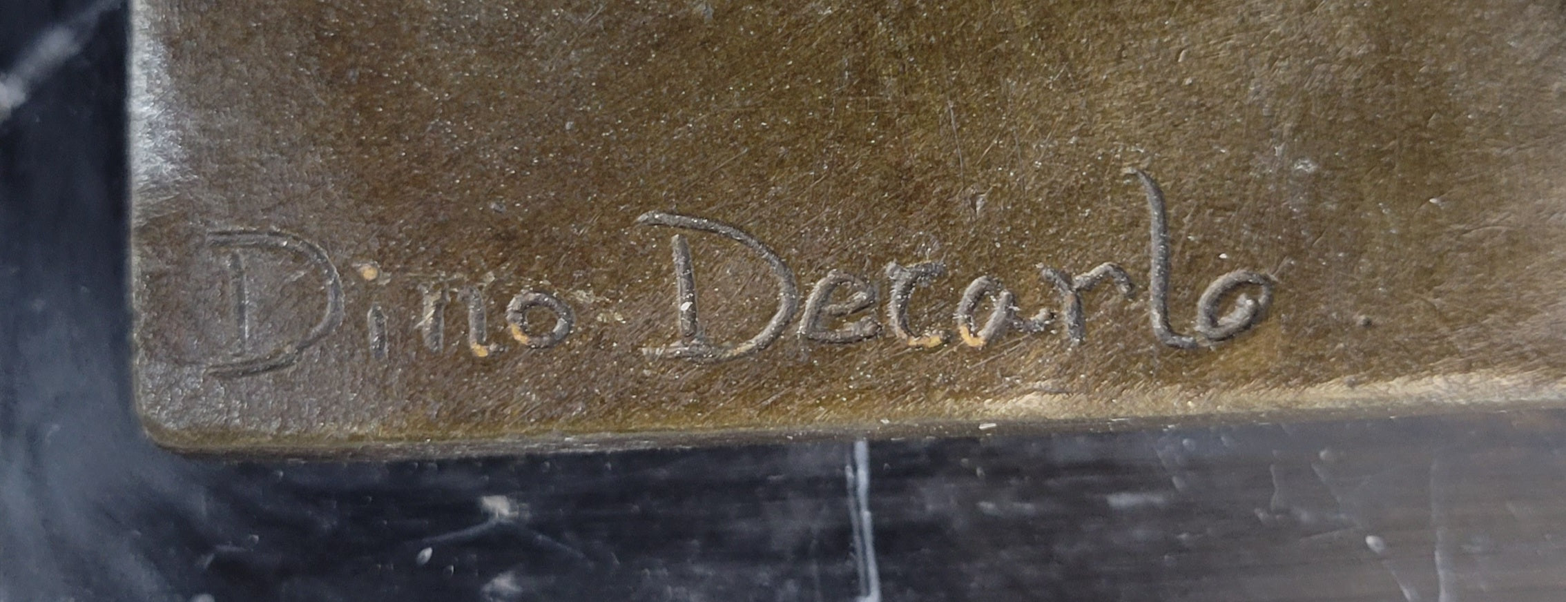 A Royal Prince of the Middle Ages stands with his arms out to the side in front of him. His thing robes hang to the floor. On his head is a pointed hat. These hats have been popular in various cultures around the world for ages. Signed by Dino Decarlo, this piece stands on a black marble base. It was crafted using the lost wax method.Bronze Dimensions with Marble Base:Height 18" x Width 10"