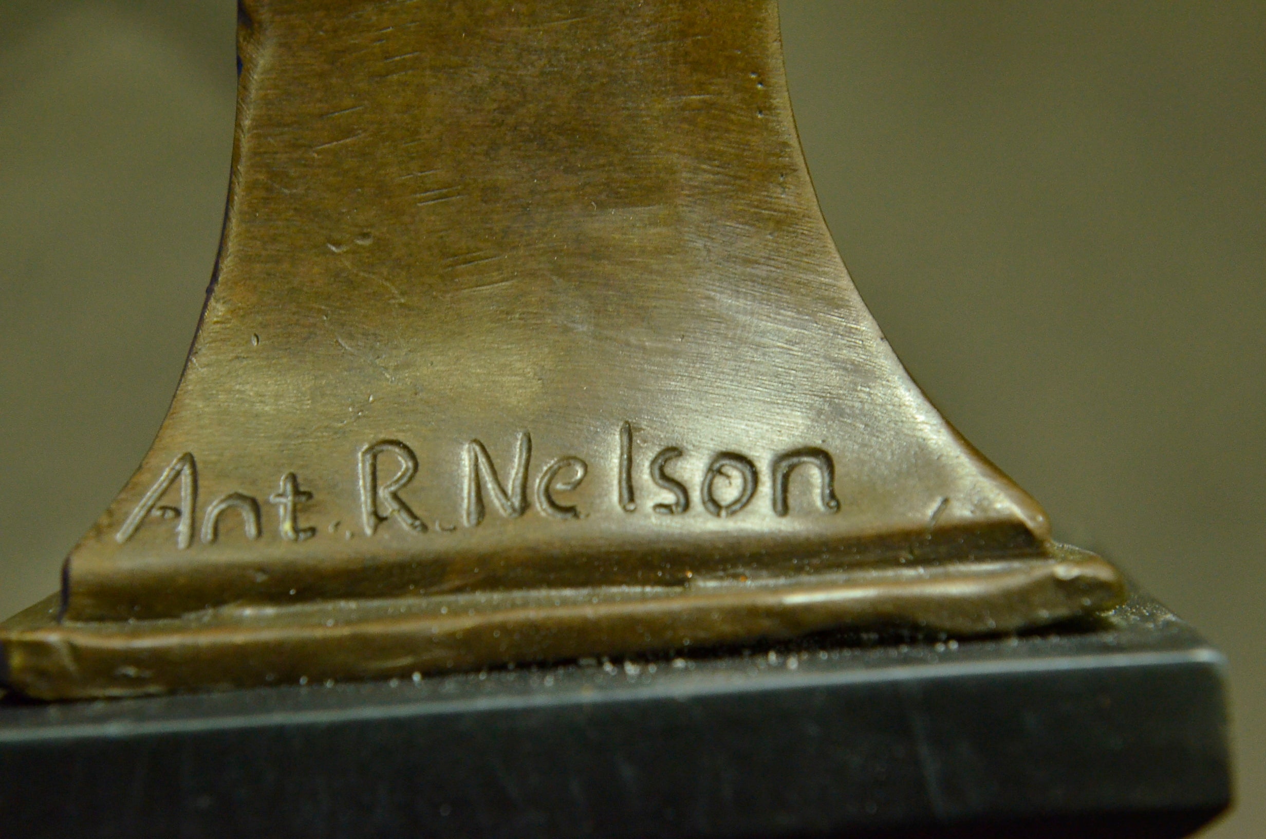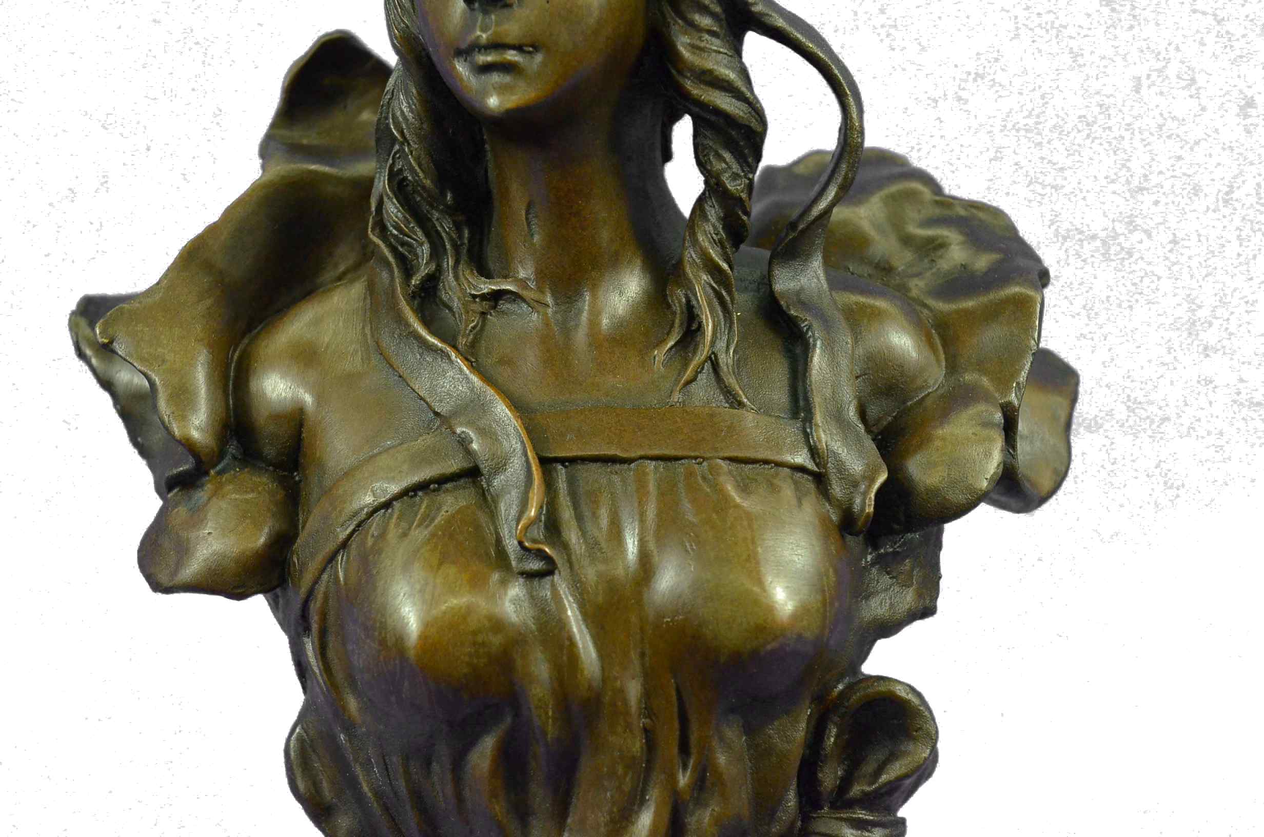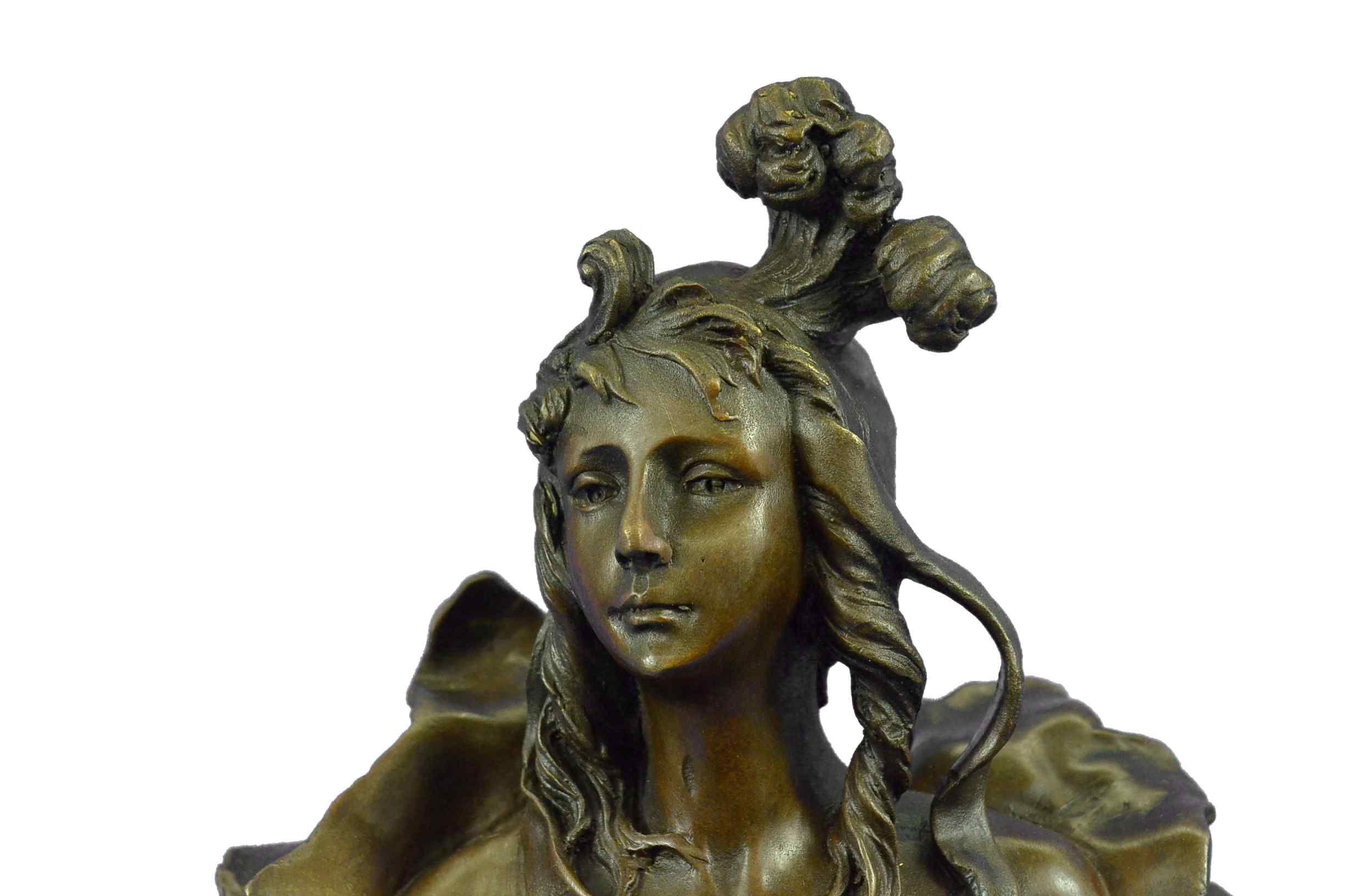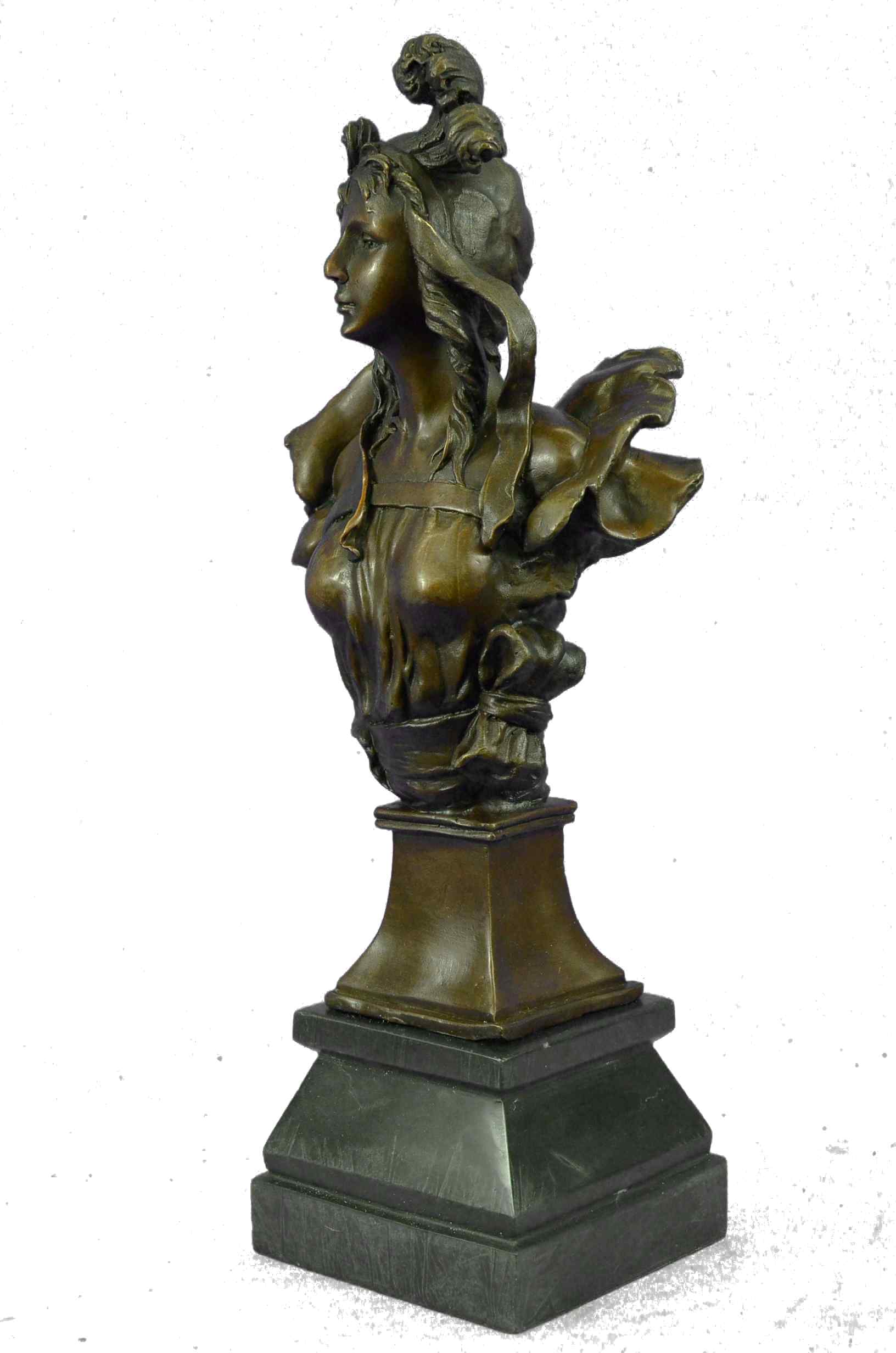 This classic bronze bust statue of a  beautiful woman is exquisitely  crafted with great details in the design. Her fair oval face,  enigmatically smiling, falls sinistral as her eyes look down  gracefully with her hair cascading down her shoulder.  A sheer fabric  softly covers her ample breasts. The archaic method of  lost-wax  casting creates the flexibility to capture a true representation of  life objects such as her hair and the fabric. This classic, voluptuous  beauty by the artist Anton Nelson is mounted on a black marble plinth.Bronze Dimensions with Marble Base:Height 15" x Width 7"