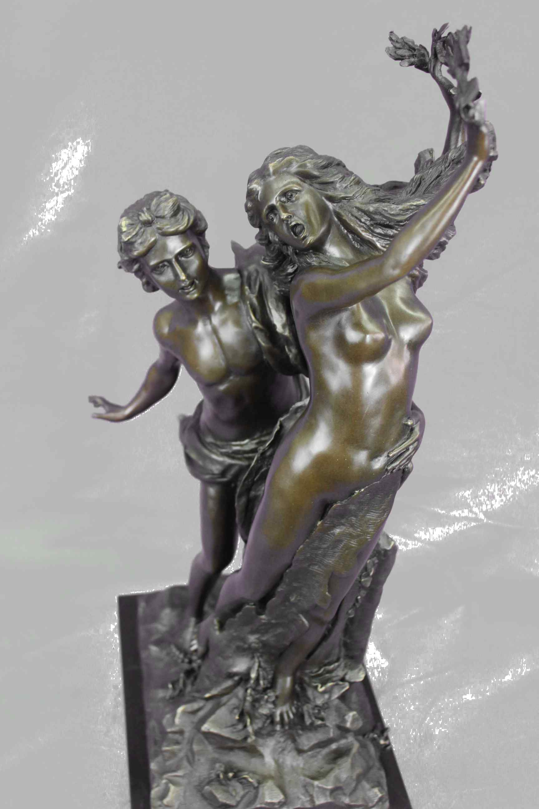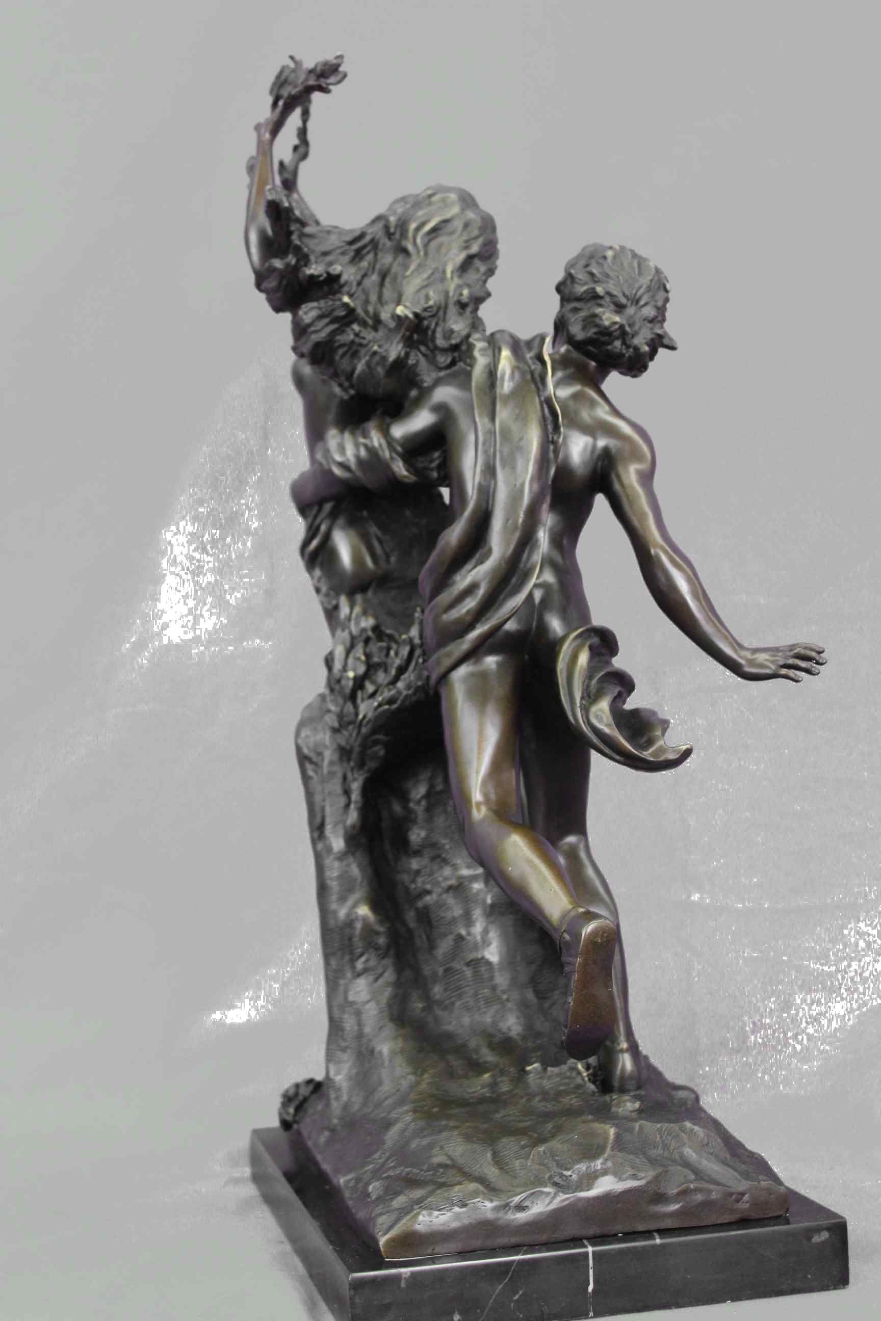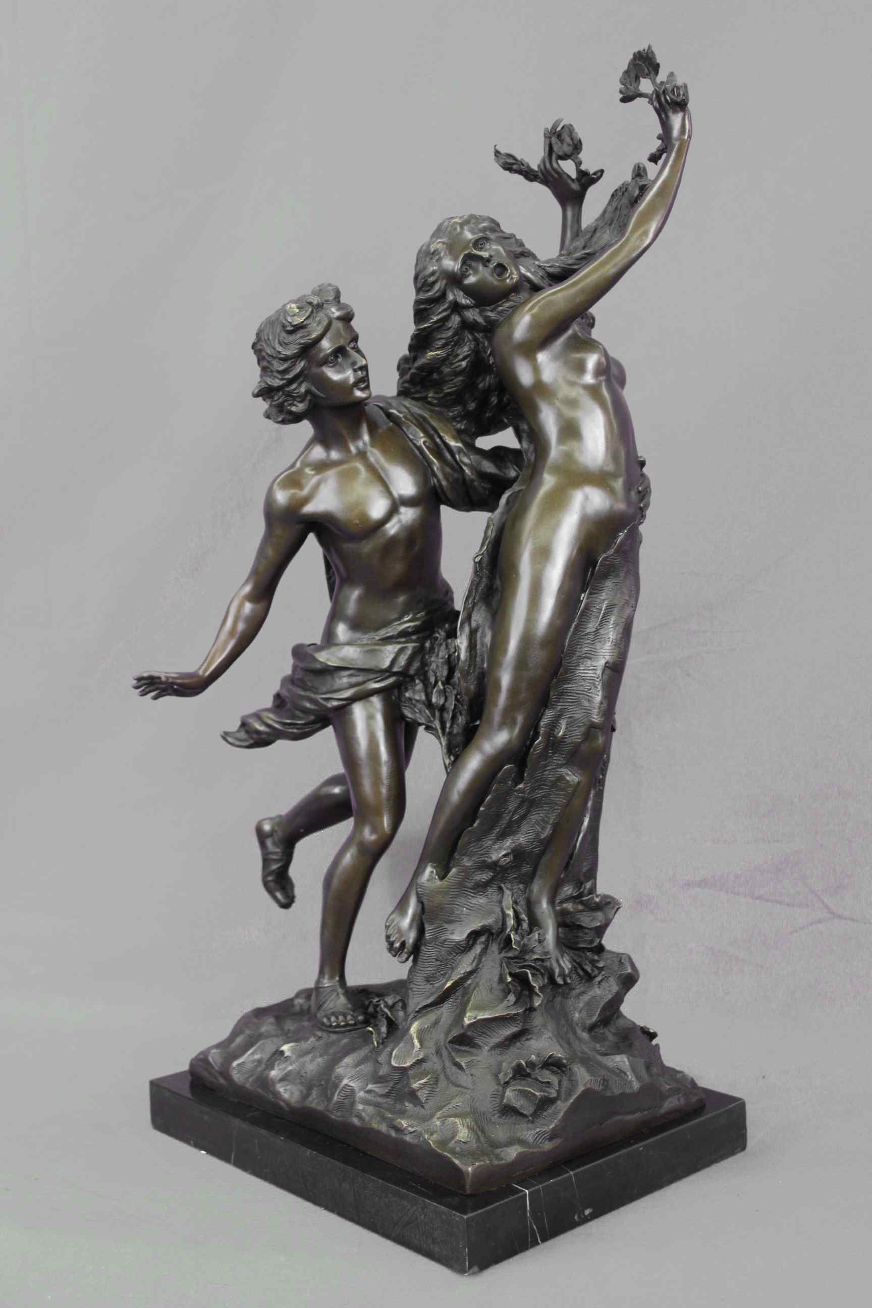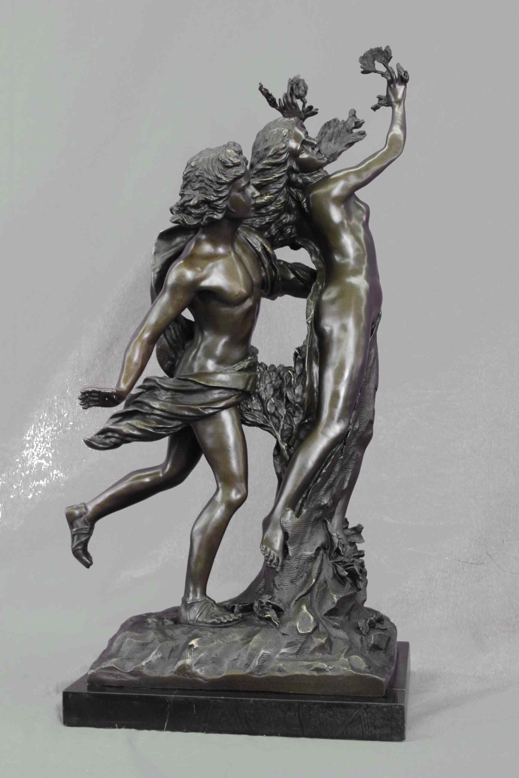 Apollo and Daphne" This famous sculpture is by the famous Italian sculptor, Giovanni Lorenzo Bernini (1598-1680). It was inspired by one of the stories included in Ovid`s Metamorphoses. The Story Behind the Sculpture: In the story, Apollo, god of prophecy, sees the young Eros, god of love, playing with his bow and arrows and remarks, "What have you to do with warlike weapons? Leave them for hands worthy of them." In retribution for this reproach, Eros wounds Apollo with a golden arrow, causing him to fall in love with the nymph daughter of the river God, Peneus. Eros additionally wounds the beautiful nymph, Daphne, with a lead arrow, thus insuring she would not be wooed by Apollo`s advances. (In fact, the arrow`s power was so strong that Daphne forthwith refused all of her lovers.) Apollo, struck with the golden arrow of love, pleads with Daphne to fulfill his desire. Daphne, repulsed by the idea, begins to flee. Even as she runs, he is more captivated by her beauty. Apollo grows impatient and soon, sped by Eros, gains on her. With slower speed and failing strength, Daphne cries out to her father just as Apollo captures her. Not a moment later, Daphne`s skin turns to bark, her hair leaves, her arms branches, her feet roots, and her face a treetop. In only a moment, Peneus protects his daughter by turning her into a laurel tree. After the transformation Apollo still embraces the tree. He cuts off some of her branches and leaves to make a wreath and proclaims the laurel as a sacred tree. Bernini`s sculpture captures Daphne`s transformation with intense emotion and drama by portraying the different stages of her changes. The interlocking components and chiaroscuro create more narrative, reflecting foundations of Hellenistic Greek art. Cast in bronze and signed "Bernini." About the Artist: Giovanni Lorenzo Bernini (December 7, 1598 - November 28, 1680) was a pre-eminent Baroque sculptor, architect, and painter of 17th Century Rome. He was the son of a sculptor and studied with his father who also helped him gain early patronage. Extensive patronage from the powerful Borghese and Barberini families contributed to his notoriety, but, from the beginning, Bernini was a virtuosic sculptor. For Cardinal Scipione Borghese, he produced a series of sculptures of subjects from Ovid`s Metamorphoses and from the Bible (1618-25). These works show Bernini`s ability to use the observer`s space to expand the possibilities of sculpture beyond the medium itself. Apollo and Daphne, for instance, shows Daphne trying to escape from the pursuing Apollo and turning into a laurel tree as she does so. The observer must walk around the sculpture to witness Daphne`s transformation, thus denying a unitary viewpoint. This type of multiple viewpoint was common in Mannerist sculpture.Original or Reproduction: Reproduction