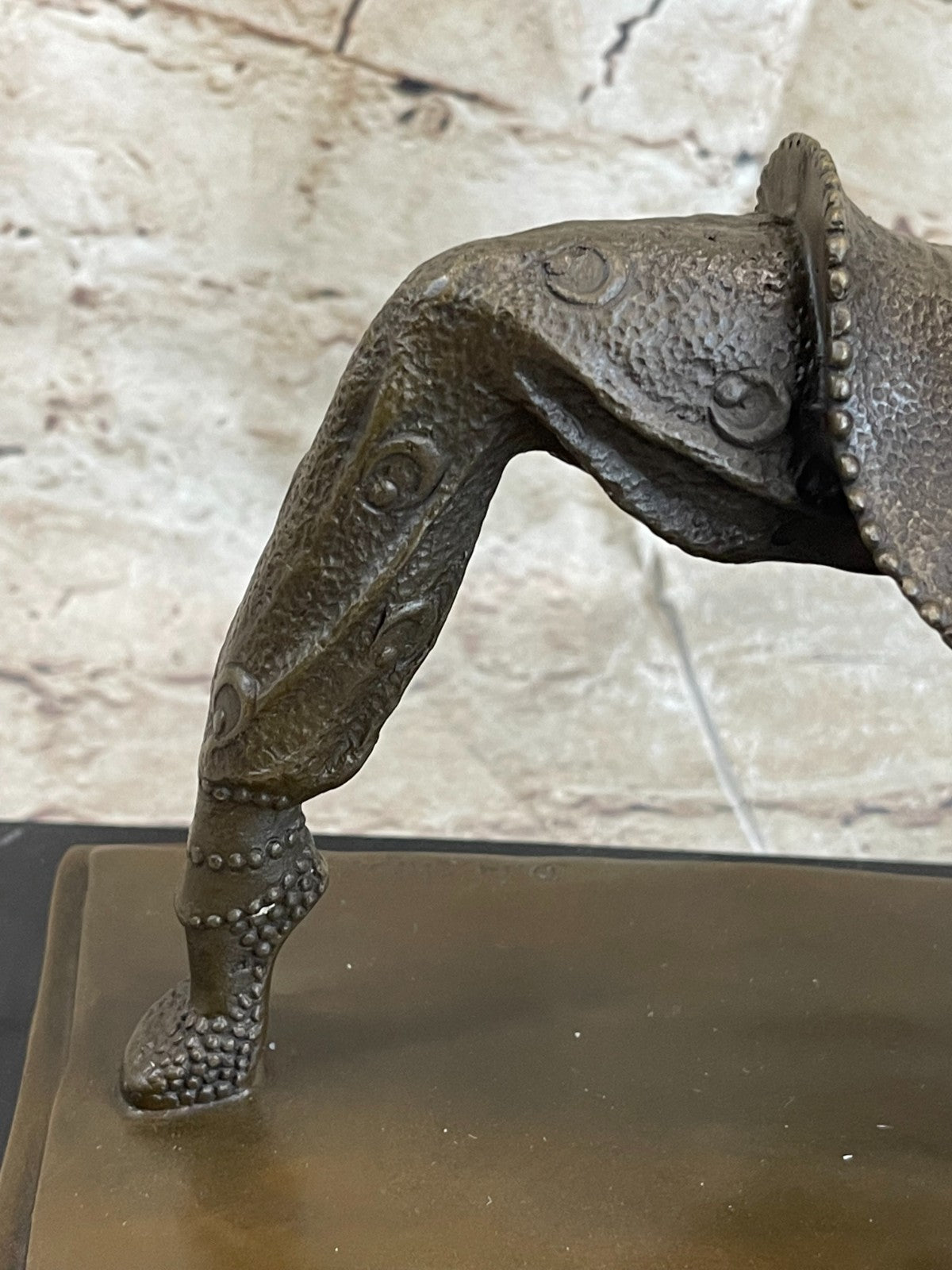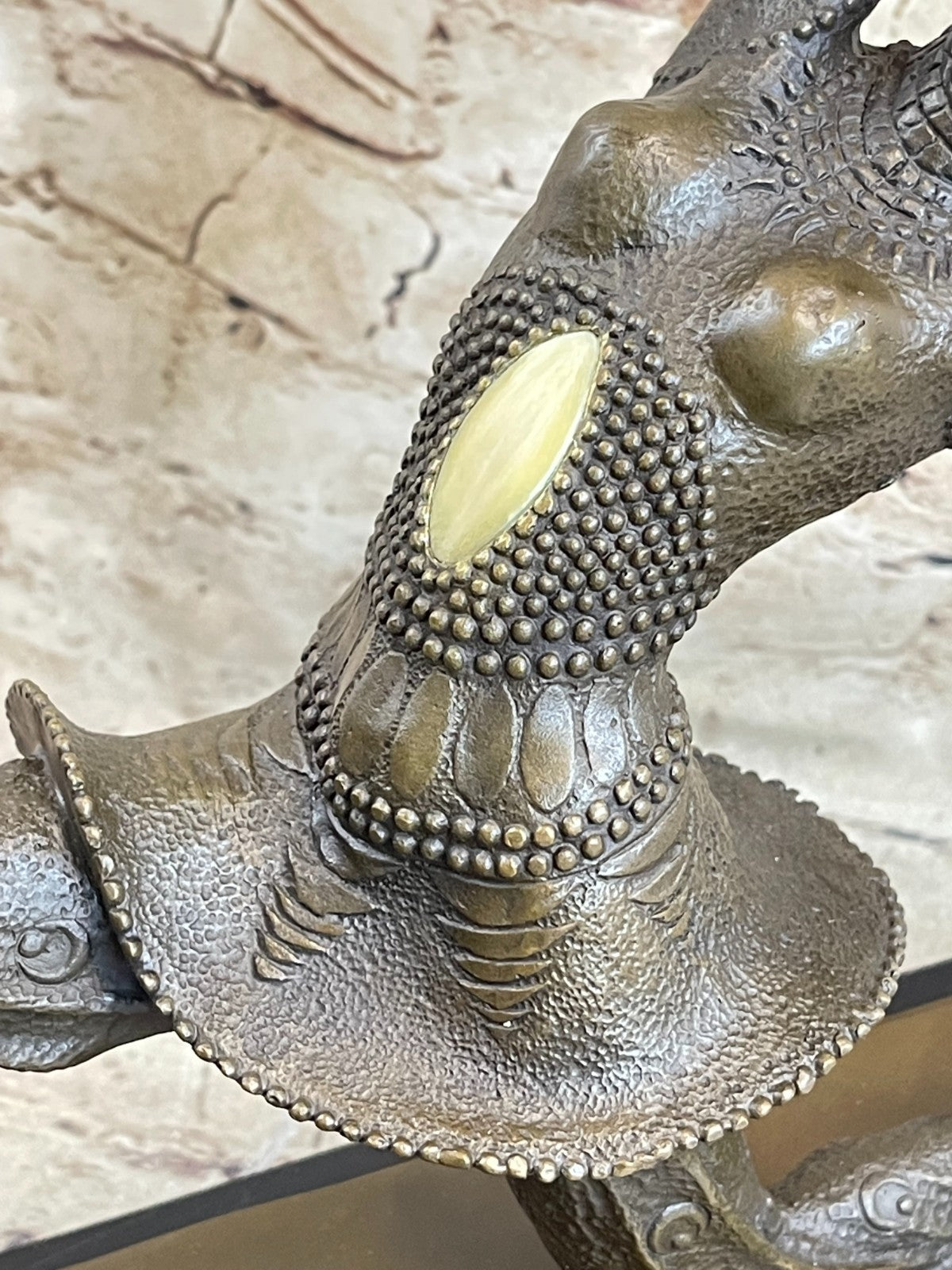 Introducing the Majestic Art Deco "Clara" Bronze Statue, a captivating piece of art that adds elegance to any home or office decor. This stunning sculpture features a graceful figure with intricate details and a timeless Art Deco design. The statue showcases the beauty of a woman, with her flowing gown and striking pose, exuding a sense of sophistication and allure. The hand and face of "Clara" are expertly crafted using high-quality resin, meticulously sculpted to capture every nuance and expression with lifelike precision. The bronze body complements the resin features, creating a harmonious blend of materials that enhances the overall visual appeal. This exquisite bronze statue stands as a testament to the artistic mastery of its creator. Its meticulous craftsmanship and attention to detail make it a true work of art. With its commanding presence and exquisite beauty, "Clara" becomes a focal point in any space, evoking a sense of grandeur and sophistication. Whether displayed on a shelf, mantel, or desk, this remarkable piece is sure to captivate admirers and spark conversation. It also makes a perfect gift for art enthusiasts and collectors who appreciate the timeless allure of Art Deco. Transform your living or working space with the elegance and beauty of the Majestic Art Deco "Clara" Bronze Statue, a true masterpiece that combines the allure of bronze with the intricate craftsmanship of resin.
