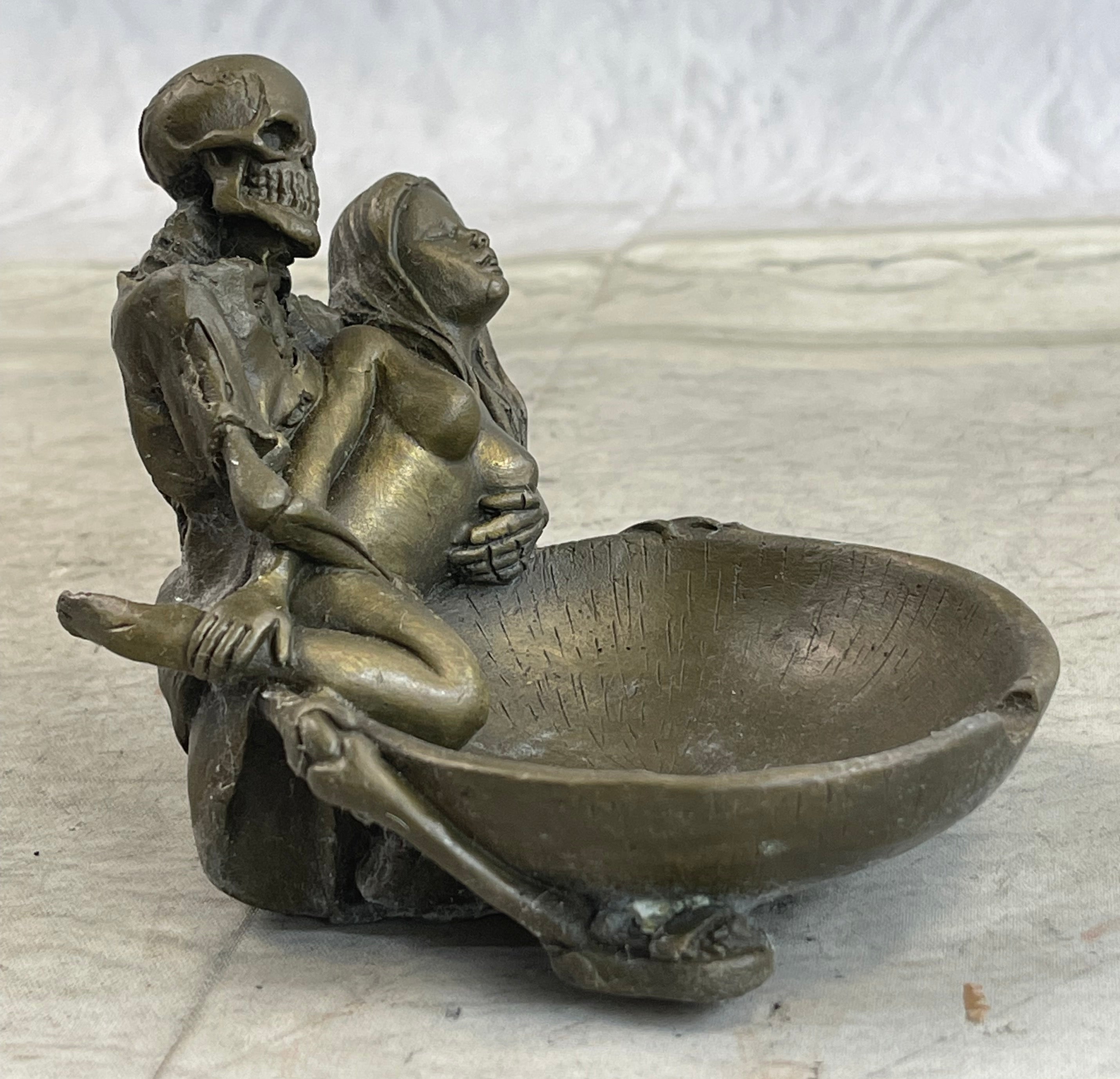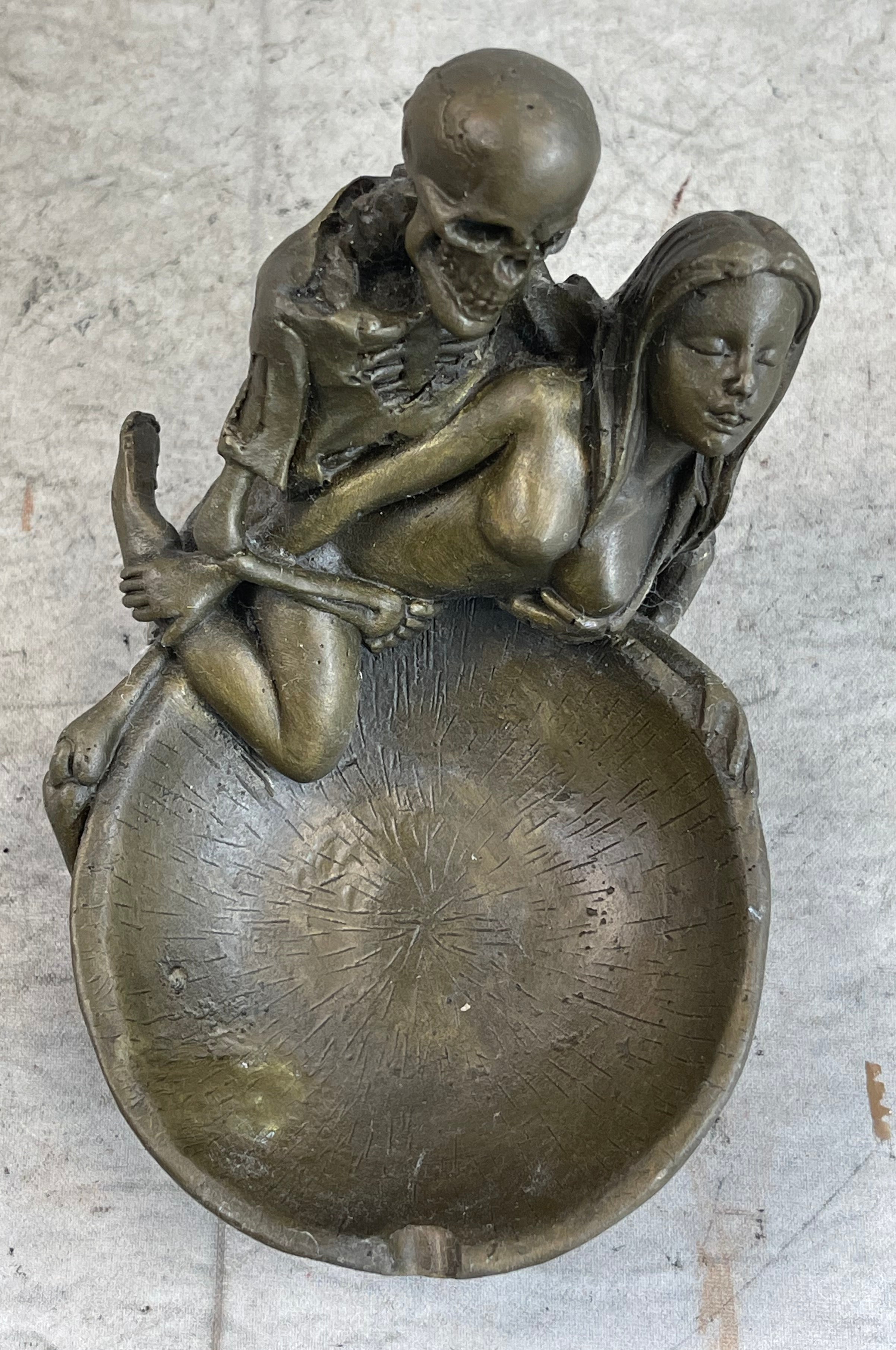 Bronze Skeleton & Nude Girl Novelty Ashtray Sculpture Dish Collectible 4" x 4"