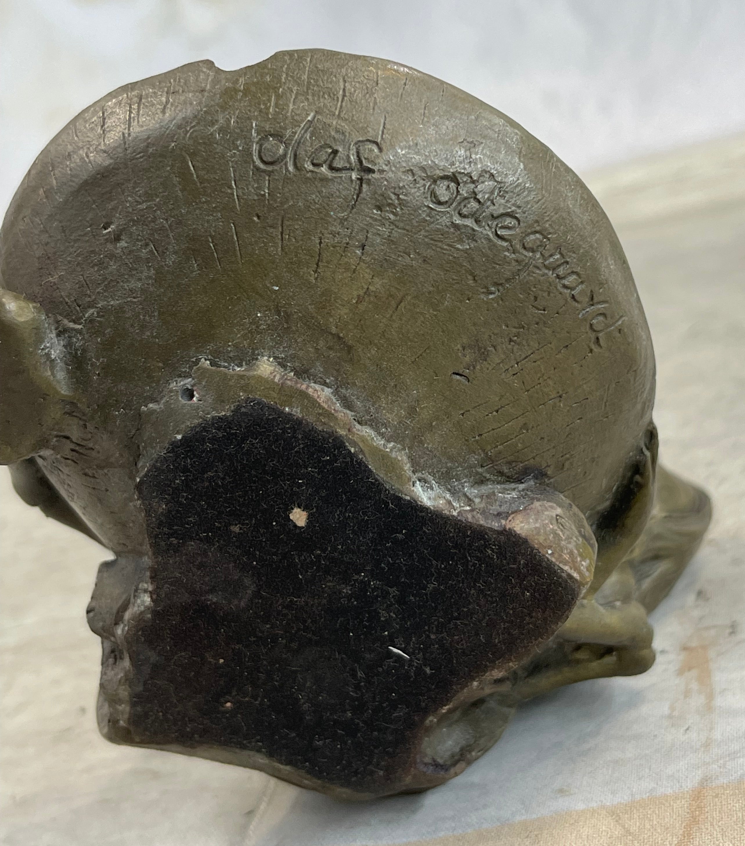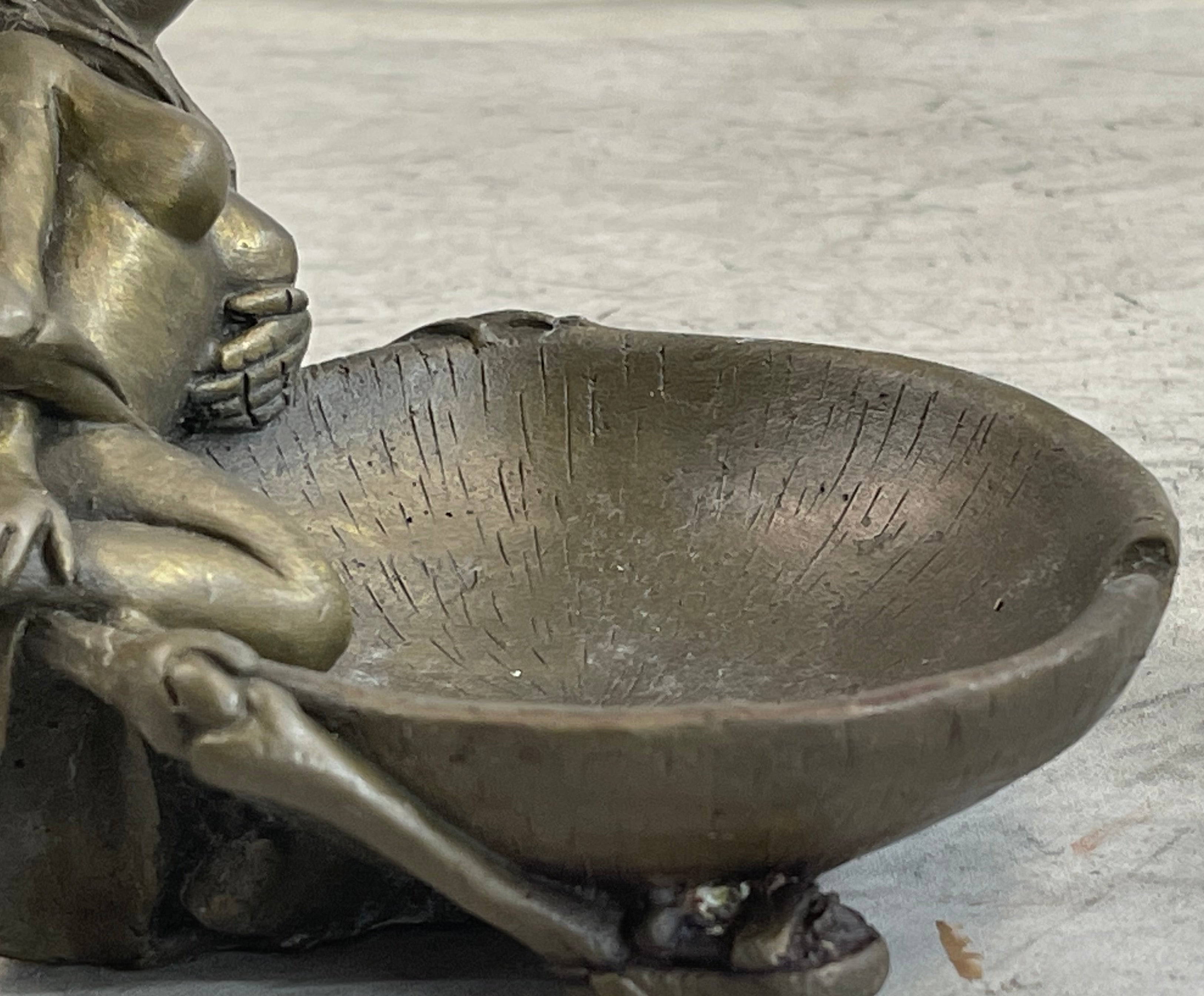 A hard to find collectible Hand crafted ashtray. This pin-up girl beauty will made a great addition to any ashtray collection. This Bronze Sculpture was casted using the “Lost Wax Method” and has a two tone brown patina. This sculpture is 100% bronze and is handmade. This sculpture is signed By artist Olaf Odegaard.Bronze Dimensions :Height 4" x Width 4"