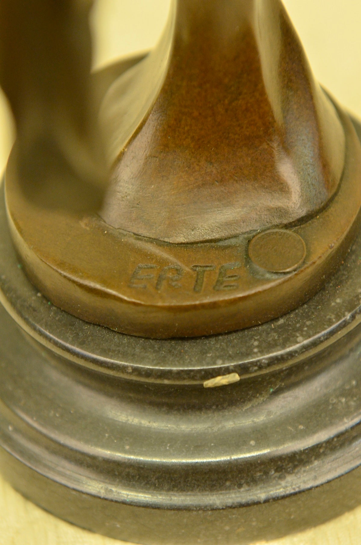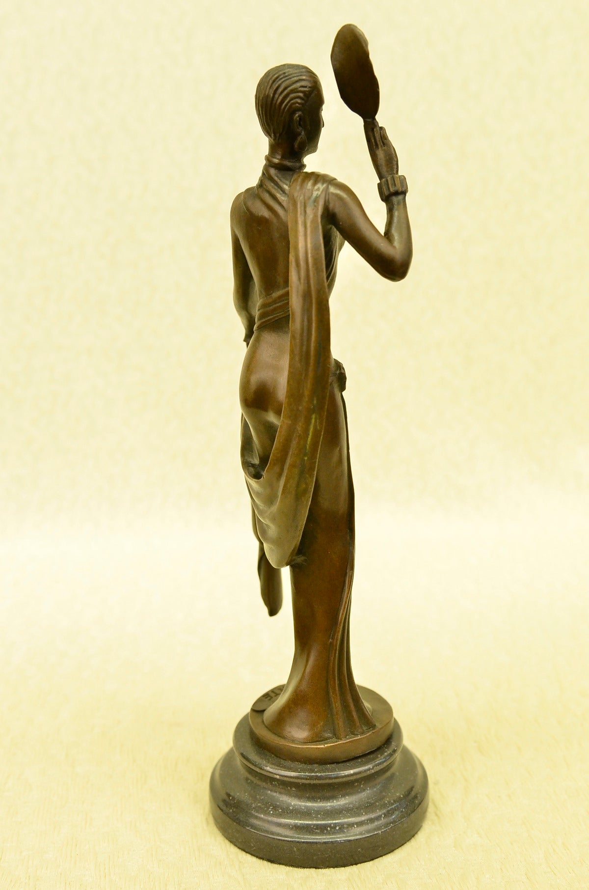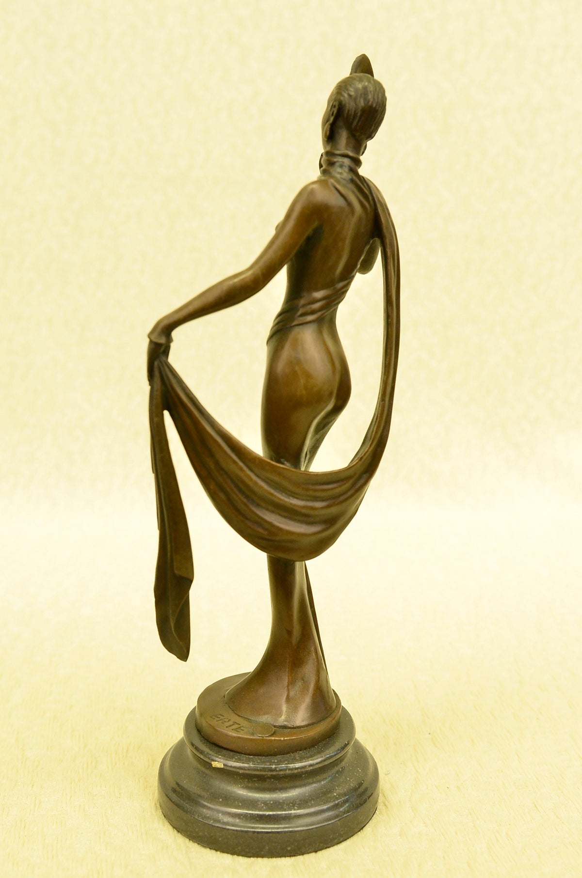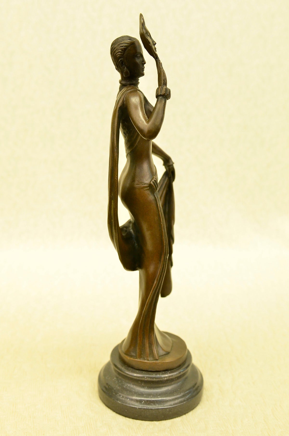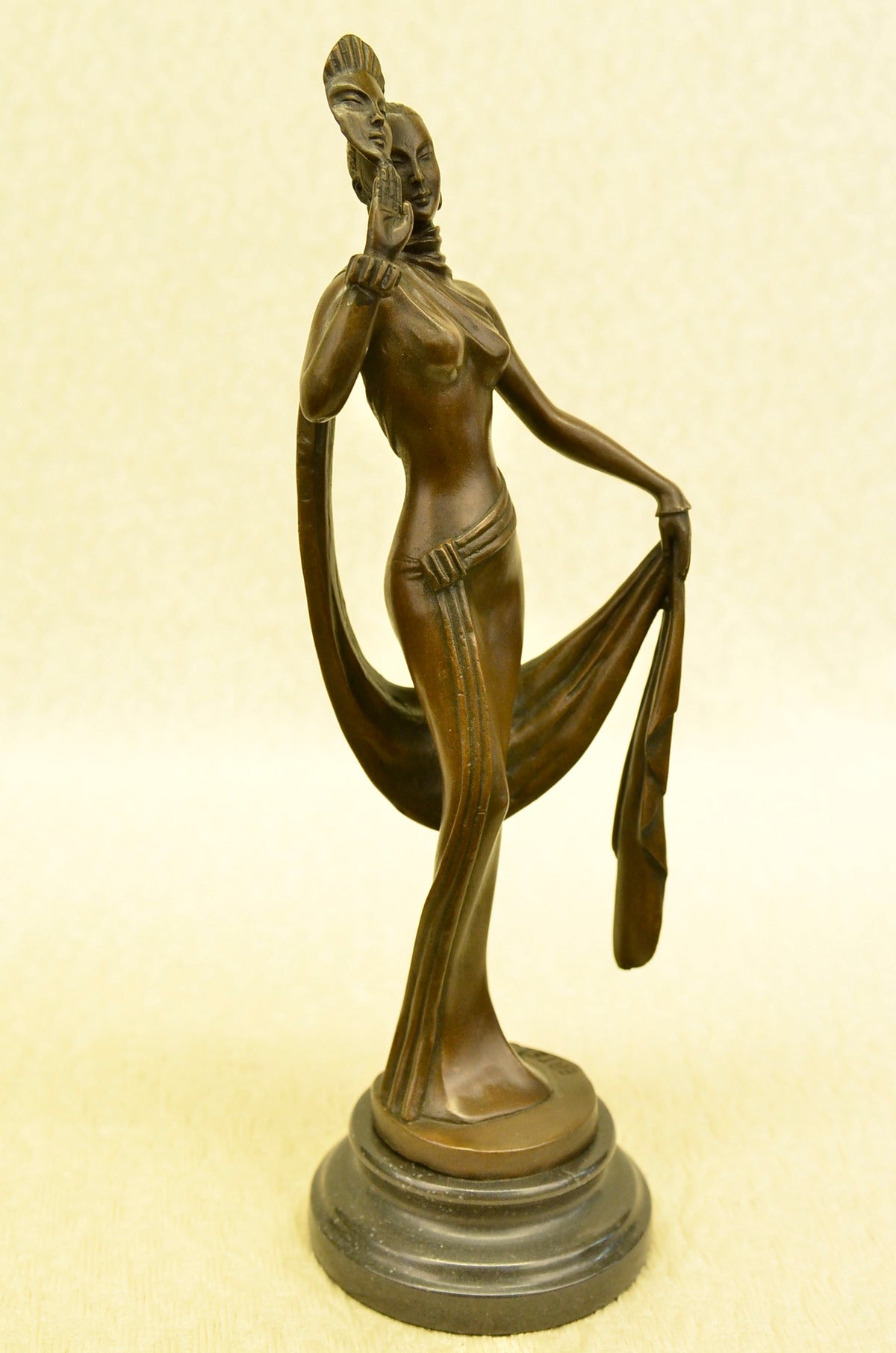 This unique sculpture of a 1920`s woman is a beautiful piece for an exquisite living room or a young lady`s bedroom. As she stands elegantly for her photo-shoot, who can forget to mention her unforgettable dress that drops all the way to the floor, while she holds a mask on her right hand. The details on her earnings,waist belt, are unbelievably carved leaving her picture perfected. This is a beautiful bronze sculpture cast using the "Lost Wax Method" and has a gorgeous brown patina. It is mounted on a marble base and is 100% bronze and handmade. This sculpture is signed Erte.Original or Reproduction: Reproduction