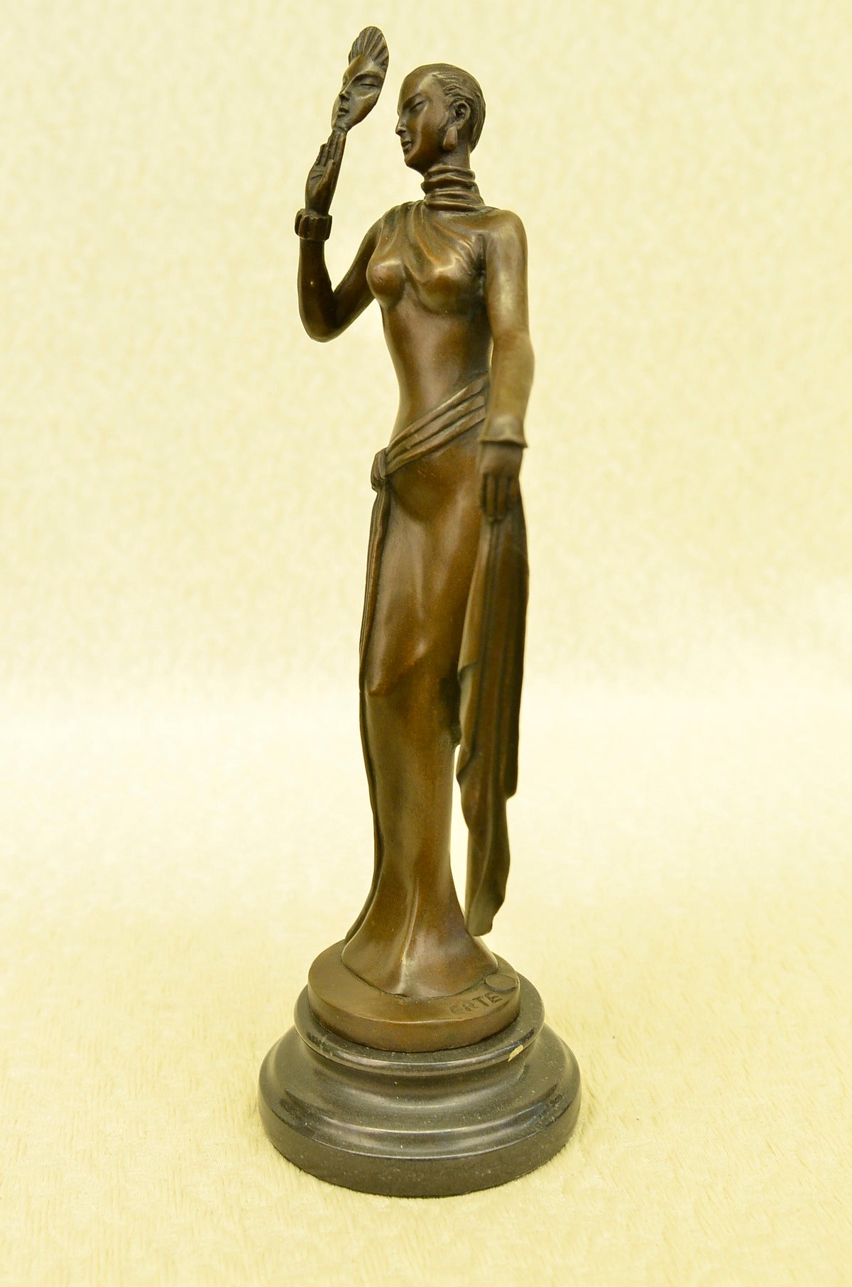 Art Deco Nouveau Mask Lady Woman Bronze Sculpture Marble Base Figurine Figure