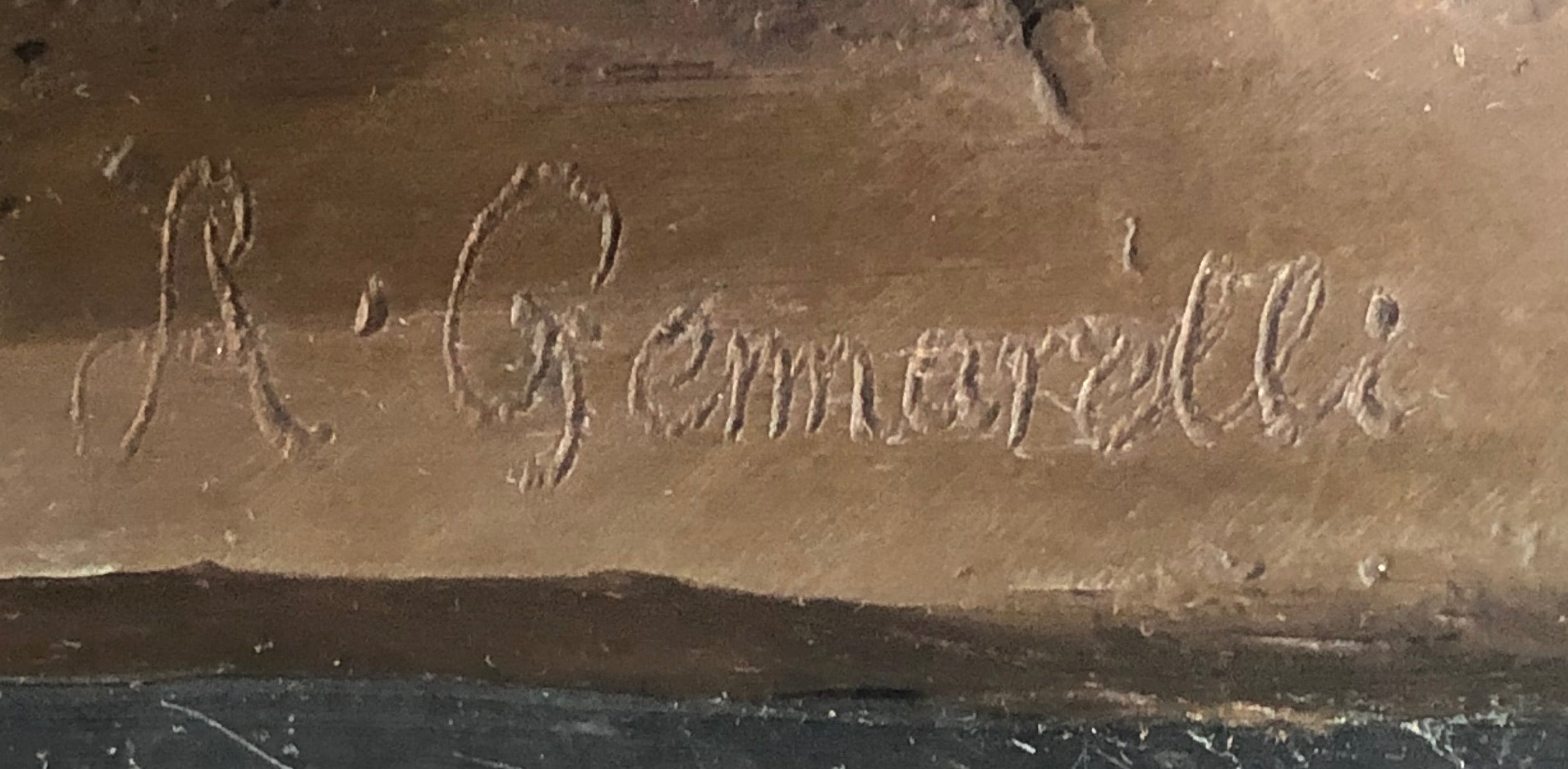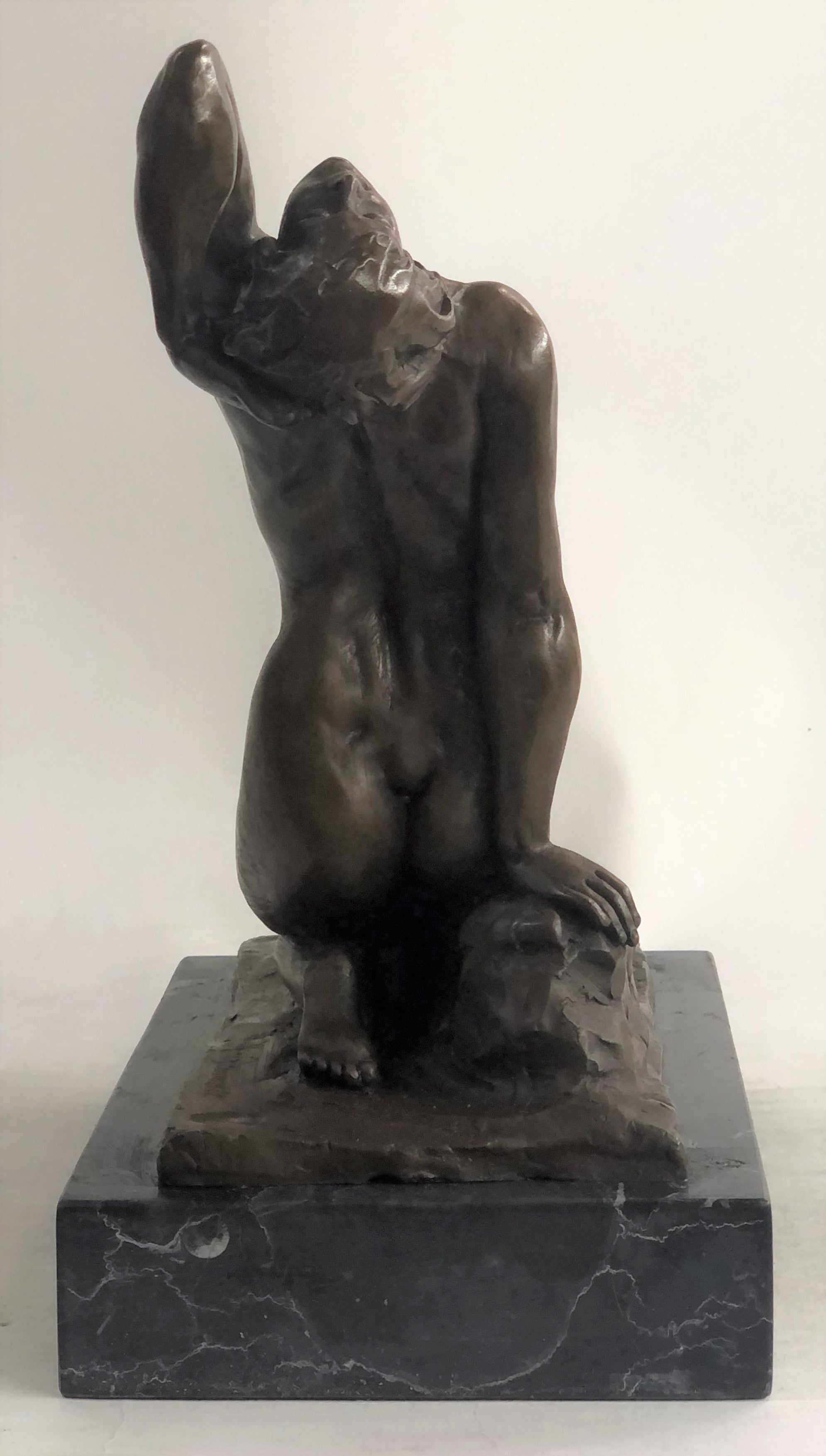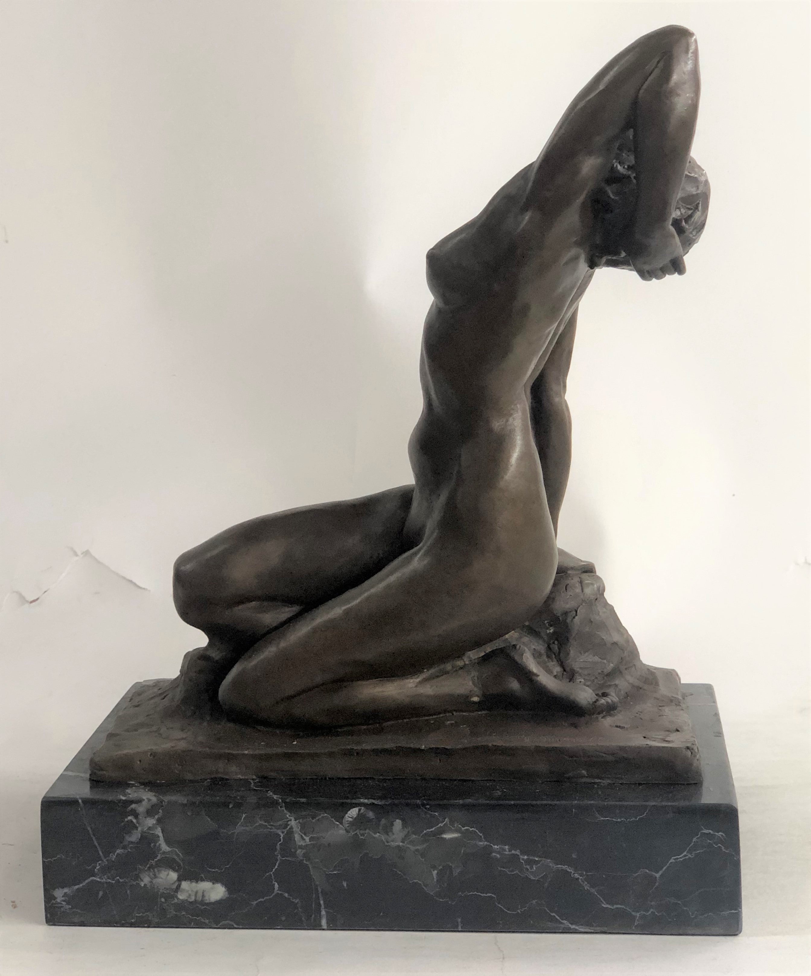 She Rest Both Legs tucked in, Her Head Thrown Back And Her Back Is Arched In Pleasure. The Nude Woman Places Her Hands Behind her head For Support. The Rawness Of This Sculpture Is Heightened By The Ragged Stone-Like Surface. This Carnal And Rugged Sculpture Was Crafted Using The Lost Wax Method. It Rests On A Black Marble Base and has a special brown patina. It Is Signed A. Gennarelli.Bronze Dimensions with Marble Base:Height 10" x Width 8.5"