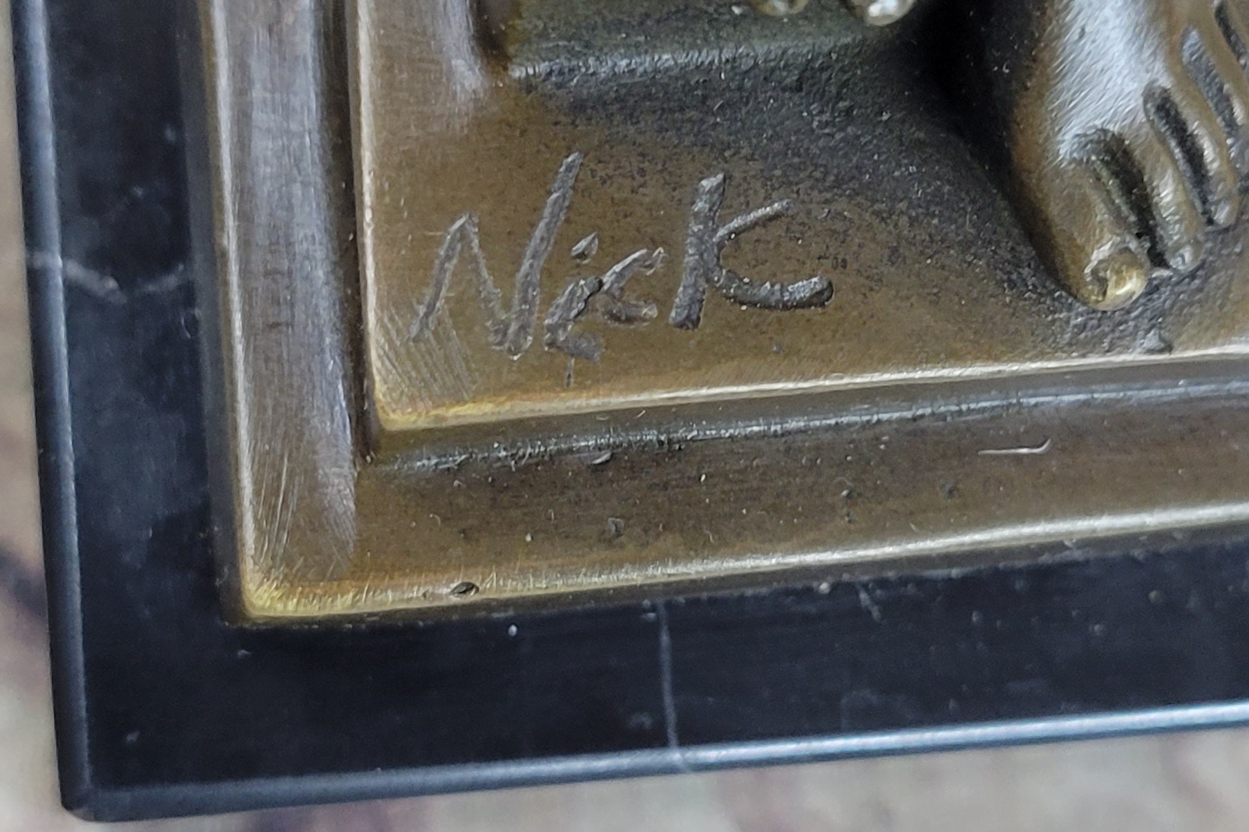 While the sculpture's subject matter is undeniably provocative, it serves as a celebration of sensuality and a testament to the enduring appeal of figurative art. Beyond its alluring surface, the piece invites reflection on themes of self-assurance and the diverse ways in which the human body can be celebrated through art. Mario Nick's creation encourages viewers to embrace and appreciate the bold confidence expressed by the sculpture's subject, presenting a captivating blend of artistry and empowerment. This work of art not only stands as a stunning focal point in any setting but also as a powerful statement on the beauty of individuality and self-acceptance.Bronze Dimensions with Marble Base: Height 14" X Width 3"