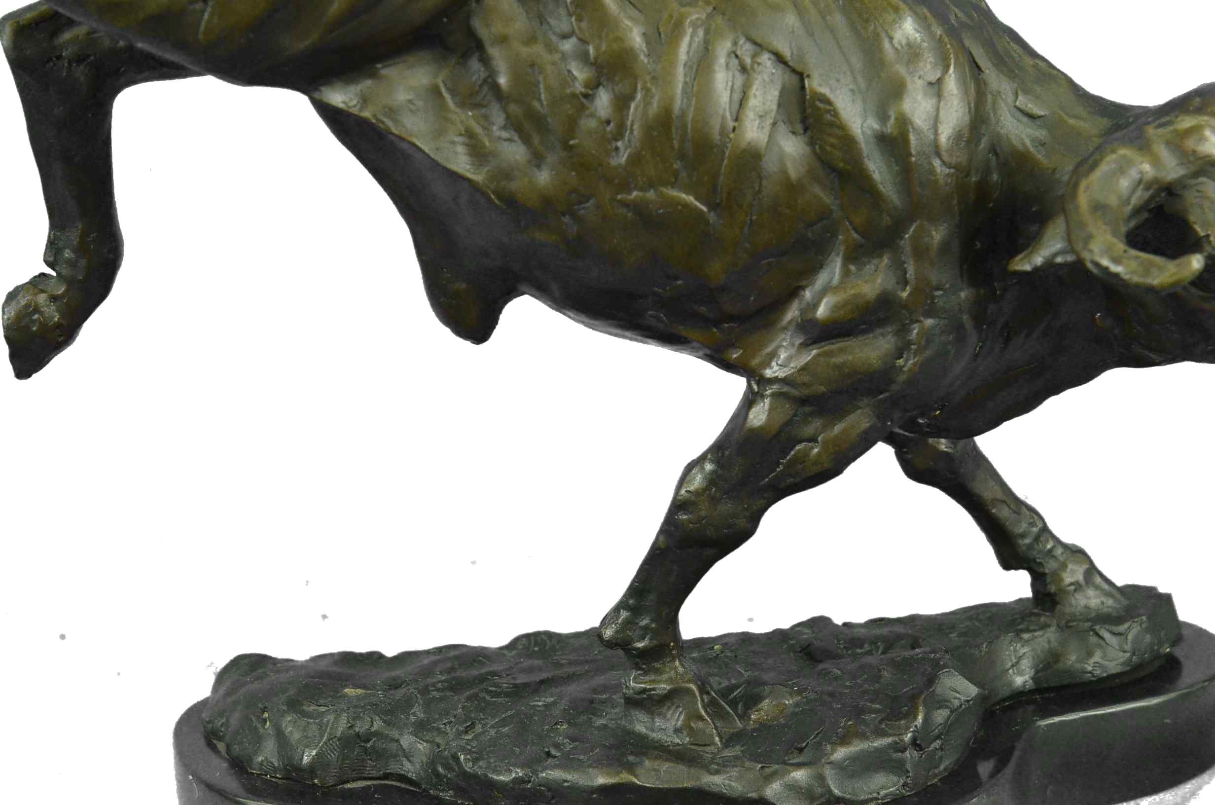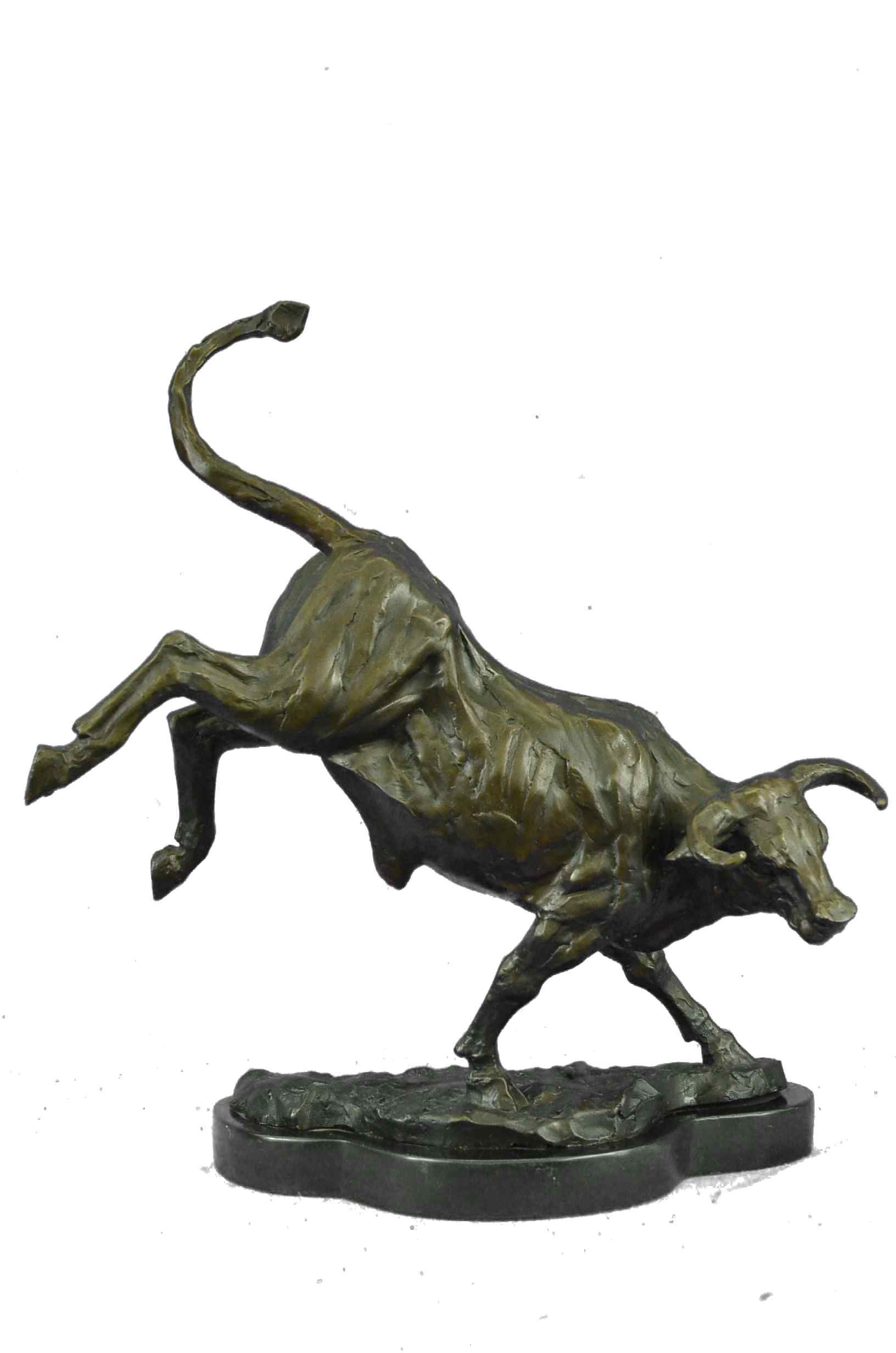 No need to venture to Spain for a good old-fashioned afternoon at a bullfight. The arena is in your home with this Spanish bull sculpture. Bullfighting is a traditional spectacle of Spain, Portugal, some cities in southern France and in several Latin American countries. It can be considered a blood sport for both the bull or the brave matador that faces it in the ring. This brown patina bull is in motion and hunting for its next target.Once he sets his eyes on you there`s no stopping him. He digs his hooves in, crouches low, lowers his curled horns and prepares to charge. The details of this handmade sculpture is in the bull`s body. The lines of his muscles, were carefully constructed. 100% bronze, this sculpture was cast using the "Lost Wax Method". It is mounted on a round black marble base and signed by the artist Milo