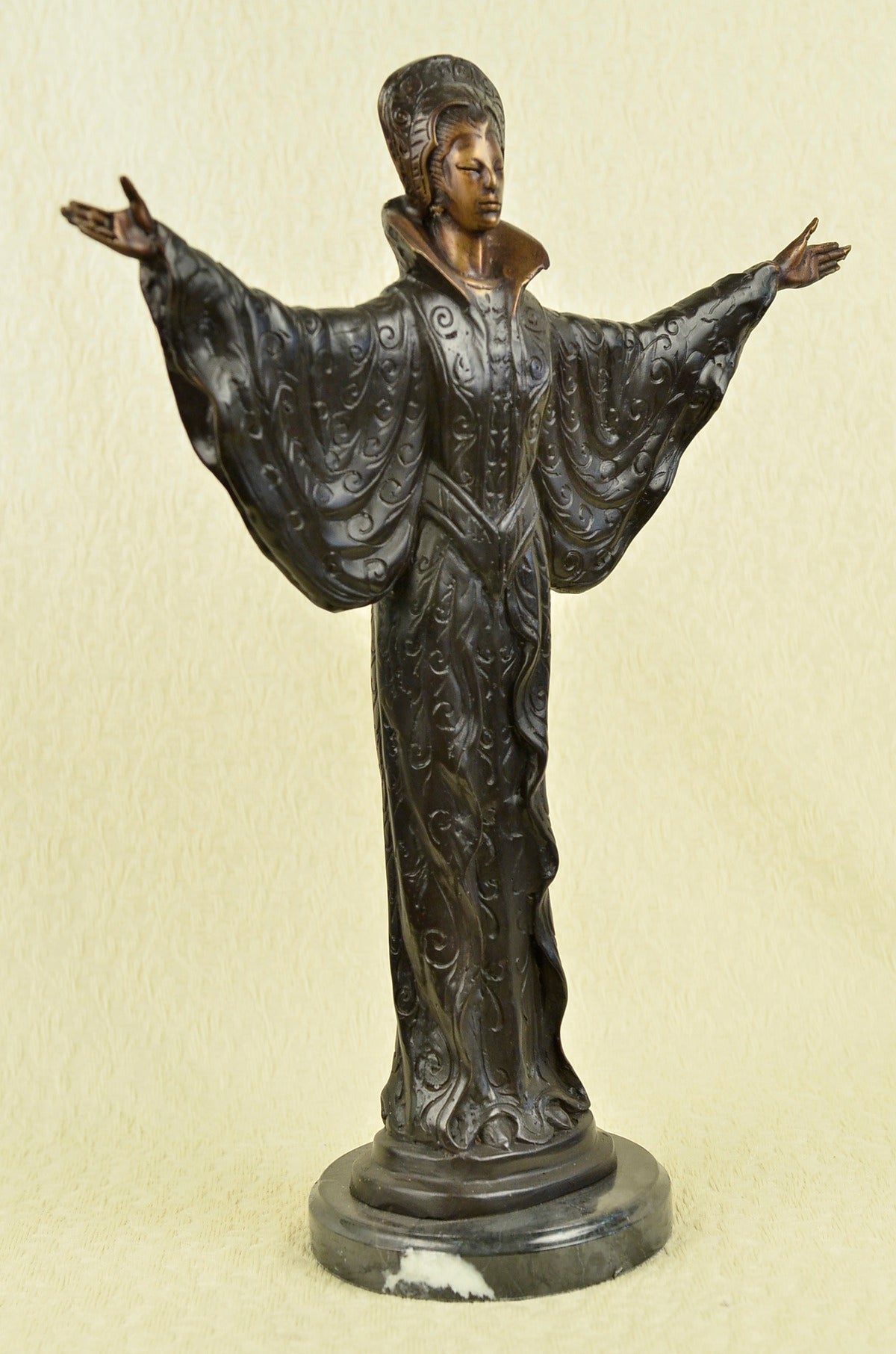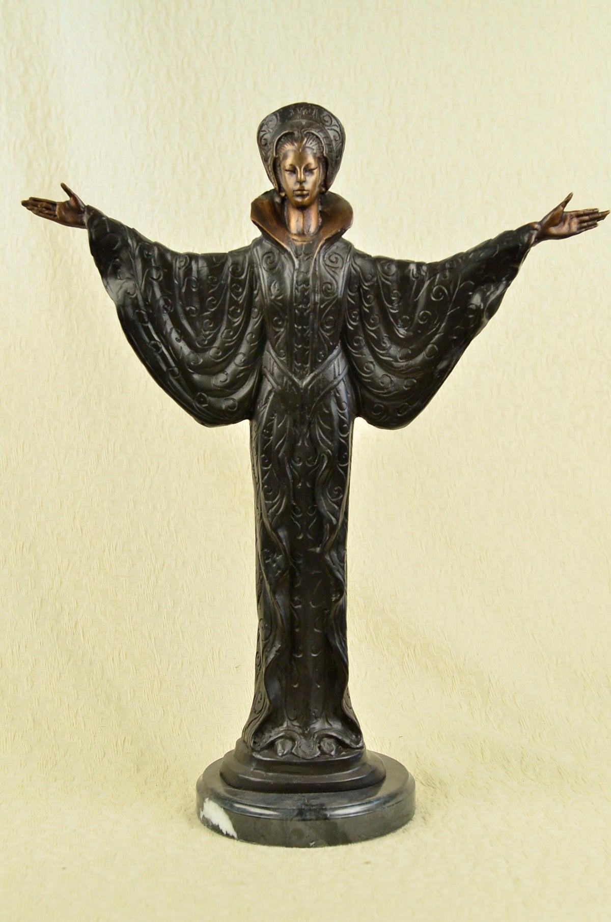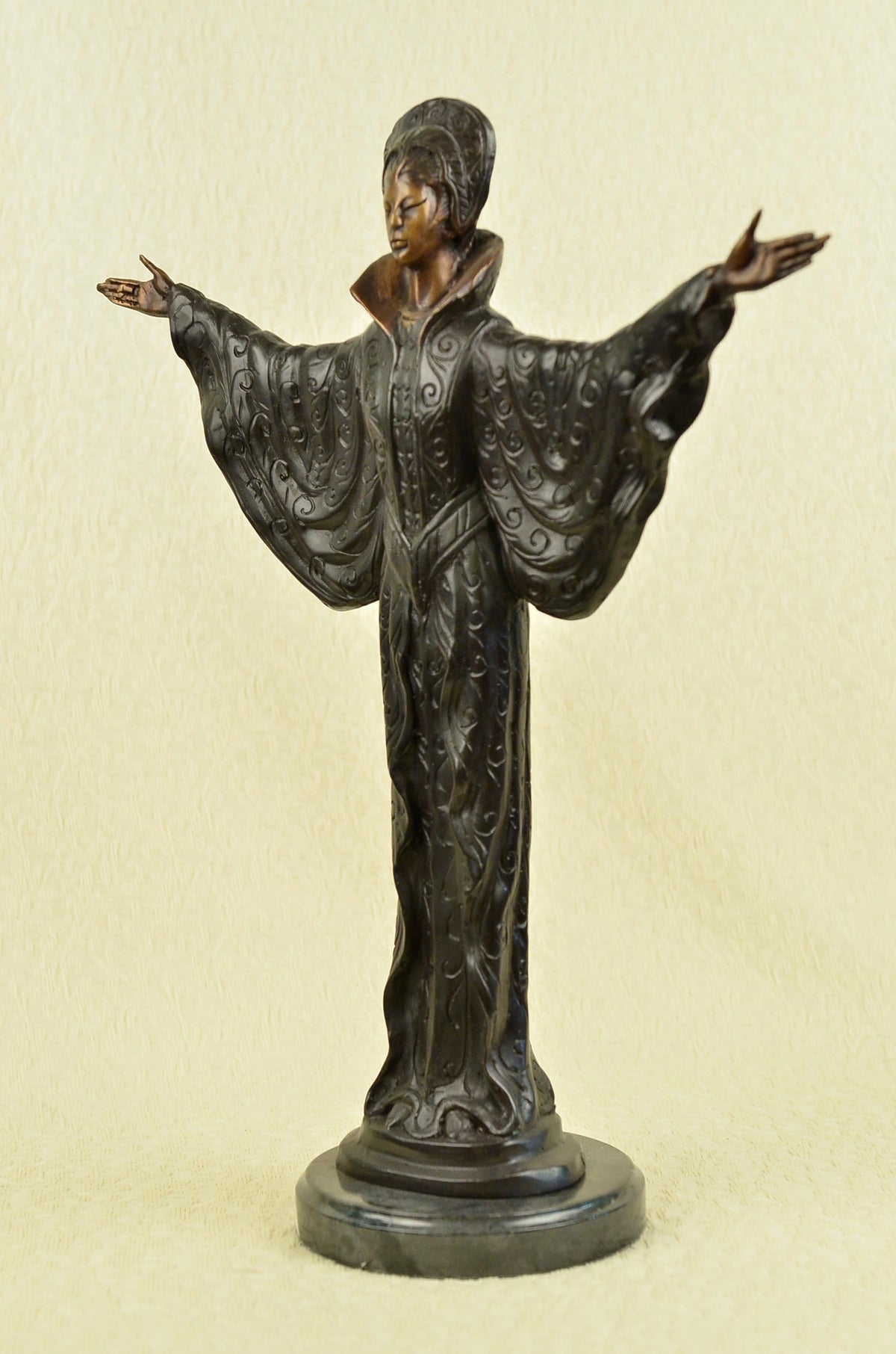 A Byzantine women prepares to Dance. She stands tall with bravery, silent confidence and stunning beauty on a grassy hill top. Her full eagle-feather and beaded war bonnet covers her head. The feathers round her head, fully extended upright. 100% bronze and handmade, this sculpture was cast using the “Lost Wax Method” and is mounted on a round black marble base.Original or Reproduction: Reproduction