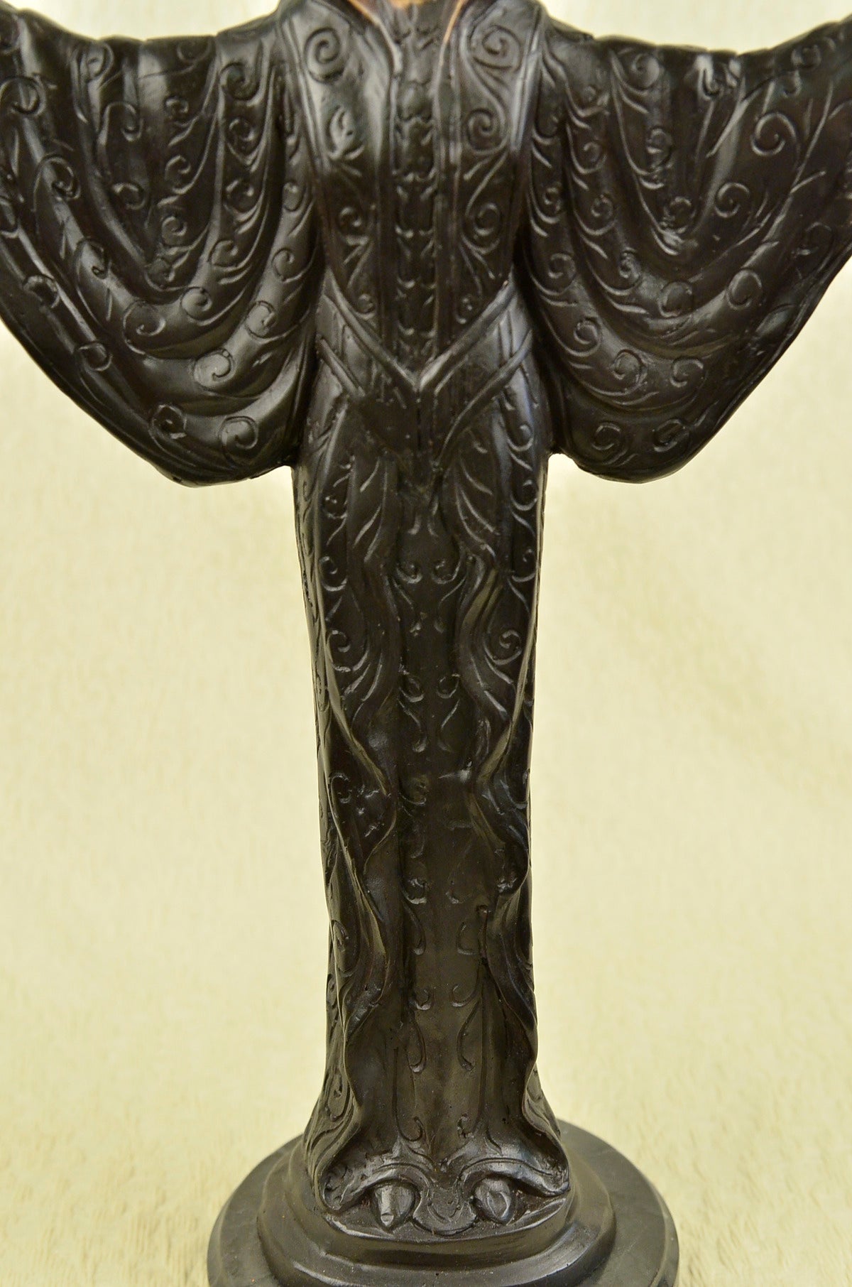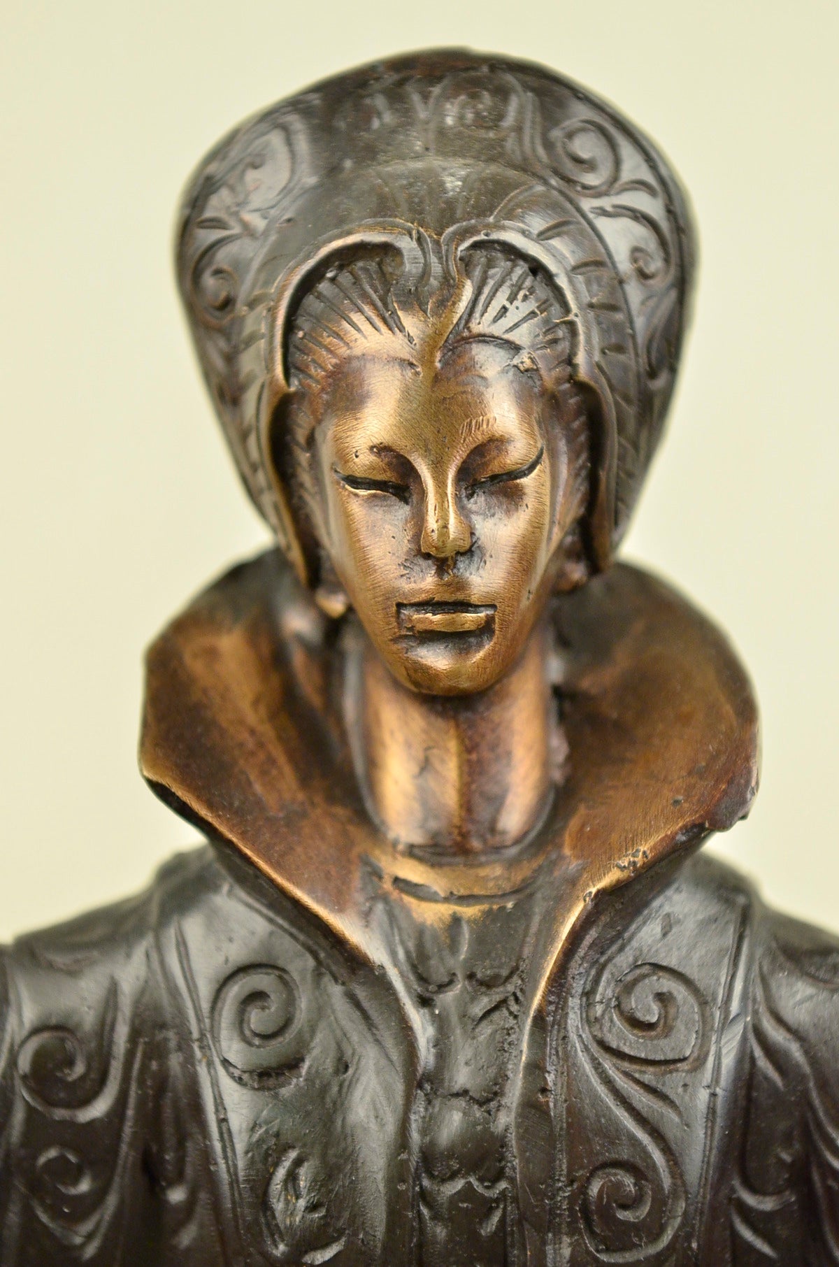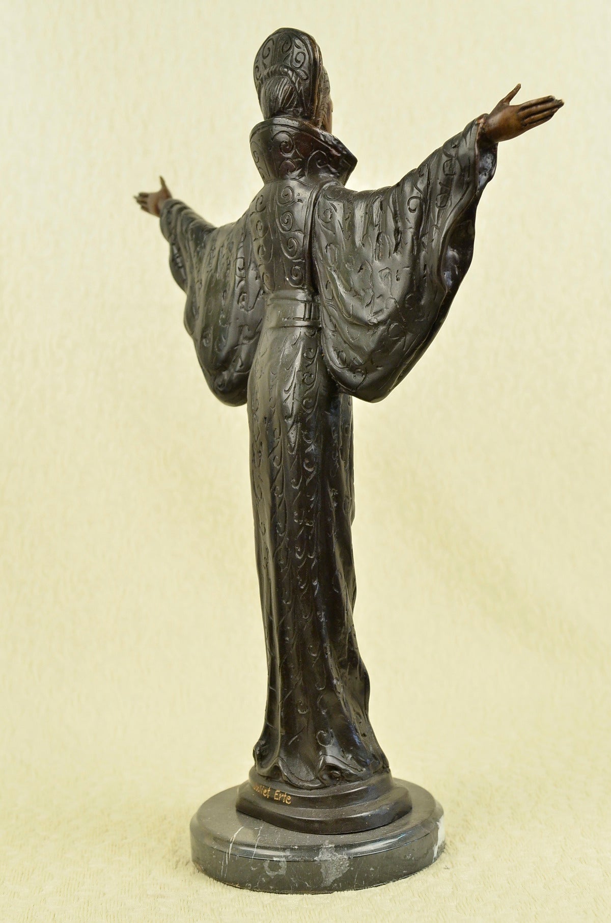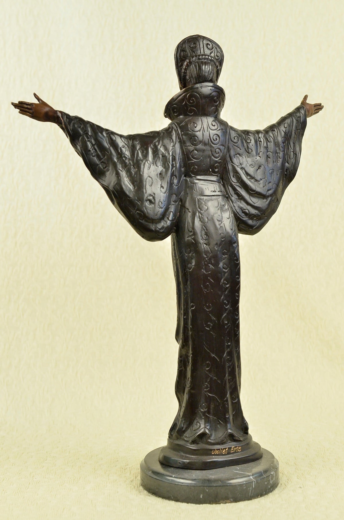 A Byzantine women prepares to Dance. She stands tall with bravery, silent confidence and stunning beauty on a grassy hill top. Her full eagle-feather and beaded war bonnet covers her head. The feathers round her head, fully extended upright. 100% bronze and handmade, this sculpture was cast using the “Lost Wax Method” and is mounted on a round black marble base.Original or Reproduction: Reproduction