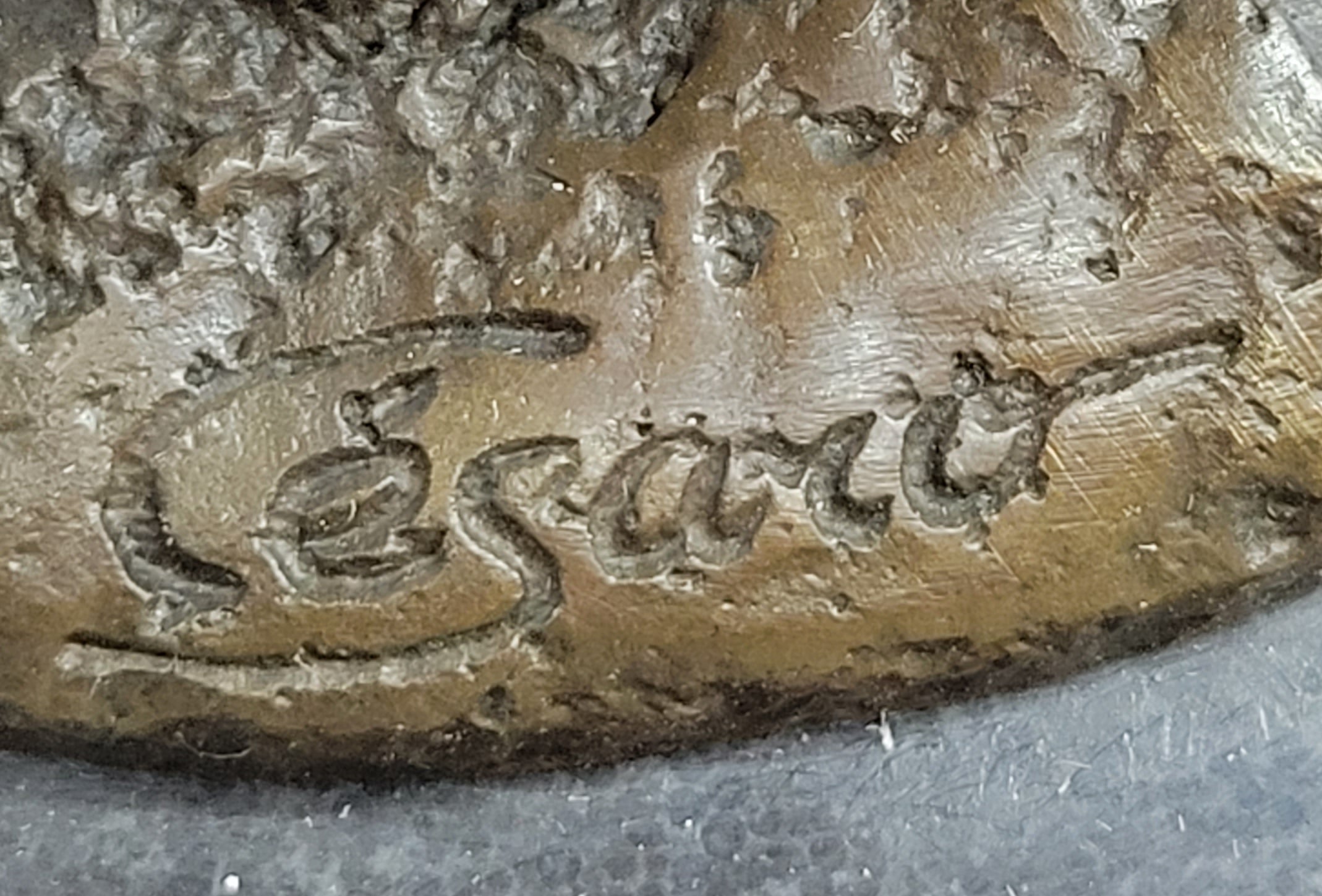 The seductive allure of the sculpture is further enhanced by the choice of a brown patina finish, which adds depth and character to the artwork while ensuring its long-lasting preservation. As the viewer beholds the figure lying on a black marble base, they are drawn into a world where desire and passion are palpable. The artist Cesaro's signature lends authenticity to this exquisite work of art, emphasizing its uniqueness and collectible value.