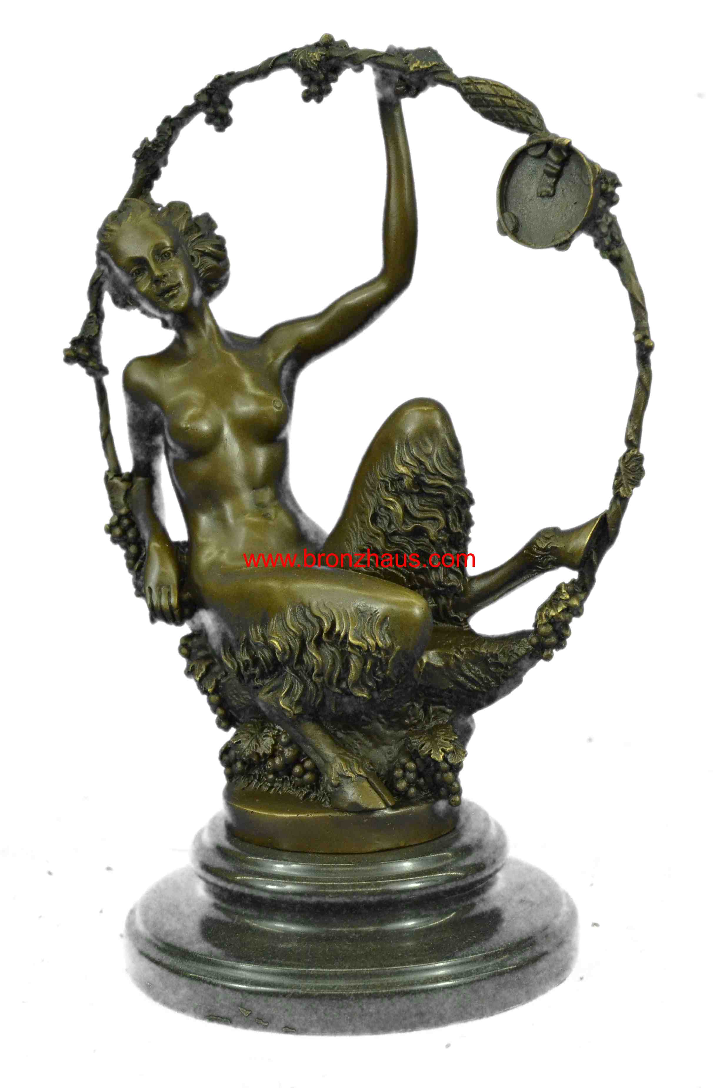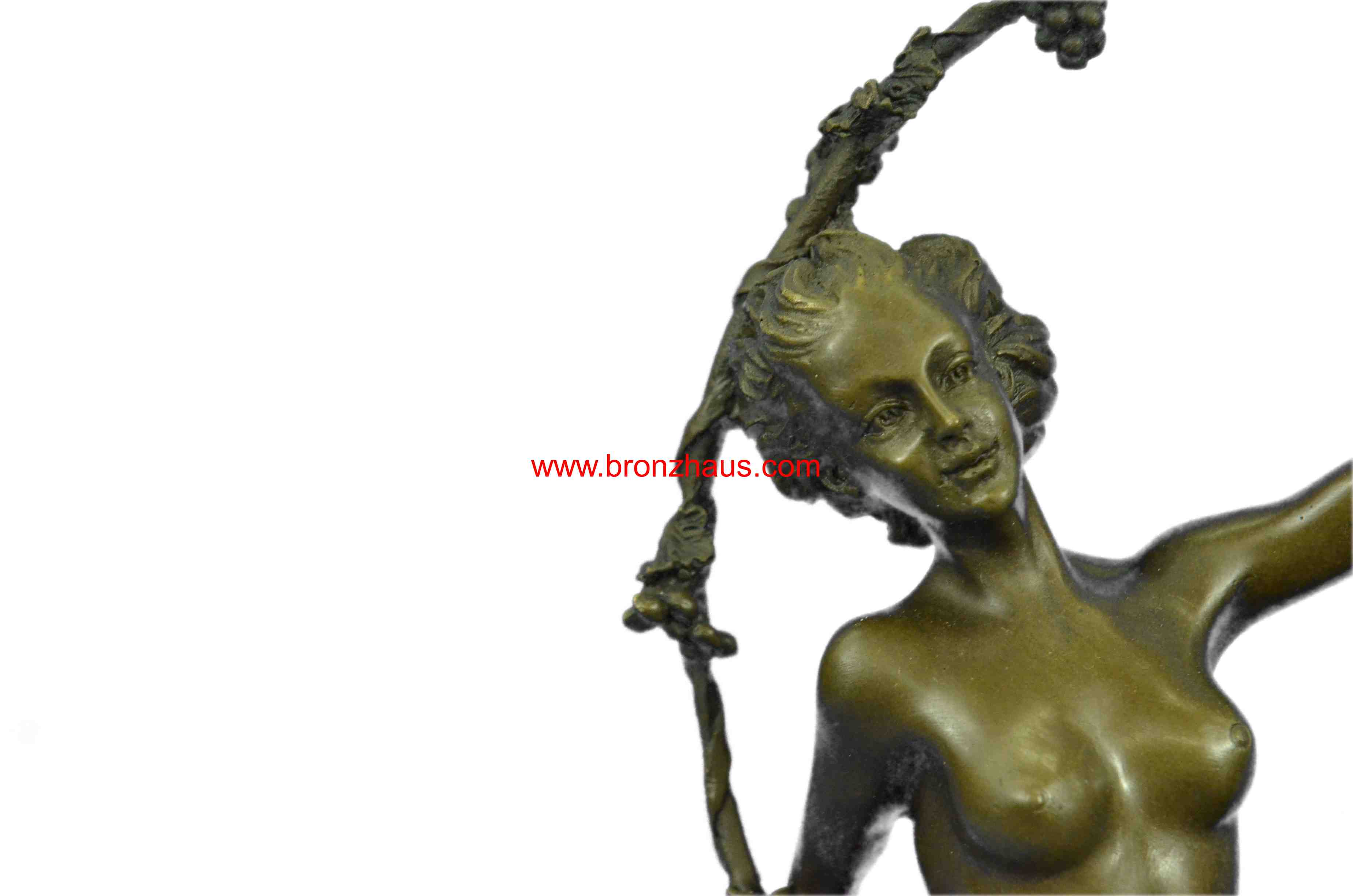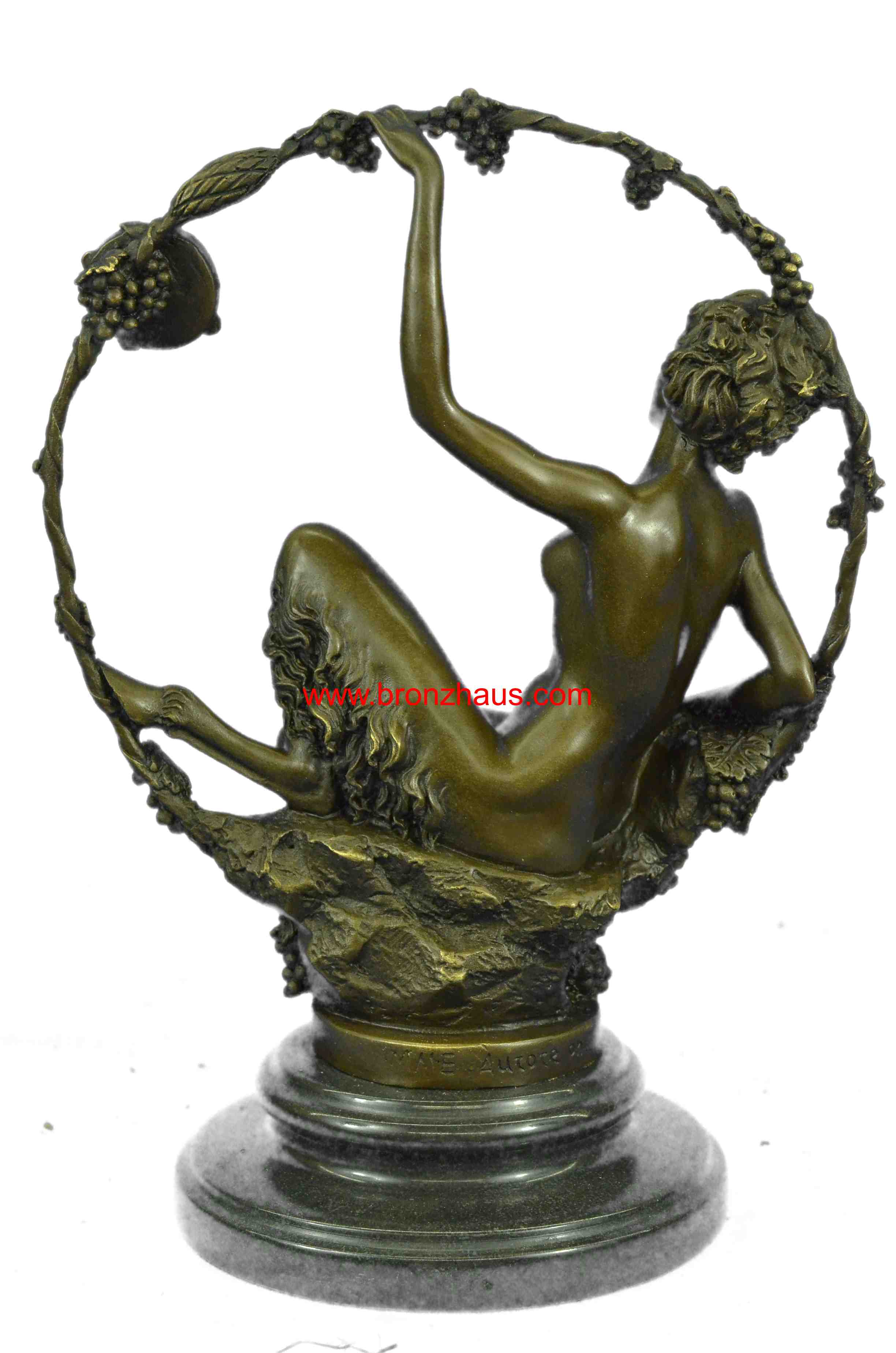 You are bidding on a fabulous old Art Nouveau hot cast bronze statue of a female satyr! This piece is signed by the artist in the bronze: Aurore Onu, (French sculptor, working from about 1895-1925). T is another stamp after the signature which is probably the foundry. It is a very rare and heavy piece, weighing about 9 pounds. The bronze is 11 inches high. The detail of this beautiful svelte nude satyr lady is exquisite! She is seated and holding a festive may-ring, which is wound with grape vines and a suspended a tambourine. Overall condition is excellent. This lovely Orneth sculpture exudes the fertile joy of rural springtime and wine! It has received many compliments and has stimulated many a conversation. Thank you for reading my description. Please check my feedback and my other auctions. Good luck bidding!Bronze Dimensions with Marble Base:Height 11" x Width 7 1/2"