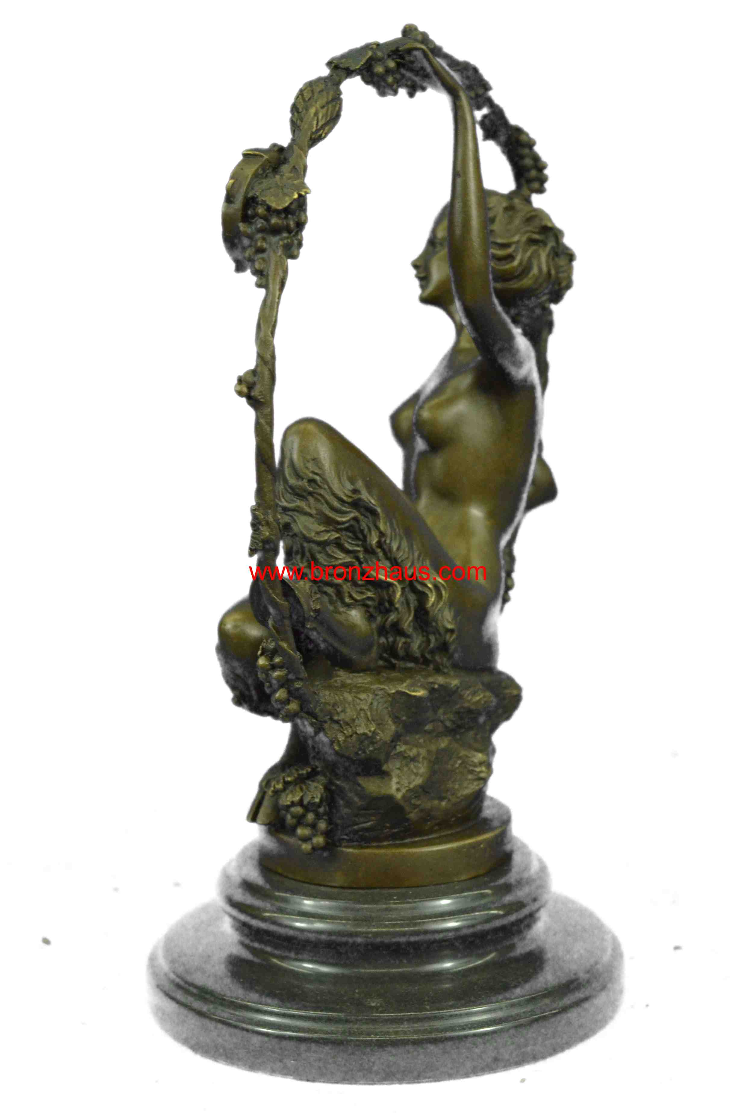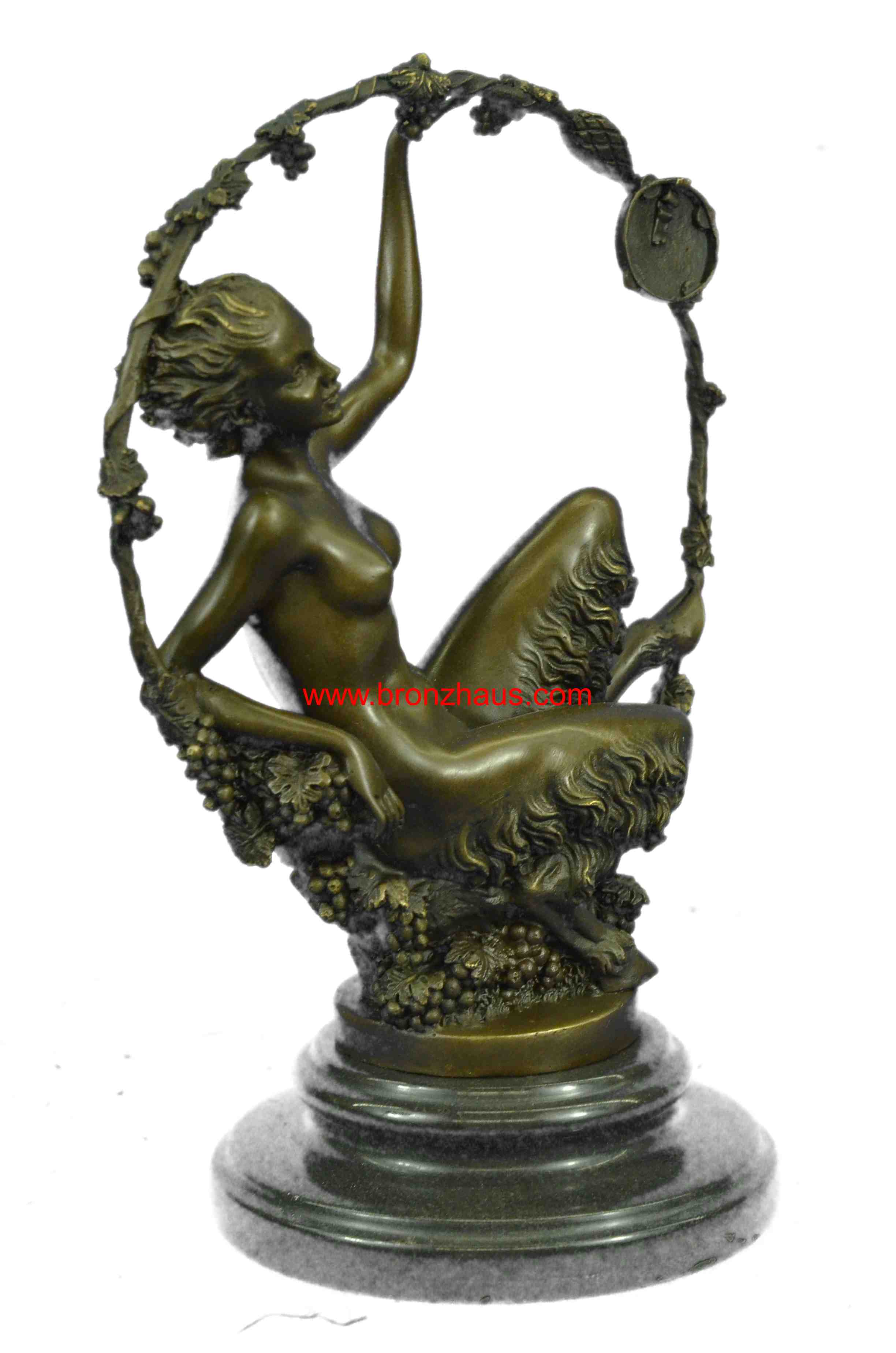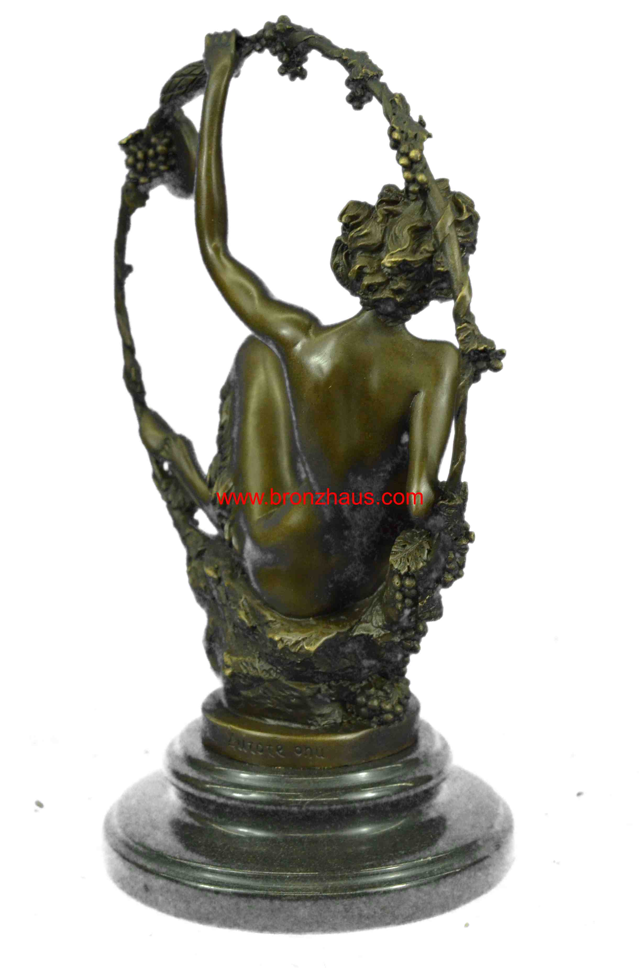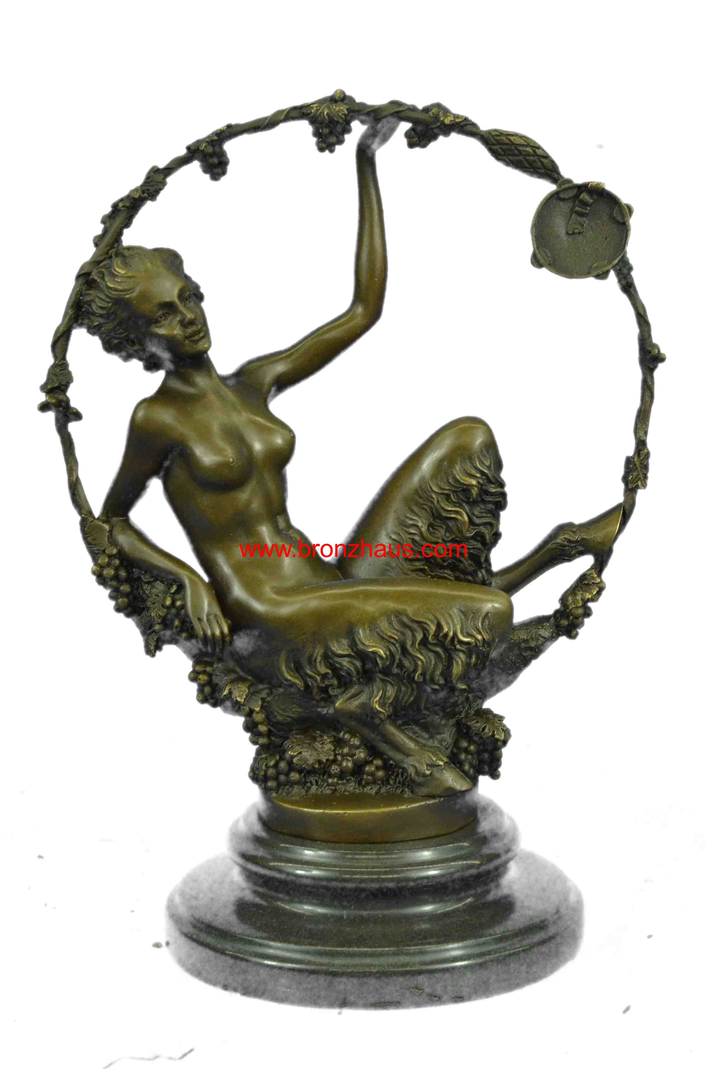 You are bidding on a fabulous old Art Nouveau hot cast bronze statue of a female satyr! This piece is signed by the artist in the bronze: Aurore Onu, (French sculptor, working from about 1895-1925). T is another stamp after the signature which is probably the foundry. It is a very rare and heavy piece, weighing about 9 pounds. The bronze is 11 inches high. The detail of this beautiful svelte nude satyr lady is exquisite! She is seated and holding a festive may-ring, which is wound with grape vines and a suspended a tambourine. Overall condition is excellent. This lovely Orneth sculpture exudes the fertile joy of rural springtime and wine! It has received many compliments and has stimulated many a conversation. Thank you for reading my description. Please check my feedback and my other auctions. Good luck bidding!Bronze Dimensions with Marble Base:Height 11" x Width 7 1/2"