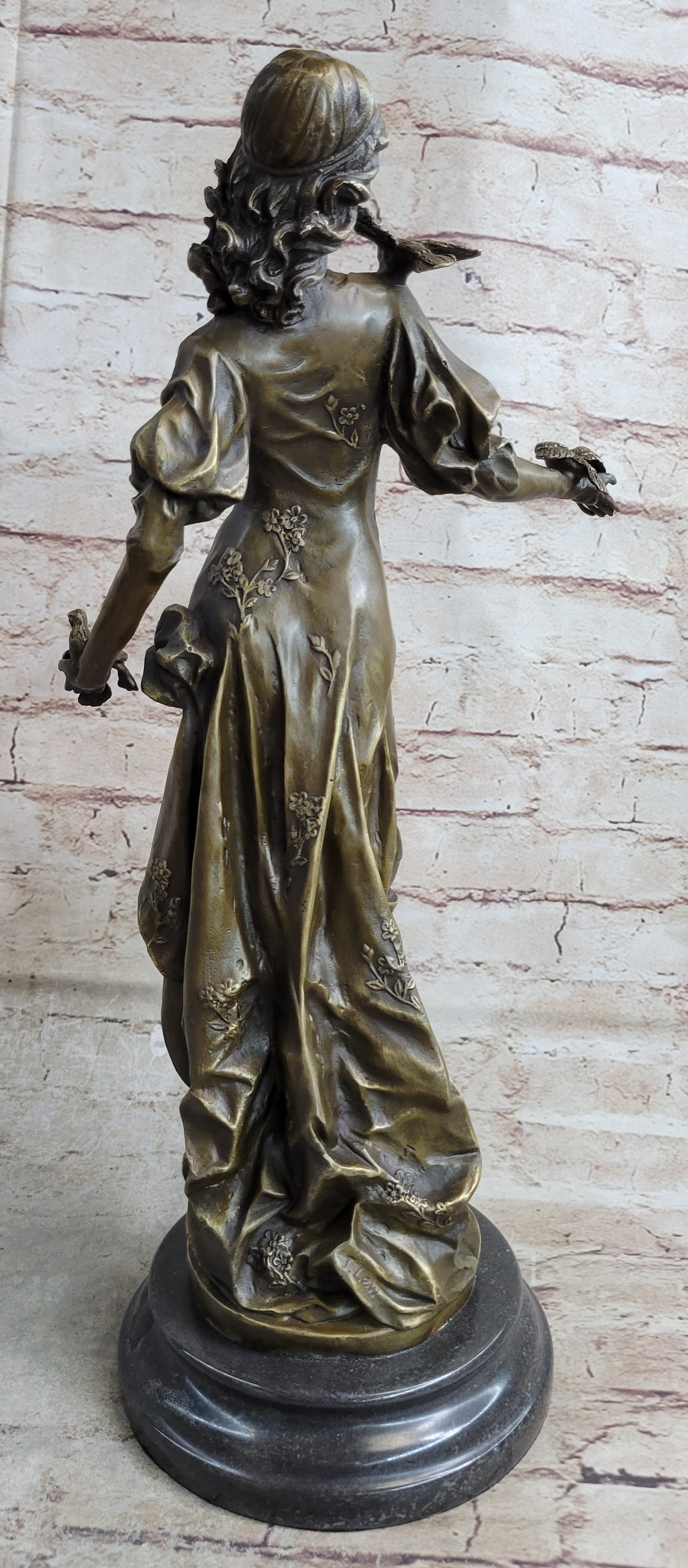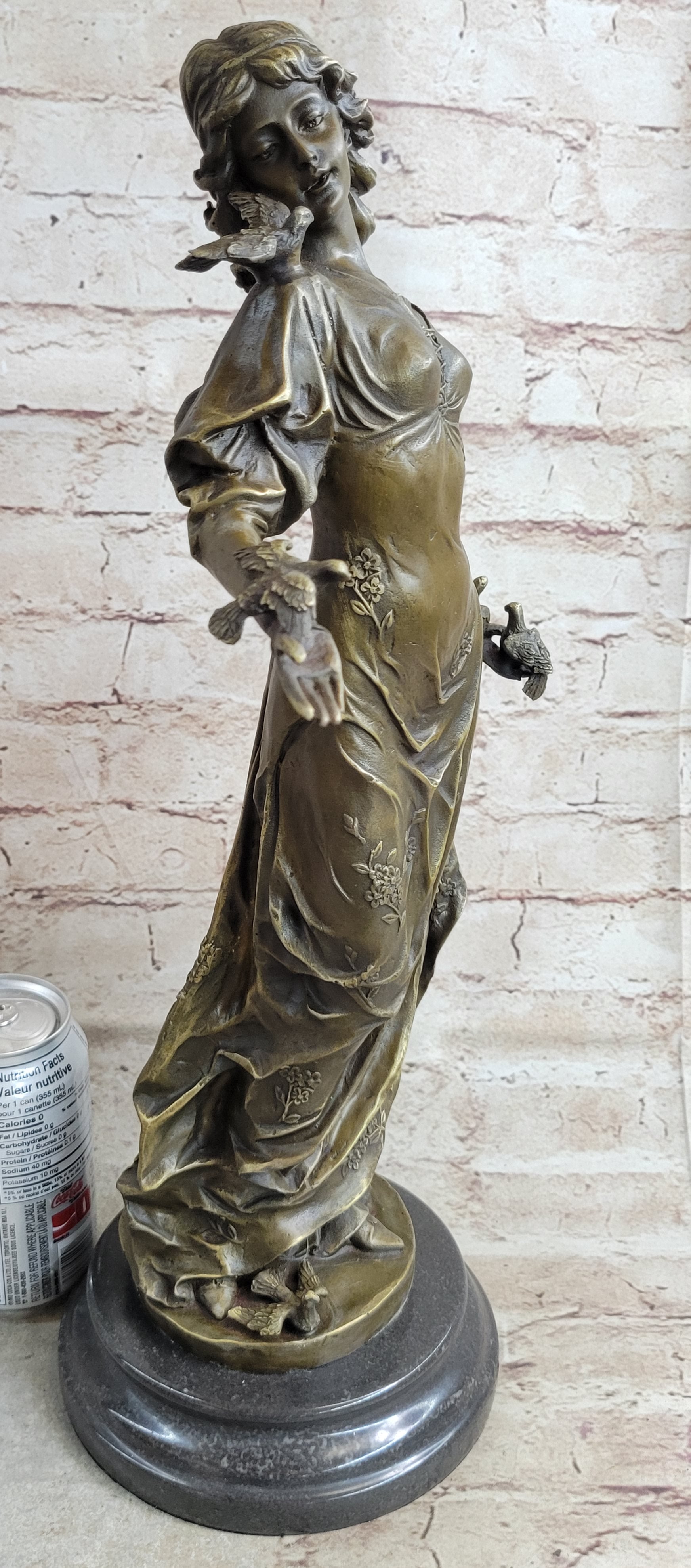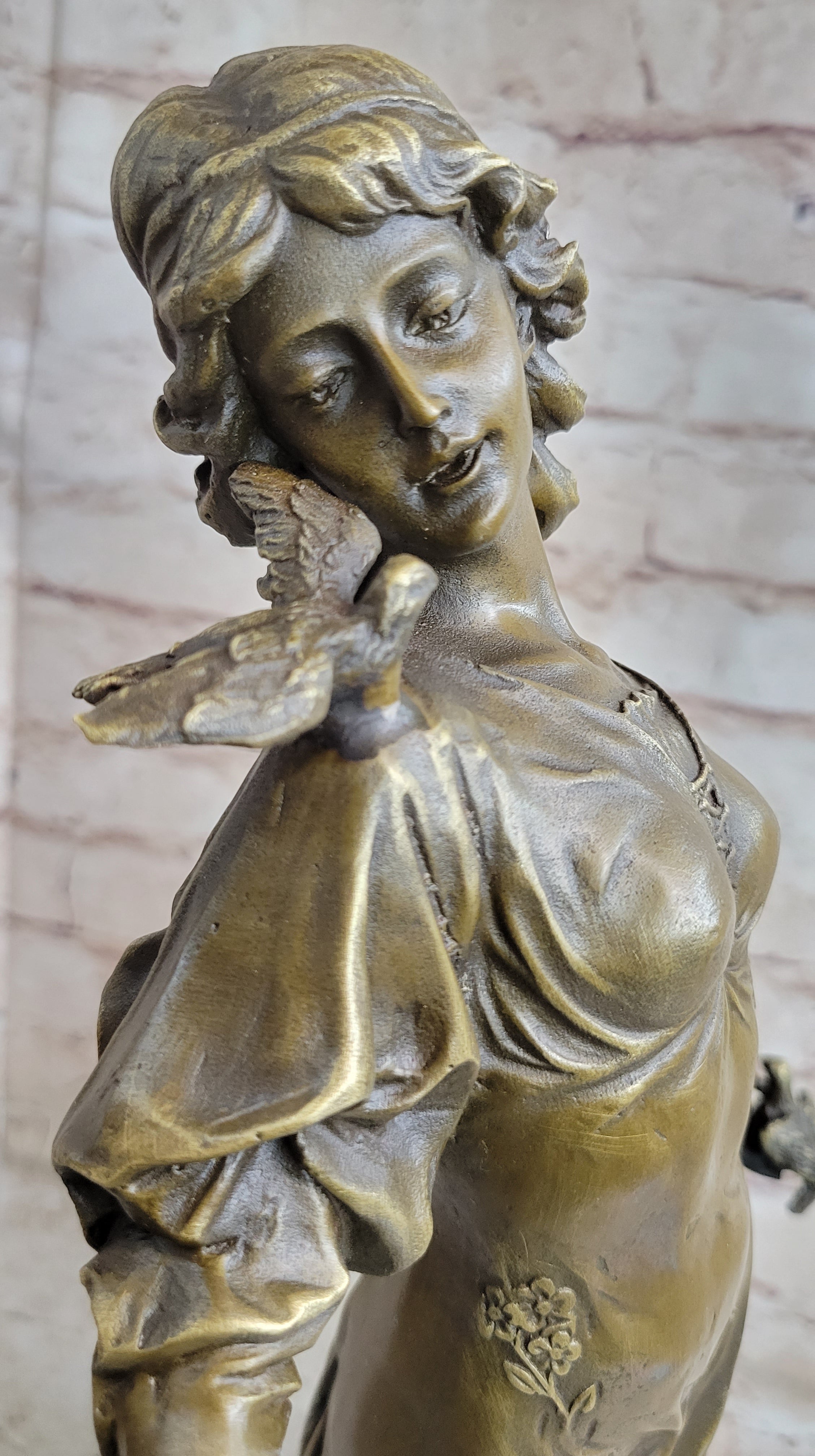 Art Nouveau Maiden with Doves Bronze Sculpture on Marble Base