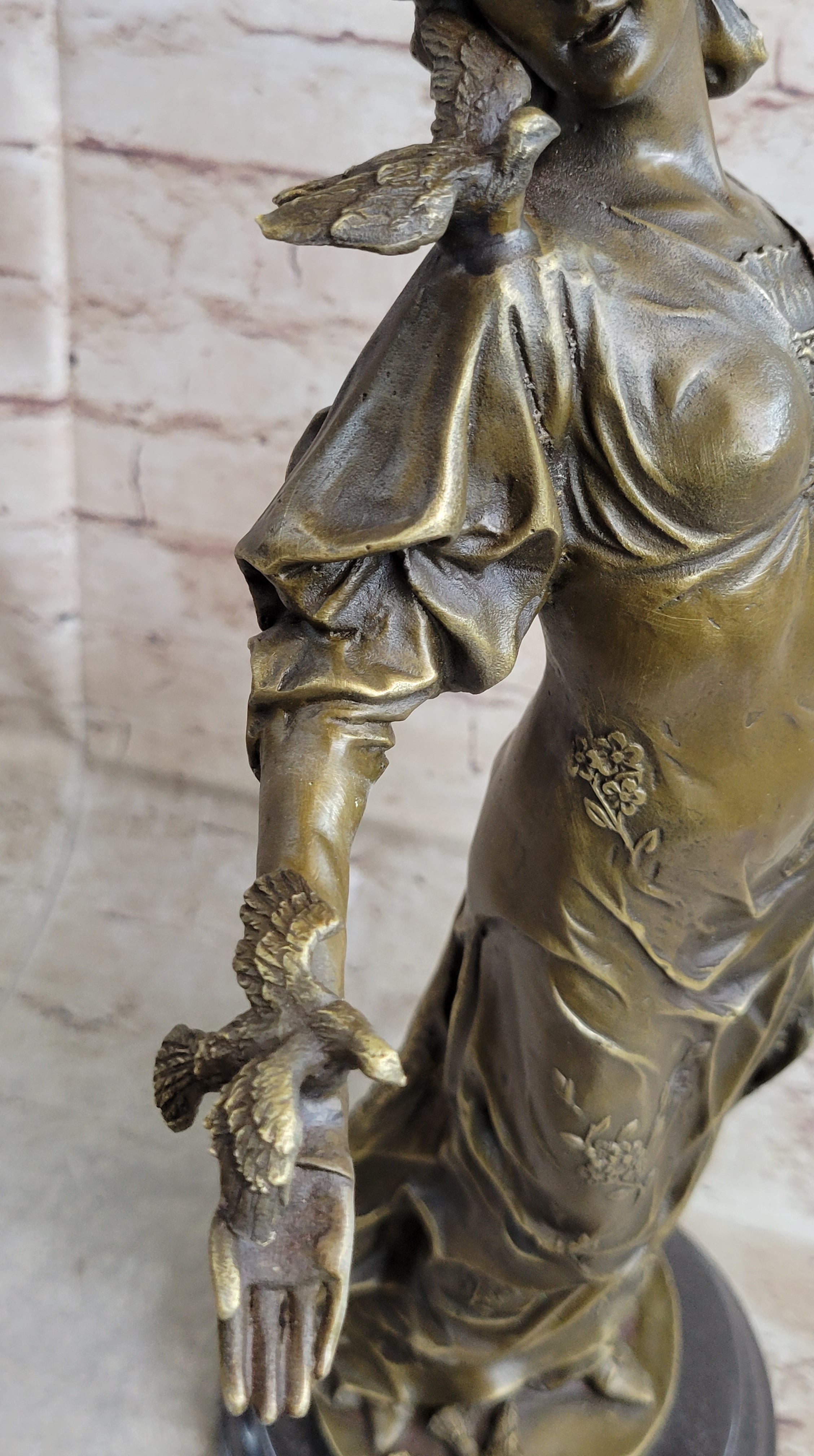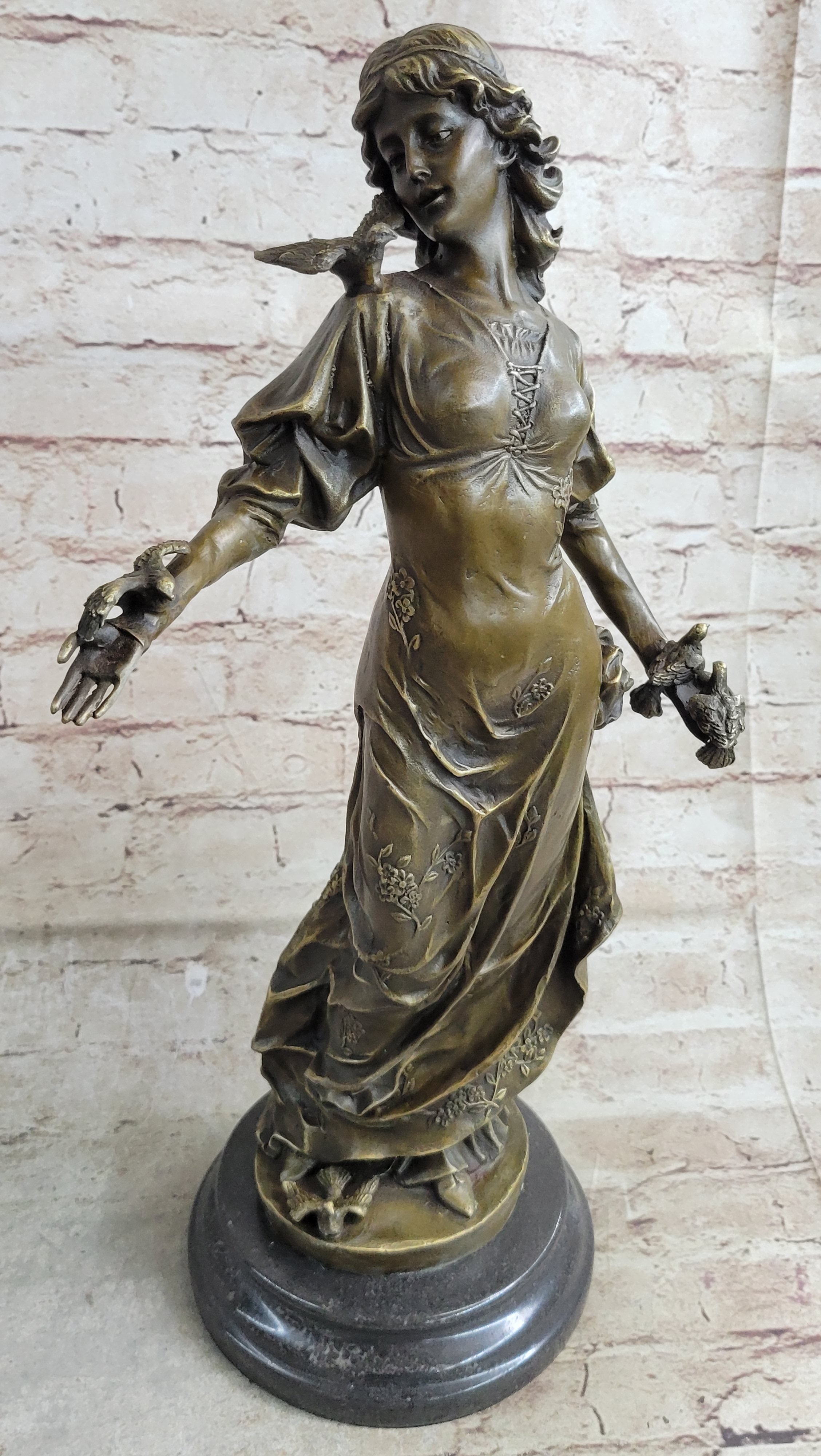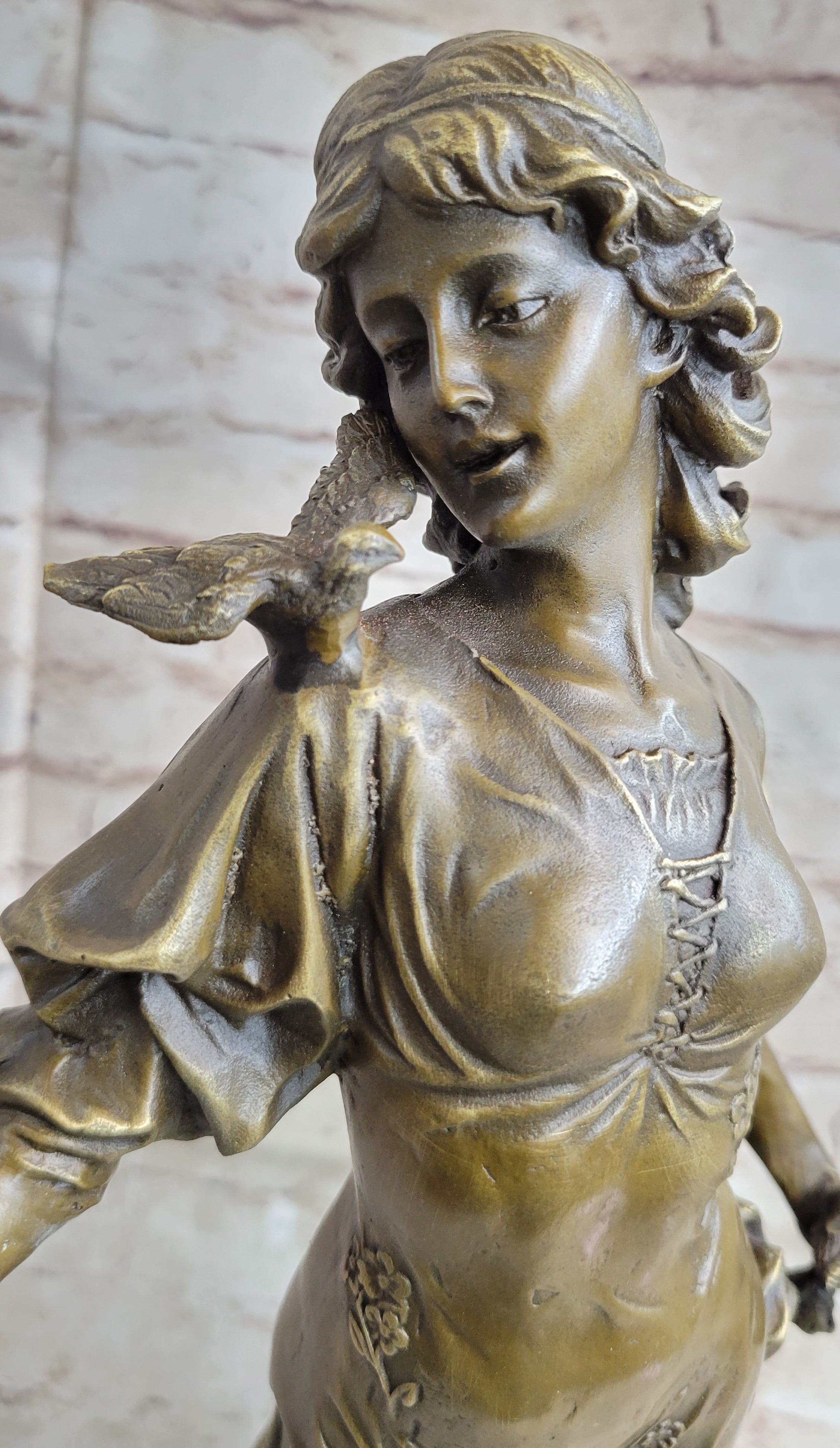 Art Nouveau Maiden with Doves Bronze Sculpture on Marble Base