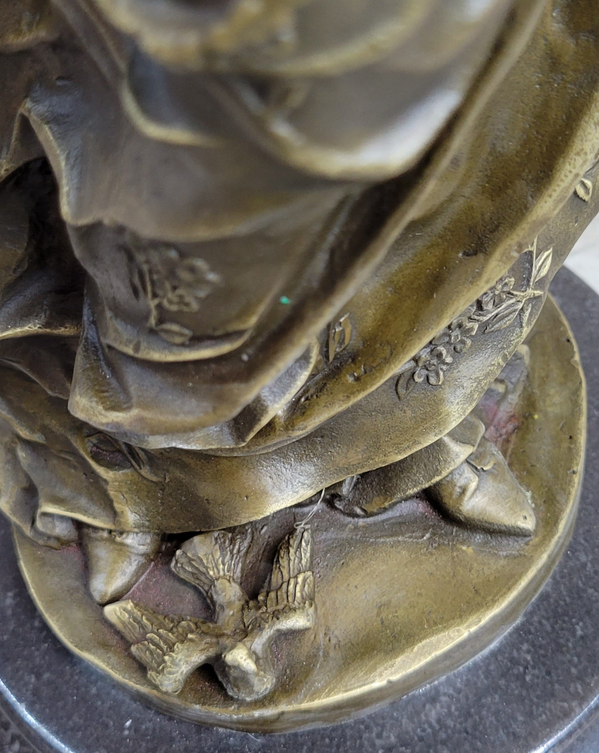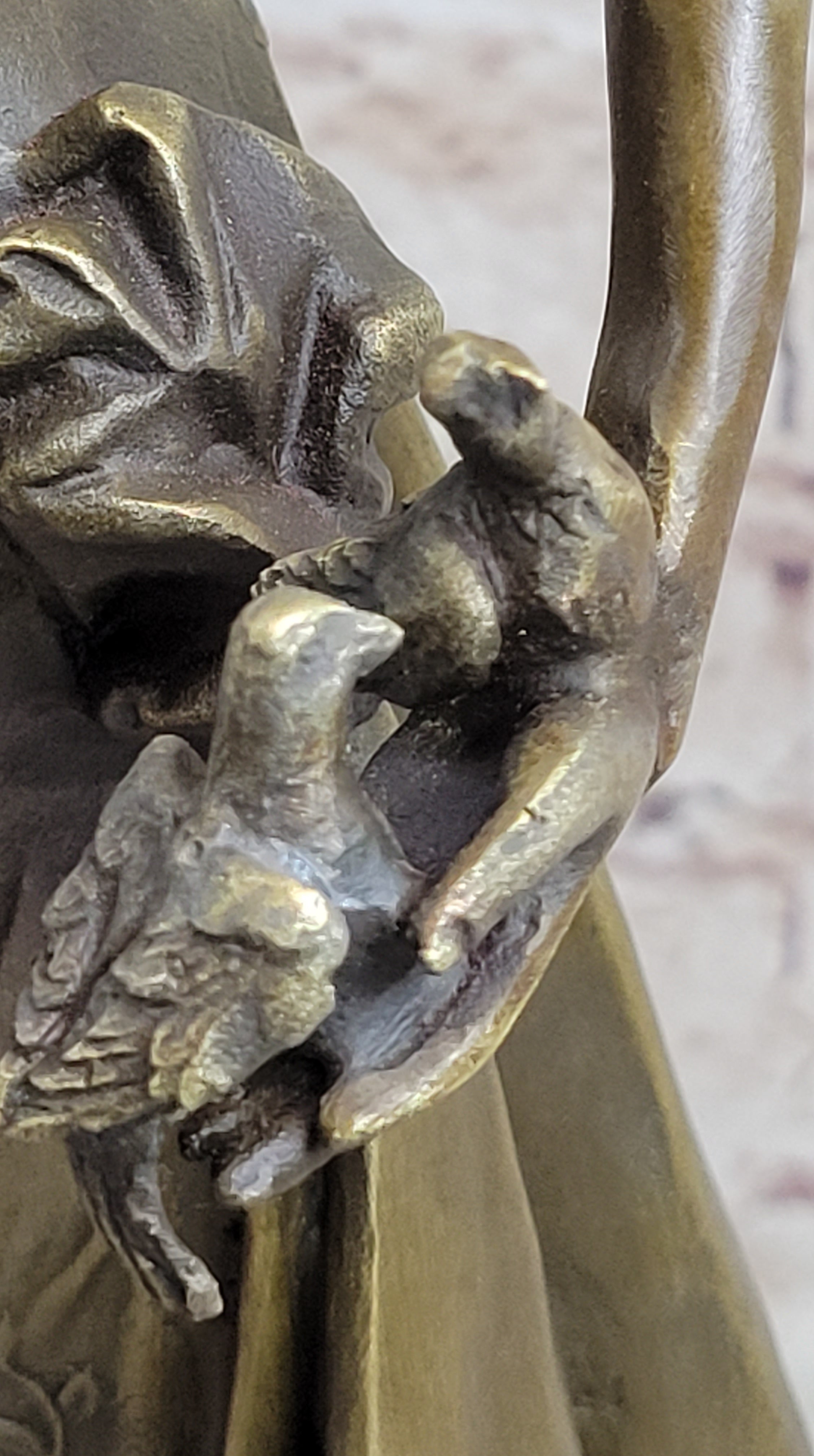 This bronze statue exudes an air of classical elegance, reminiscent of the ancient art of Classicism, as the graceful figure assumes a natural contrapposto pose. An immediate sense of warmth and compassion emanates from the sculpture, evoking a profound emotional connection. With her weight shifted to the right, she gently cradles a mourning dove against her cheek, exuding a sense of gentle solace. Her serene countenance is subtly angled, casting a tender smile upon the dove perched delicately on her left arm. The intricate details of her flowing gown, meticulously crafted using the lost-wax method of casting, reflect the artist's skill and devotion to capturing the essence of beauty and grace. Adorned with a rich brown patina tarnish, the statue stands proudly atop a sleek black marble plinth, bearing the signature of the esteemed artist J. Levy.