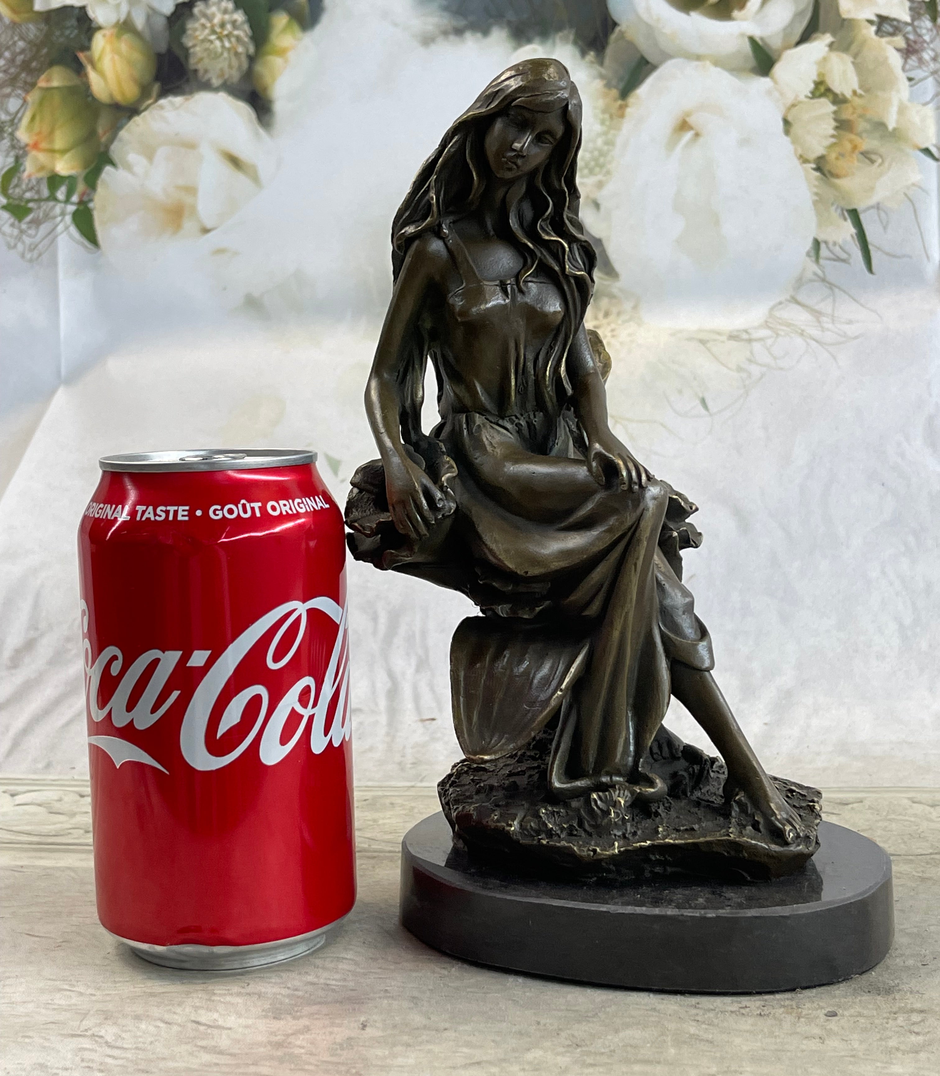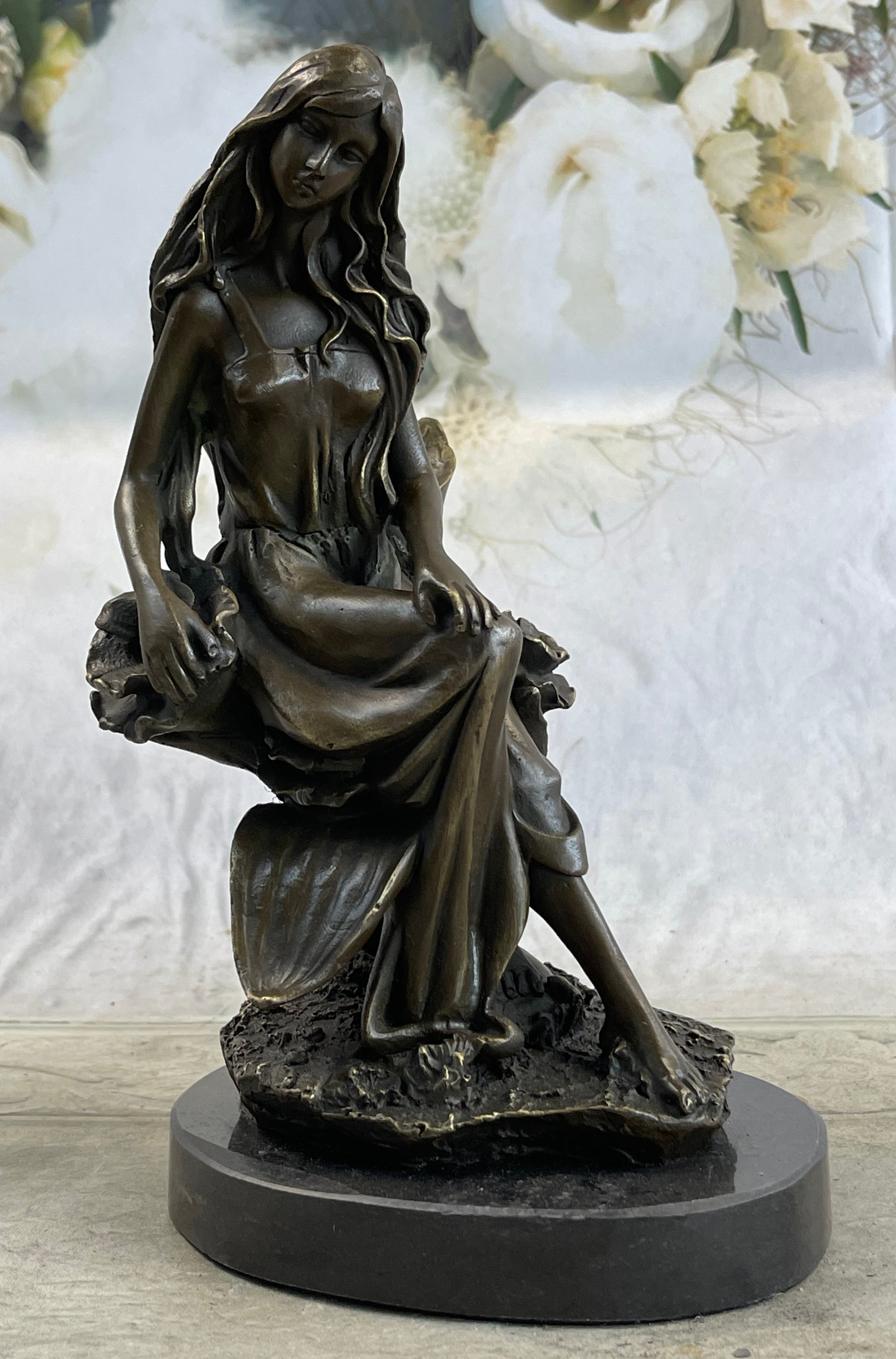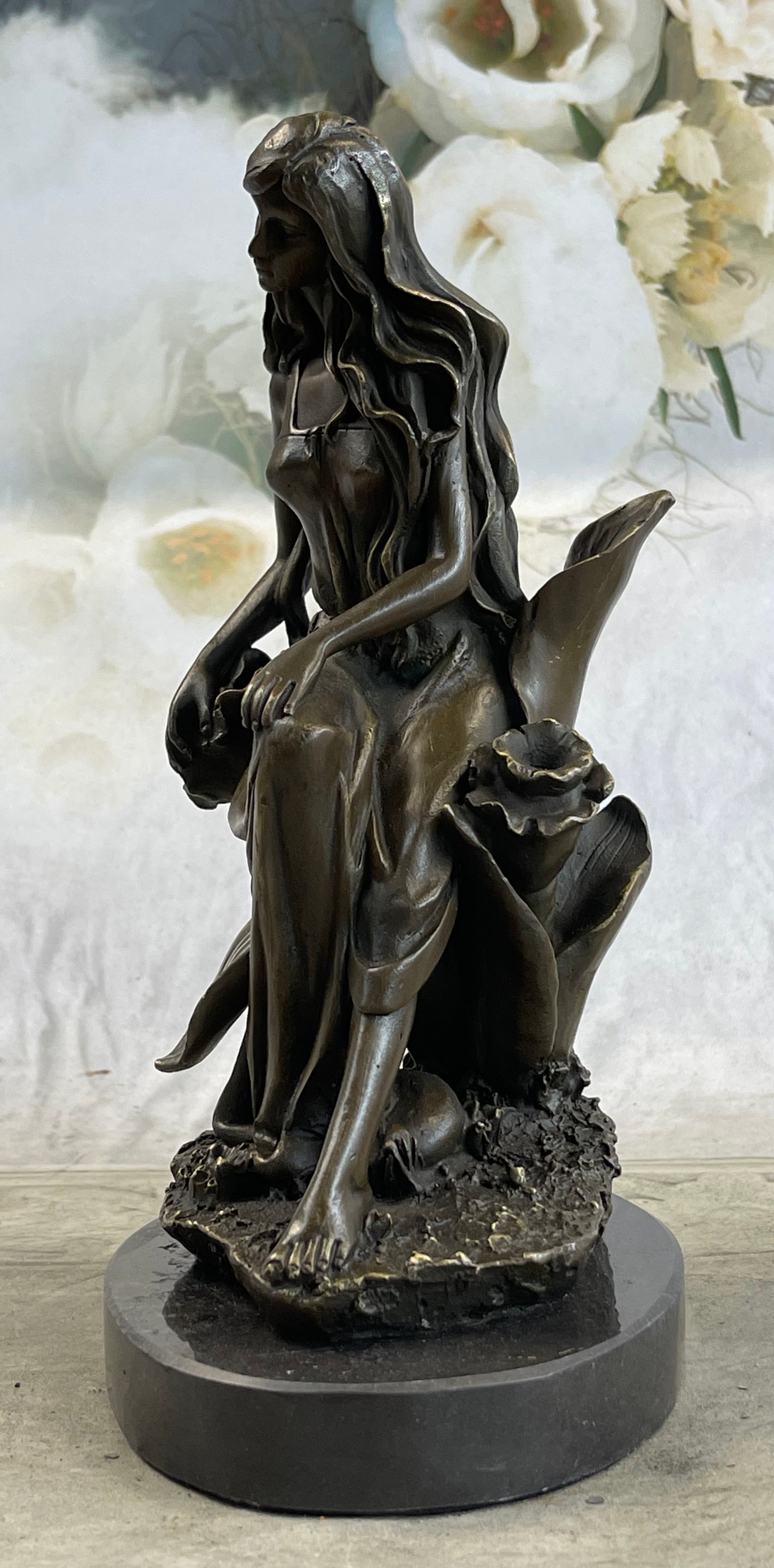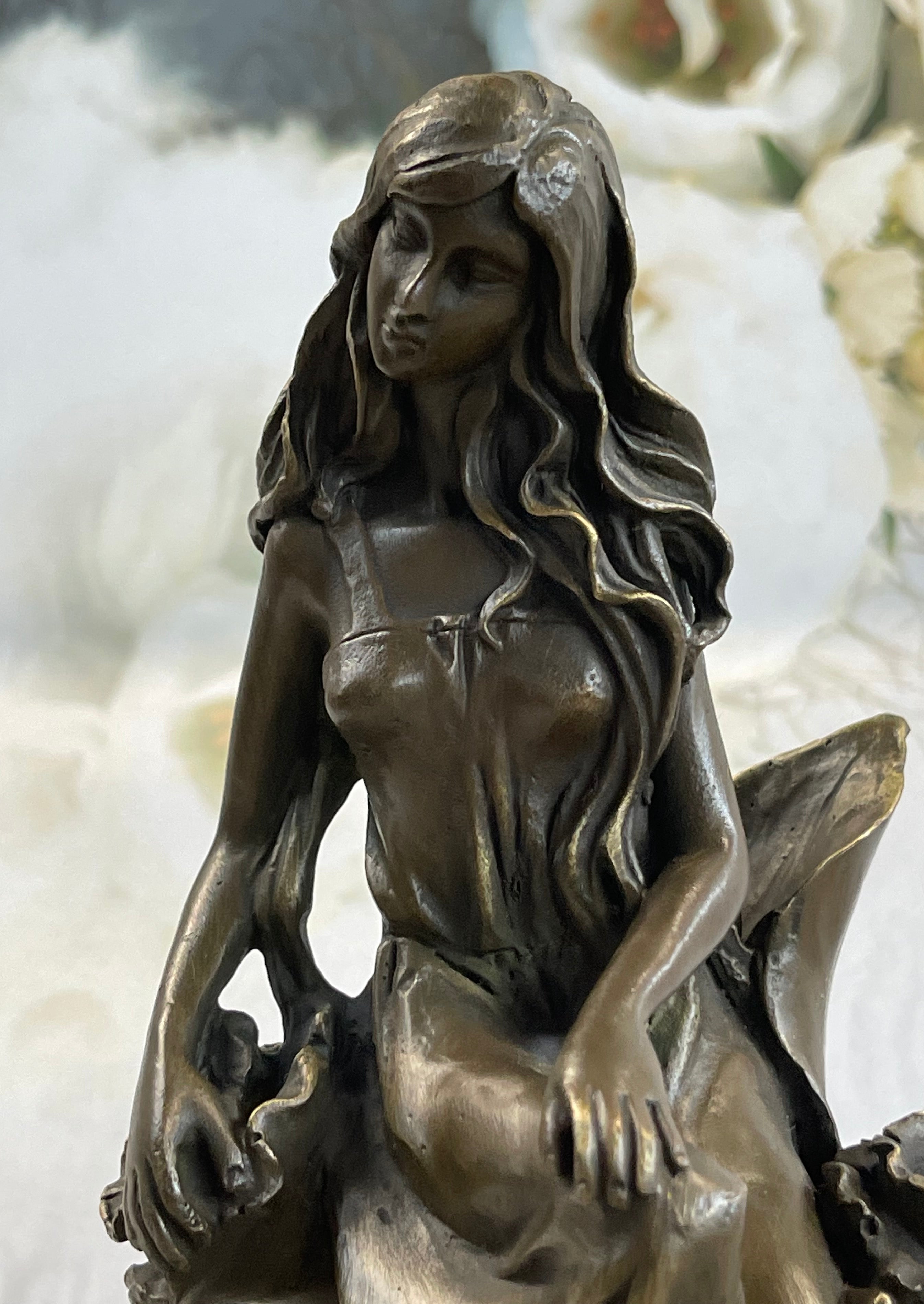 Nymph Girl Sitting on Flower Bronze Statue Sculpture Figure Fantasy 9" x 5"