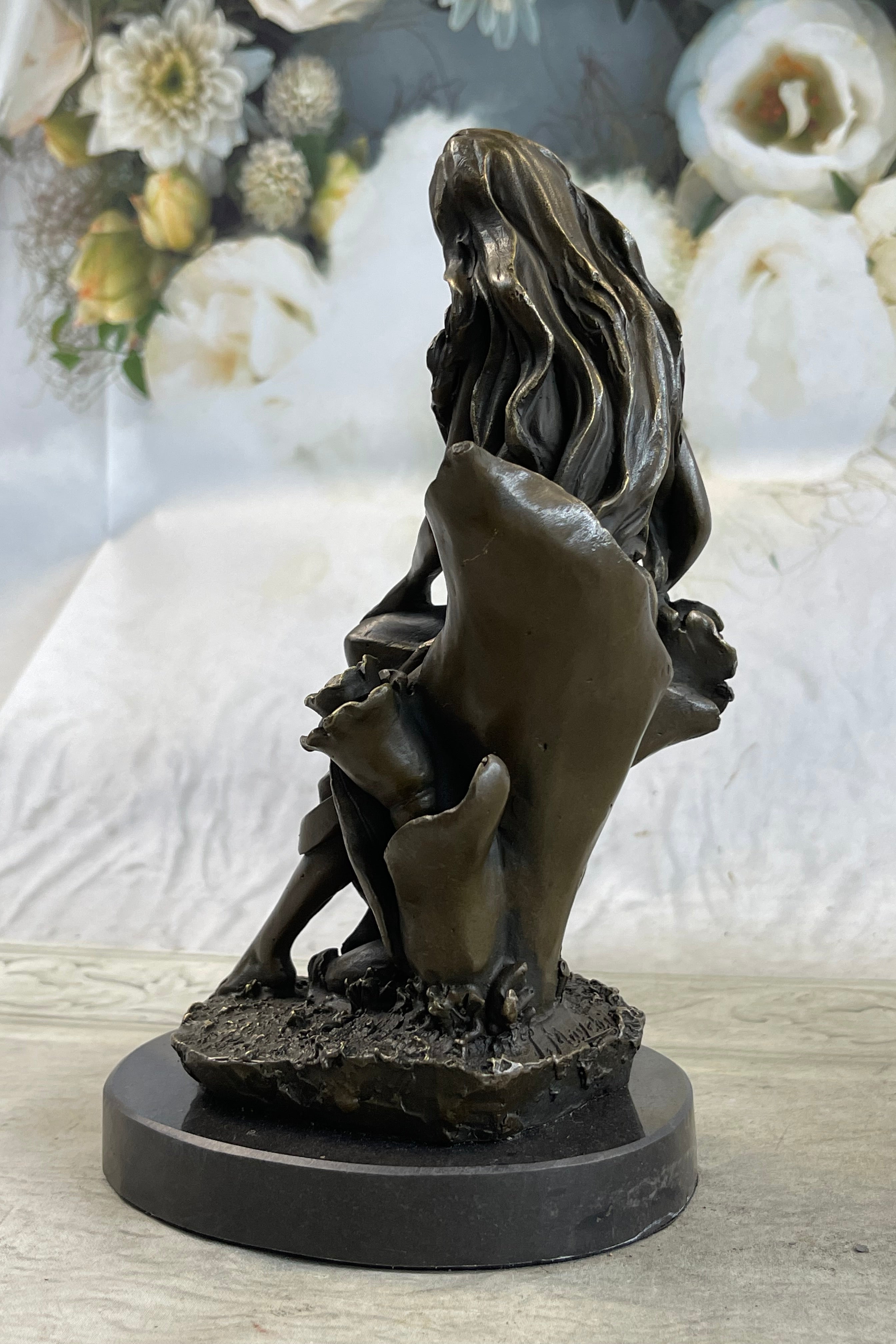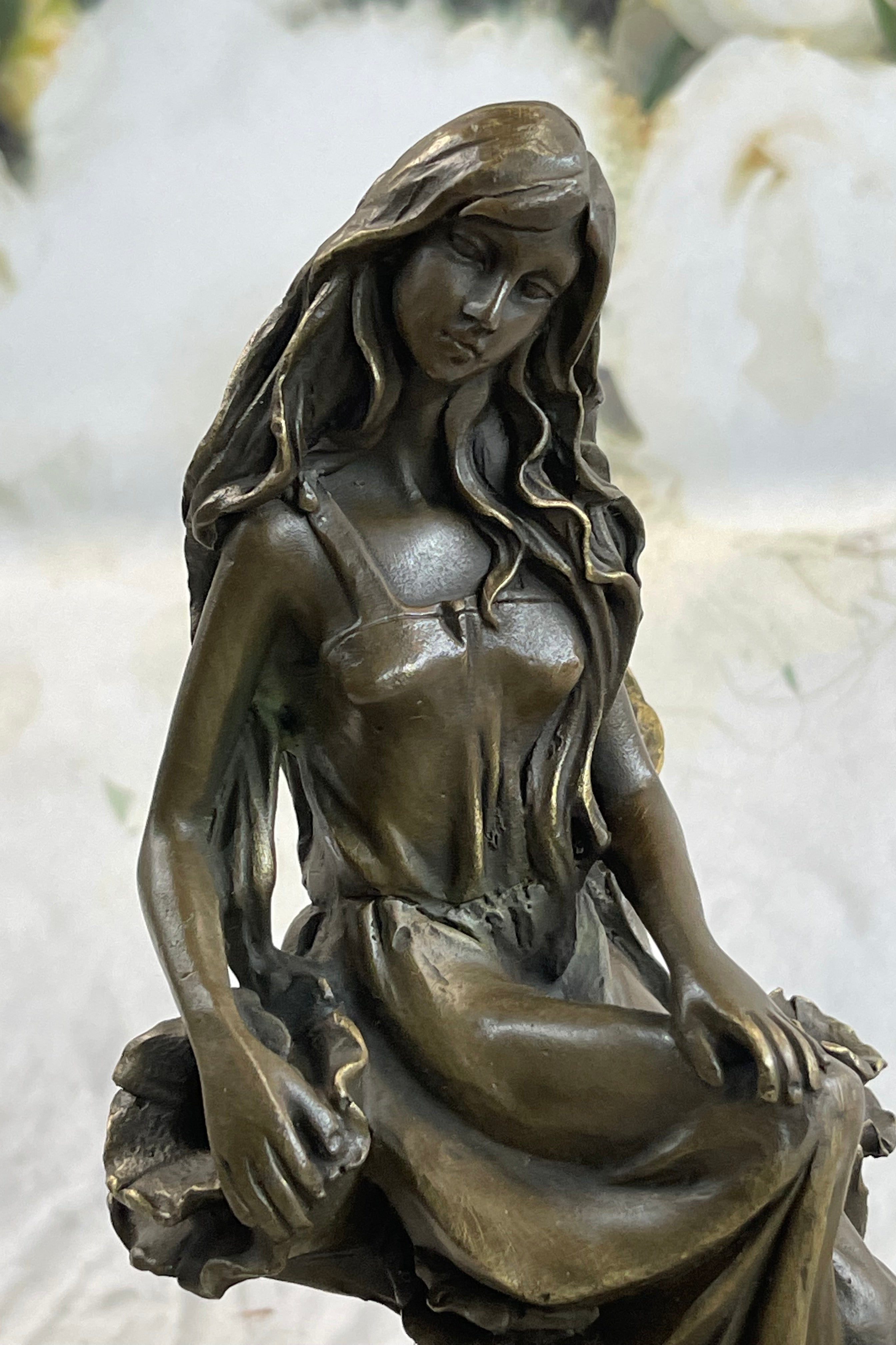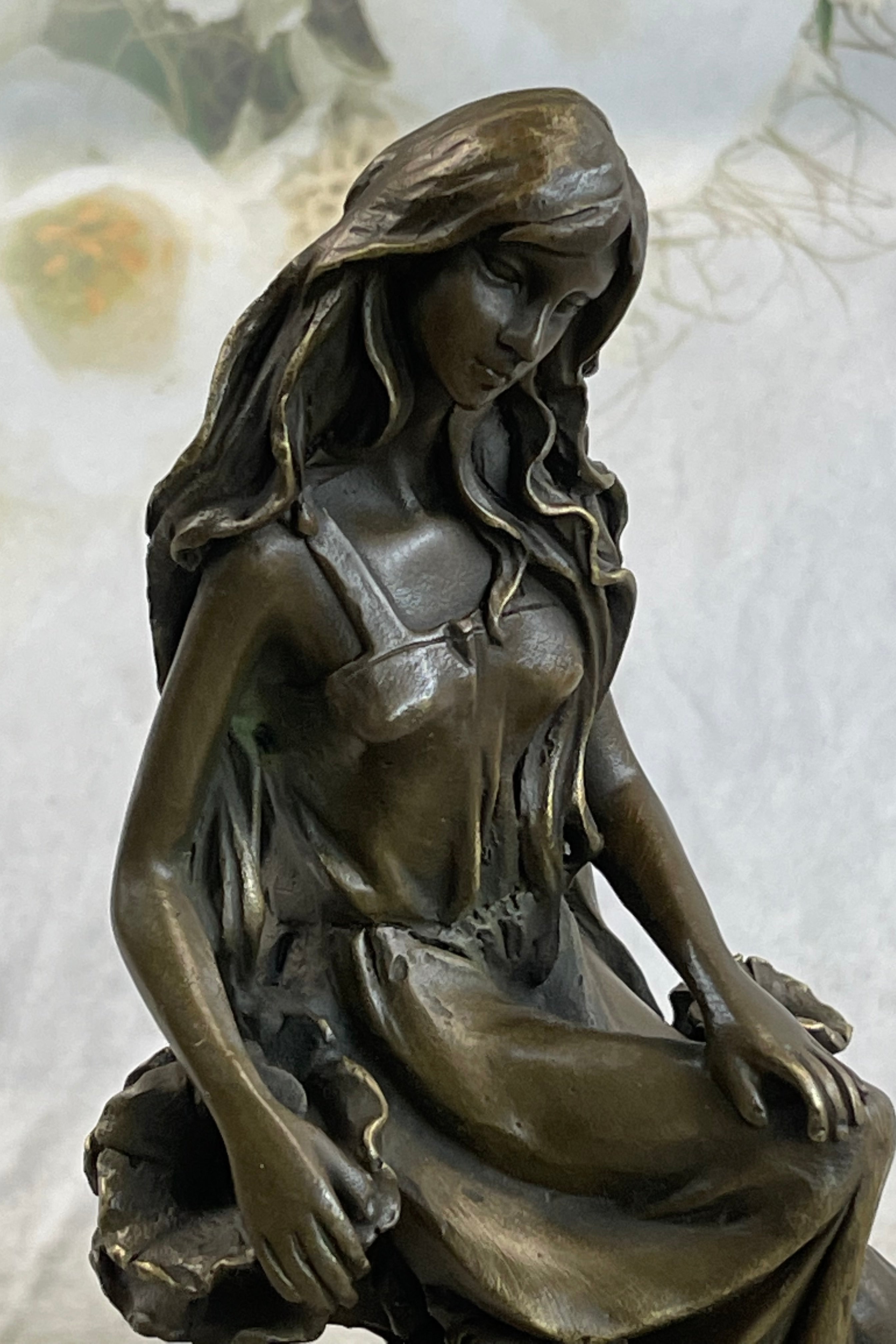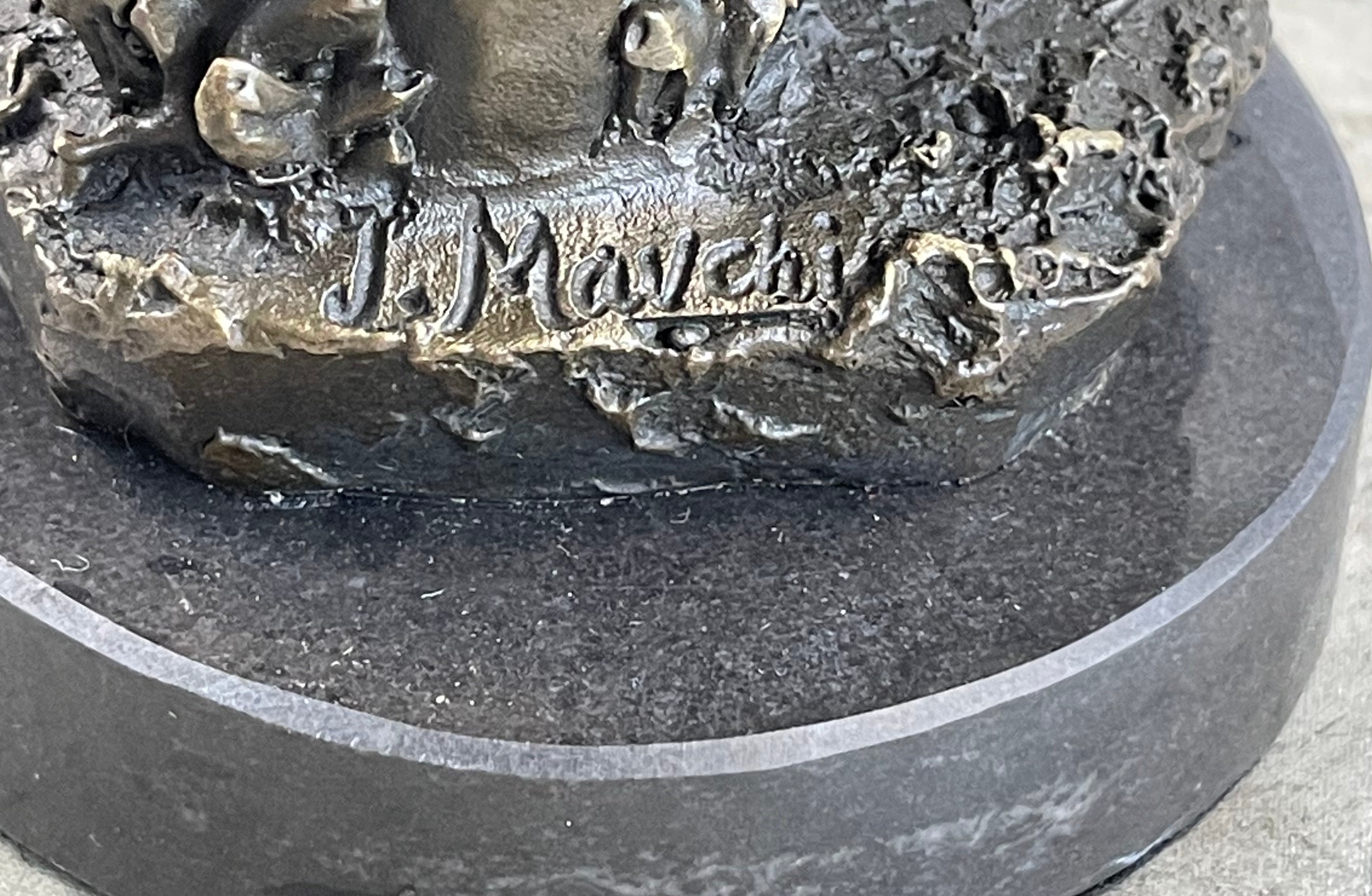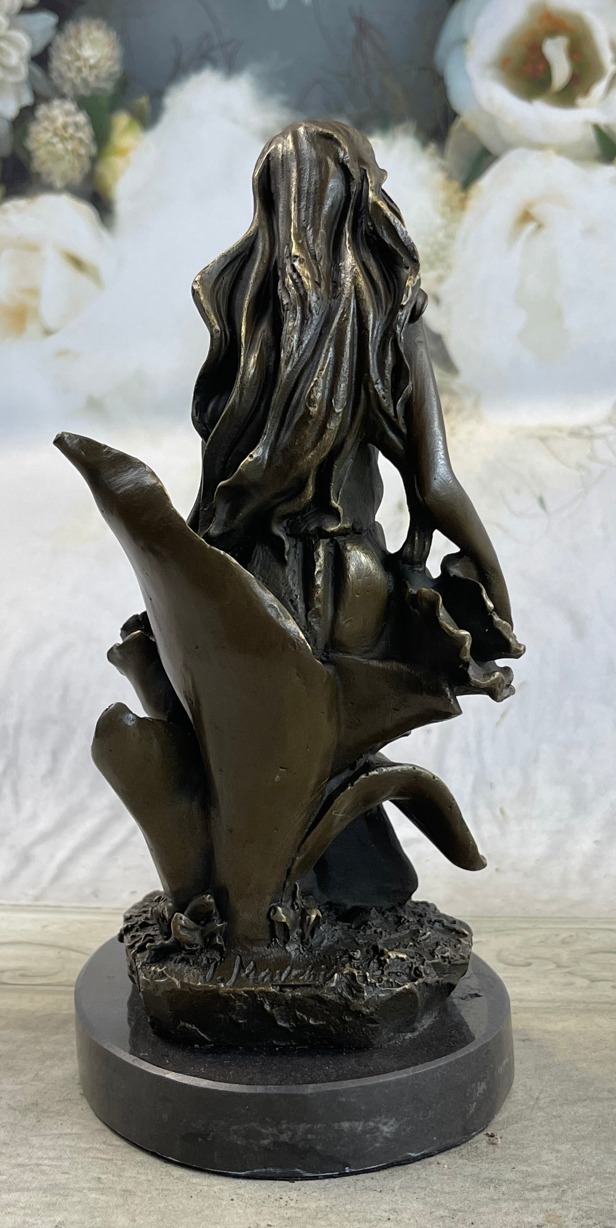 Signed by the artist Mavchi, this sculpture becomes a personal and authentic creation, a unique reflection of the artist's vision. The combination of meticulous craftsmanship, attention to detail, and the artist's signature touch makes this piece not just a representation of beauty, but a harmonious blend of nature and art. Placed in any setting, this sculpture becomes a focal point, inviting viewers to appreciate the delicate balance between the human form and the beauty of nature, frozen in a moment of contemplation.Bronze Dimensions with Marble Base: Height 9" X Width 5"