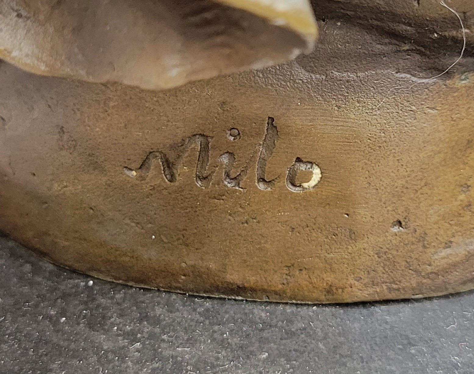 Handcrafted with meticulous attention to detail, this sculpture is made of 100% bronze and showcases a captivating brown patina. It was skillfully cast using the renowned "Lost Wax Method" and is elegantly displayed on a round black marble base. This remarkable artwork bears the signature of the esteemed artist, Milo.Bronze Dimensions with Marble Base: Height 26.5" X Width 10"