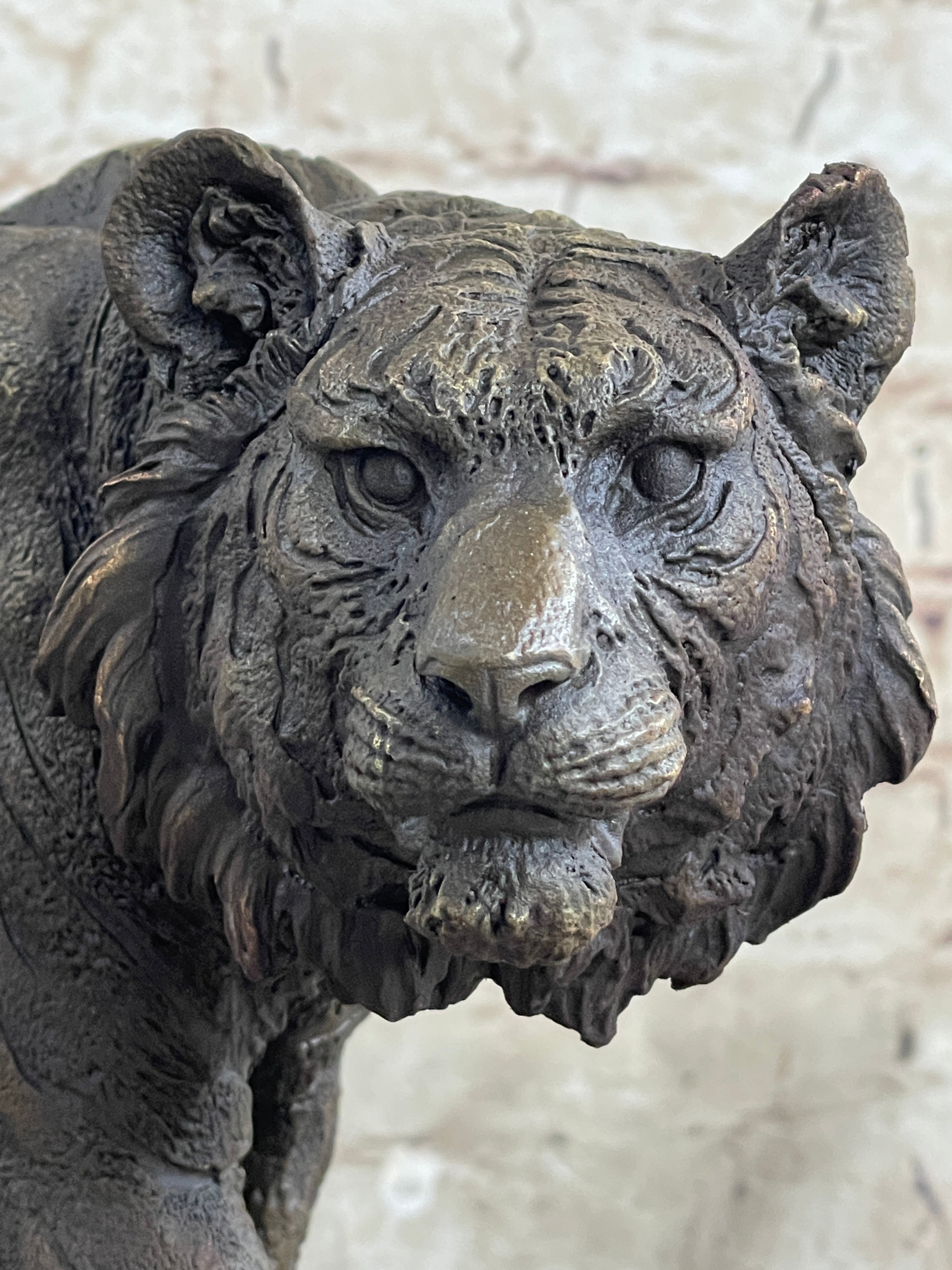 The stunning accuracy in portraying the tiger's distinctive striped coat and well-proportioned body showcases the artist's exceptional talent and dedication to capturing nature's wonders. Crafted using the esteemed "Lost Wax Method," this sculpture boasts a captivating two-toned brown patina that enhances its lifelike appearance. It stands proudly on a sleek marble base, a testament to its artistry and sophistication.