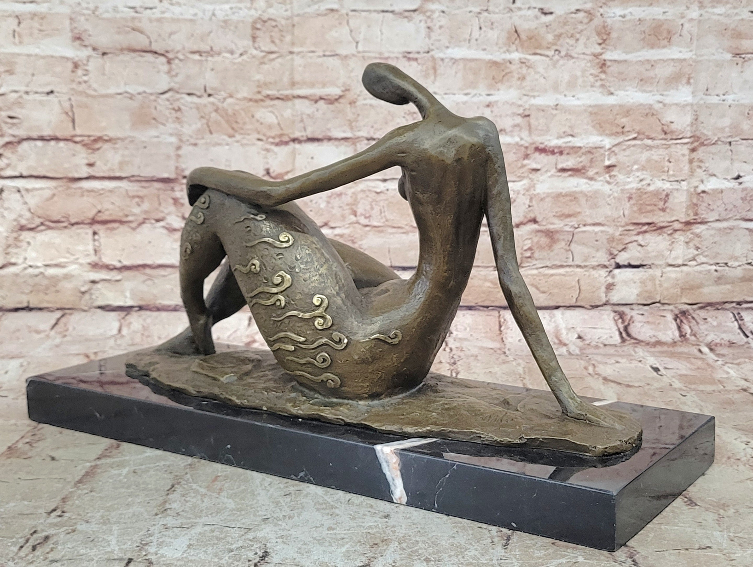 Perched elegantly upon a black marble base, this sculpture is a statement piece that will command attention and admiration in any setting. It serves as an artistic tribute to the beauty, strength, and captivating movements of the female form. Whether you're a collector, an art enthusiast, or someone who appreciates the essence of dance and sculpture, this "Abstract Female Dancer" is a symbol of femininity, power, and artistic prowess that you'll treasure for years to come.Bronze Dimensions with Marble Base: Height 10" X Width 17"