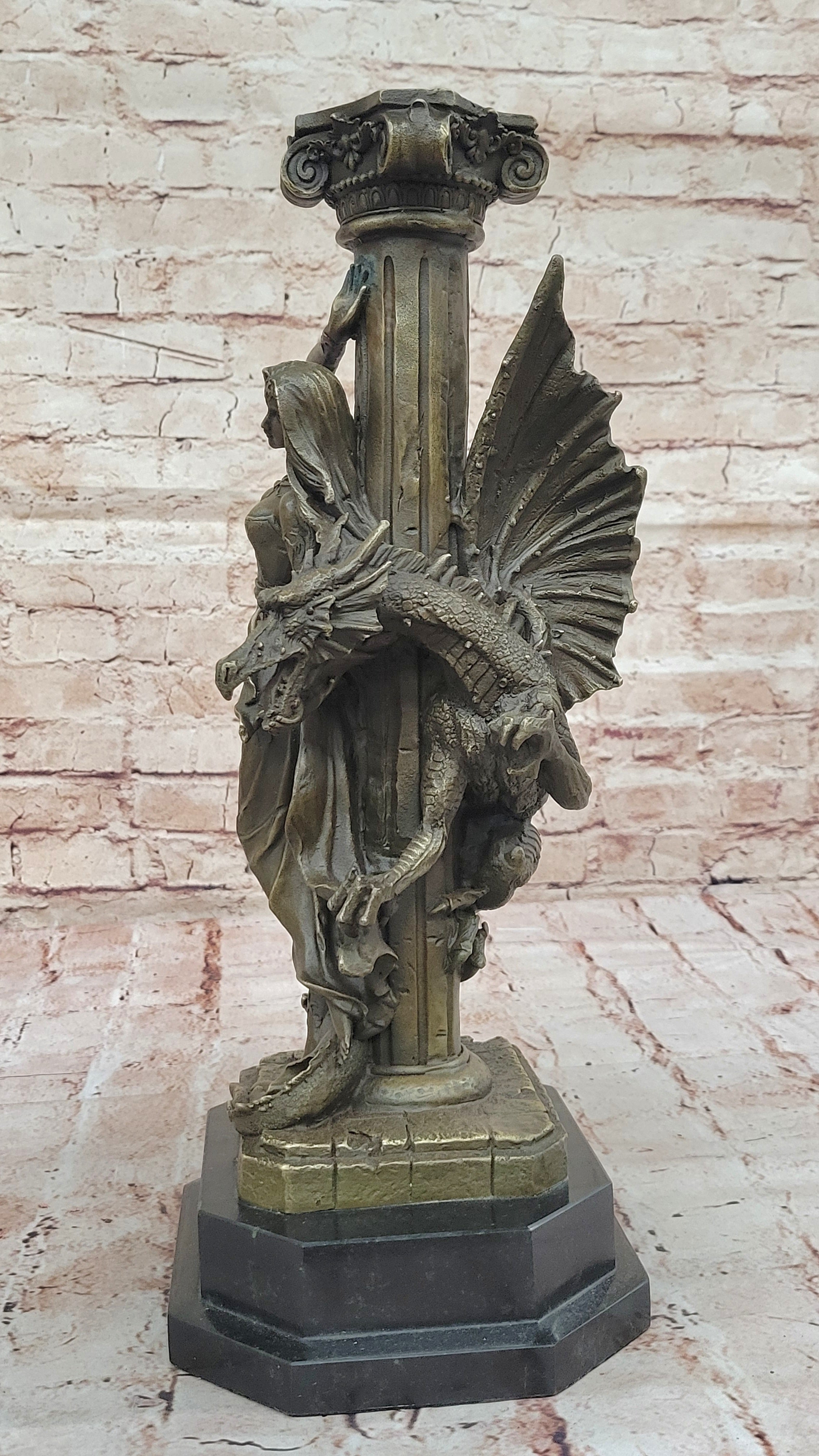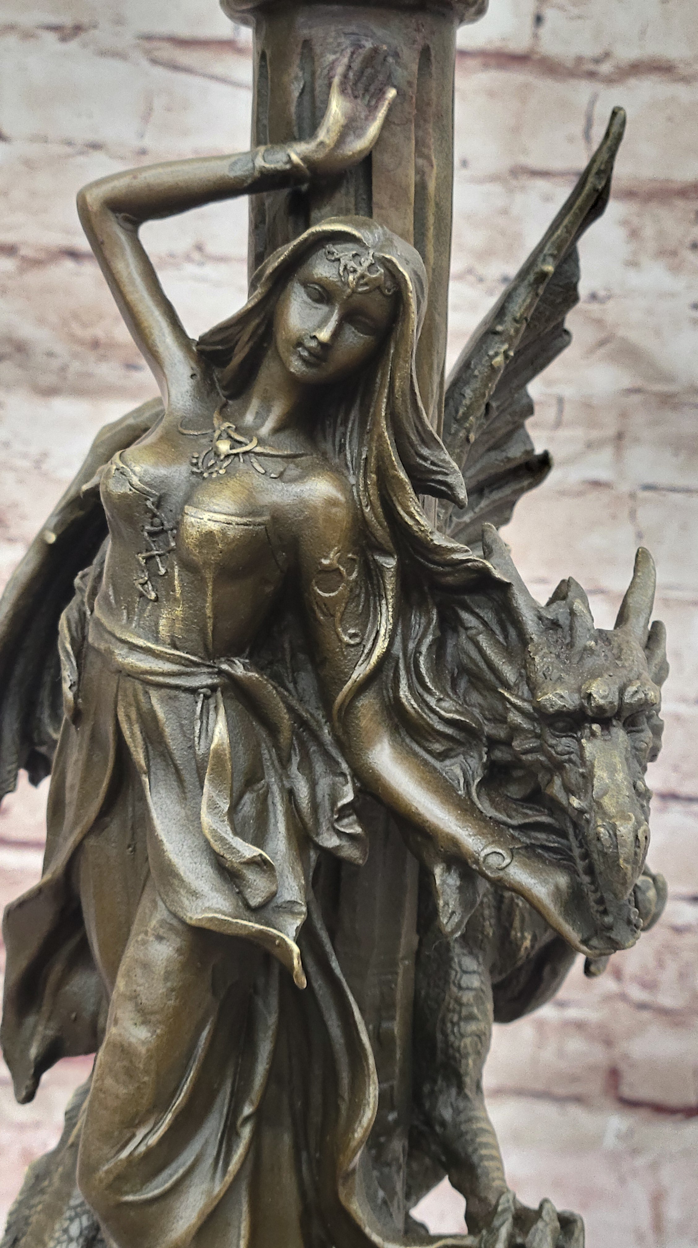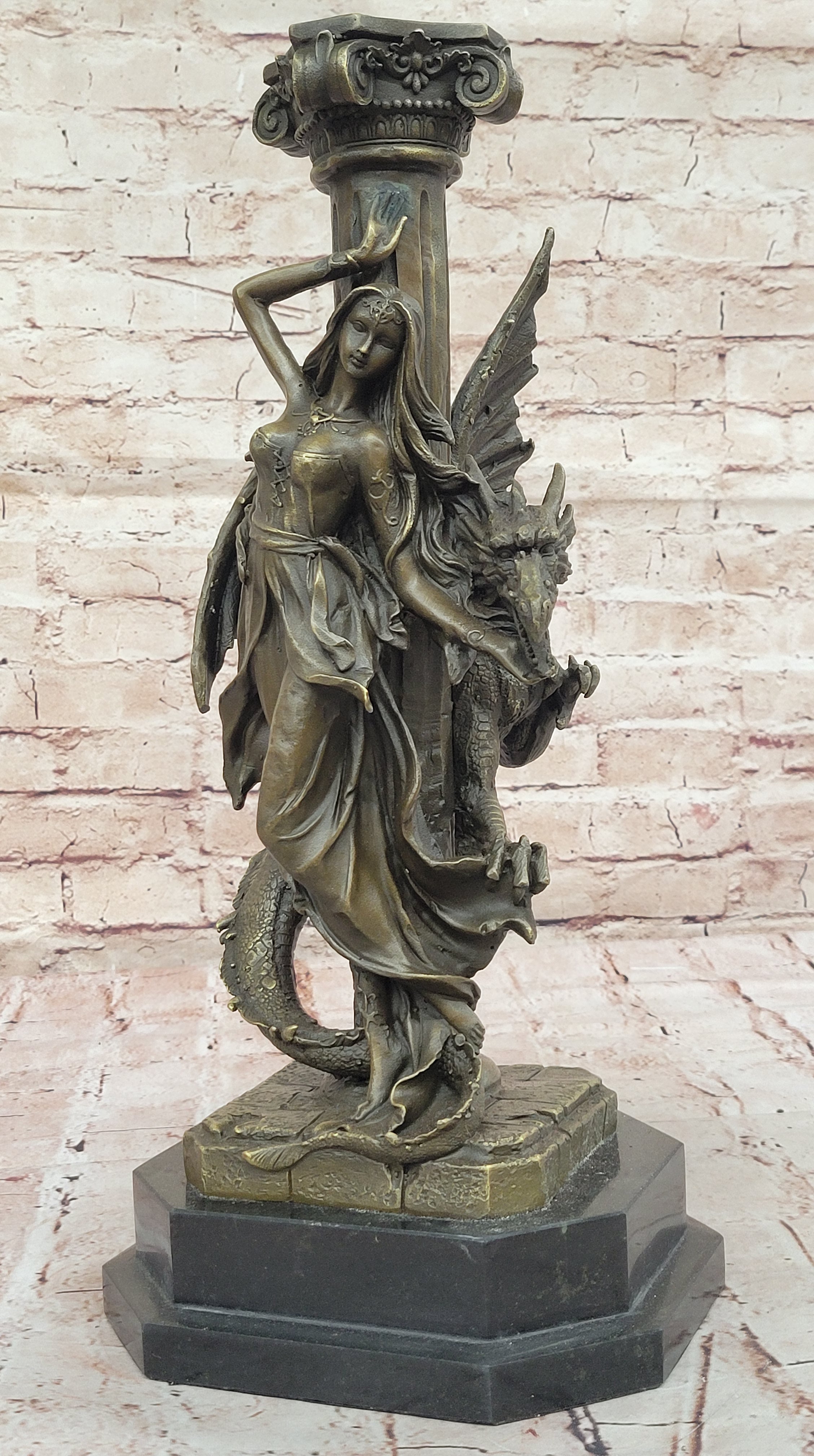 Bronze Fantasy Statue of Woman with Dragon & Column Original Mythical Sculpture