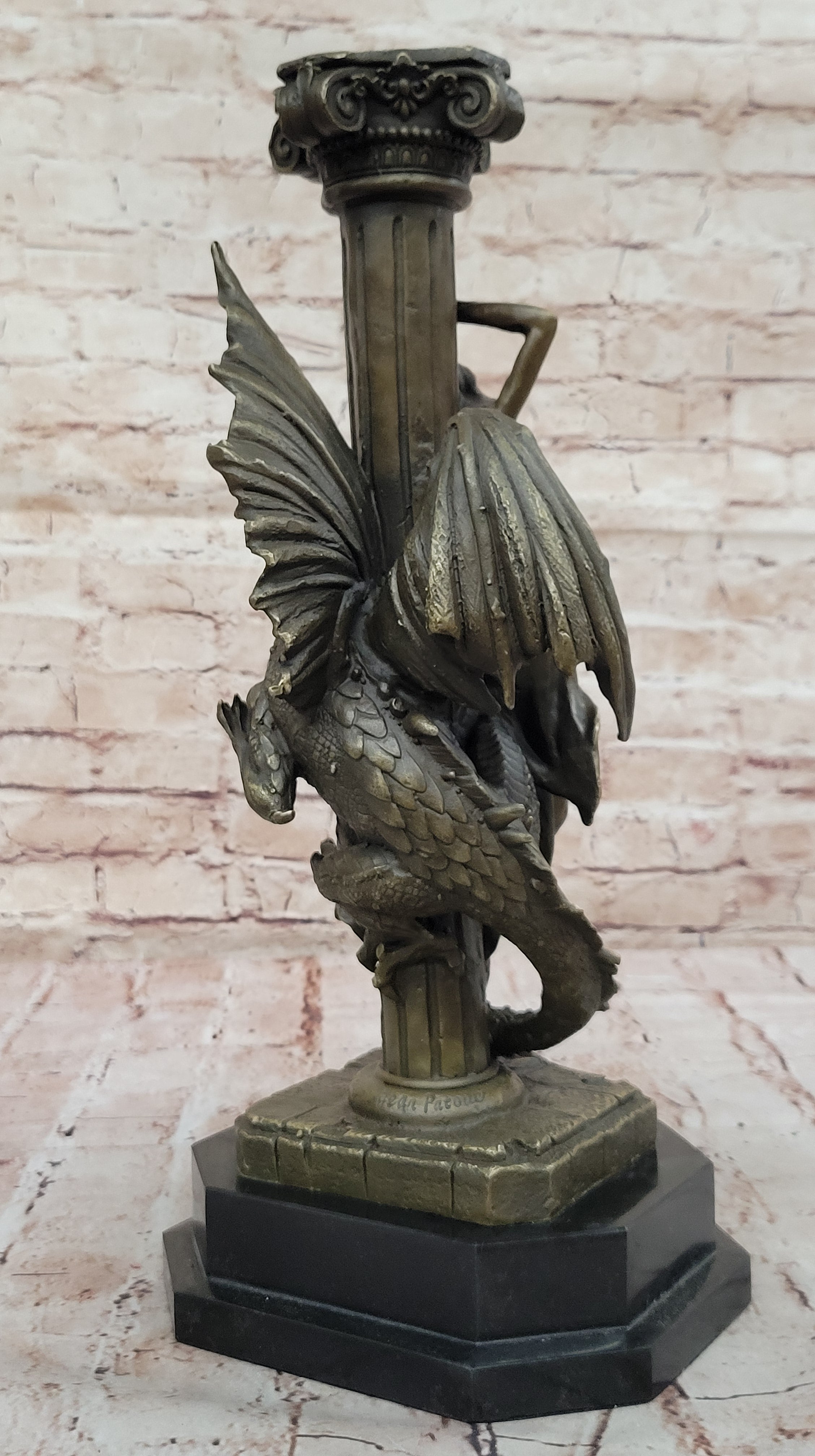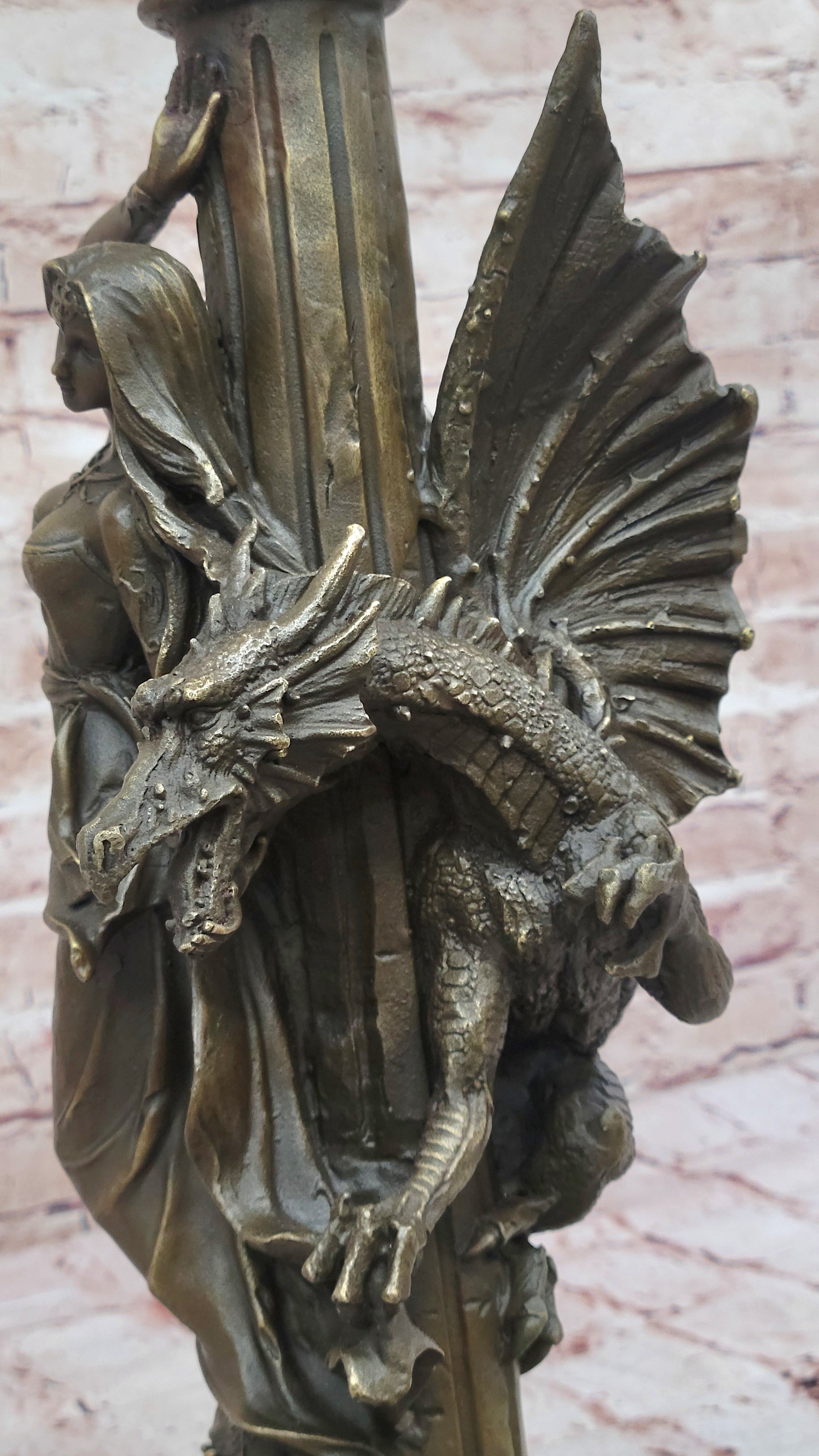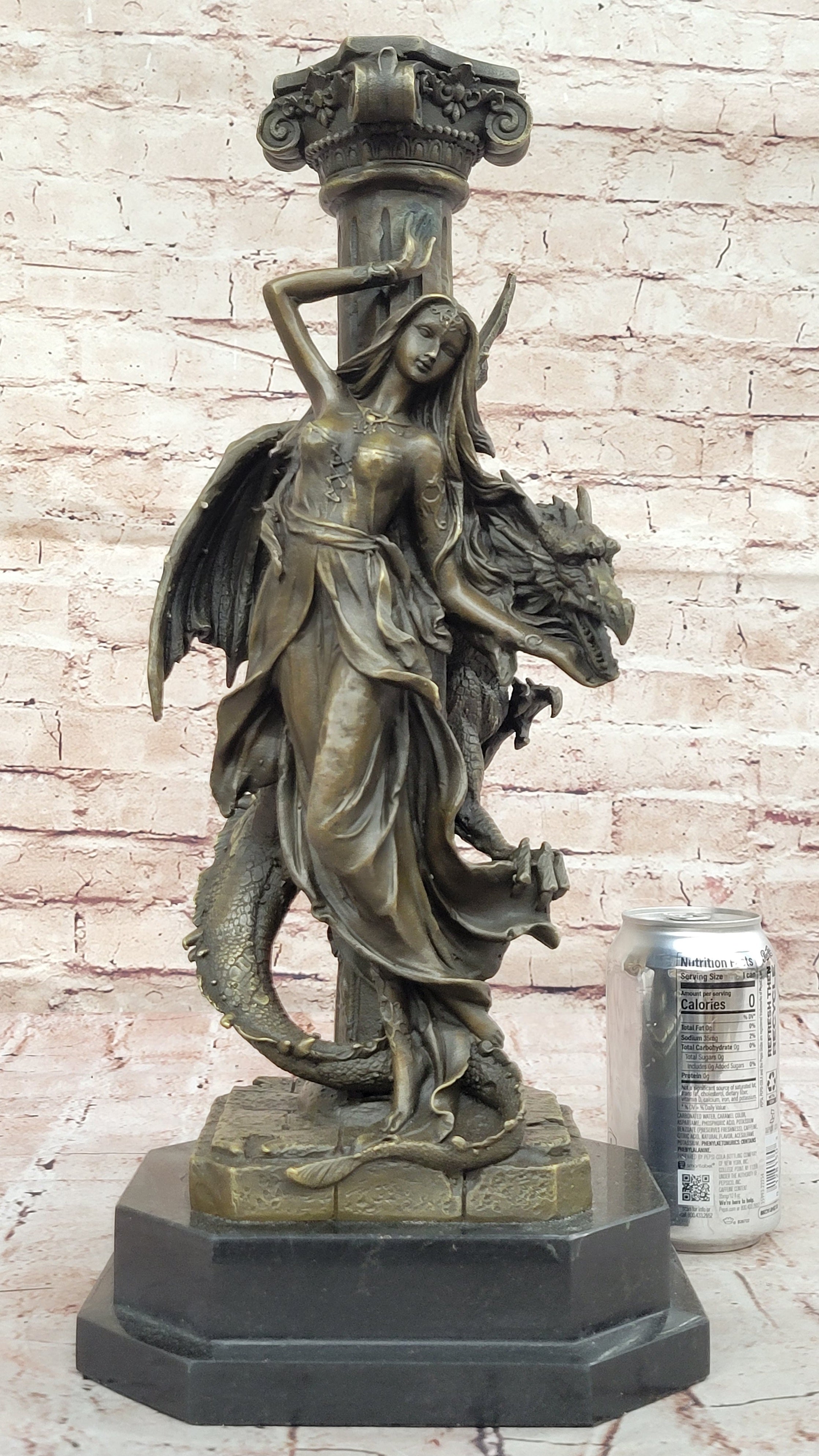 Bronze Fantasy Statue of Woman with Dragon & Column Original Mythical Sculpture