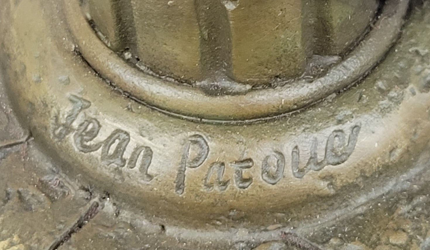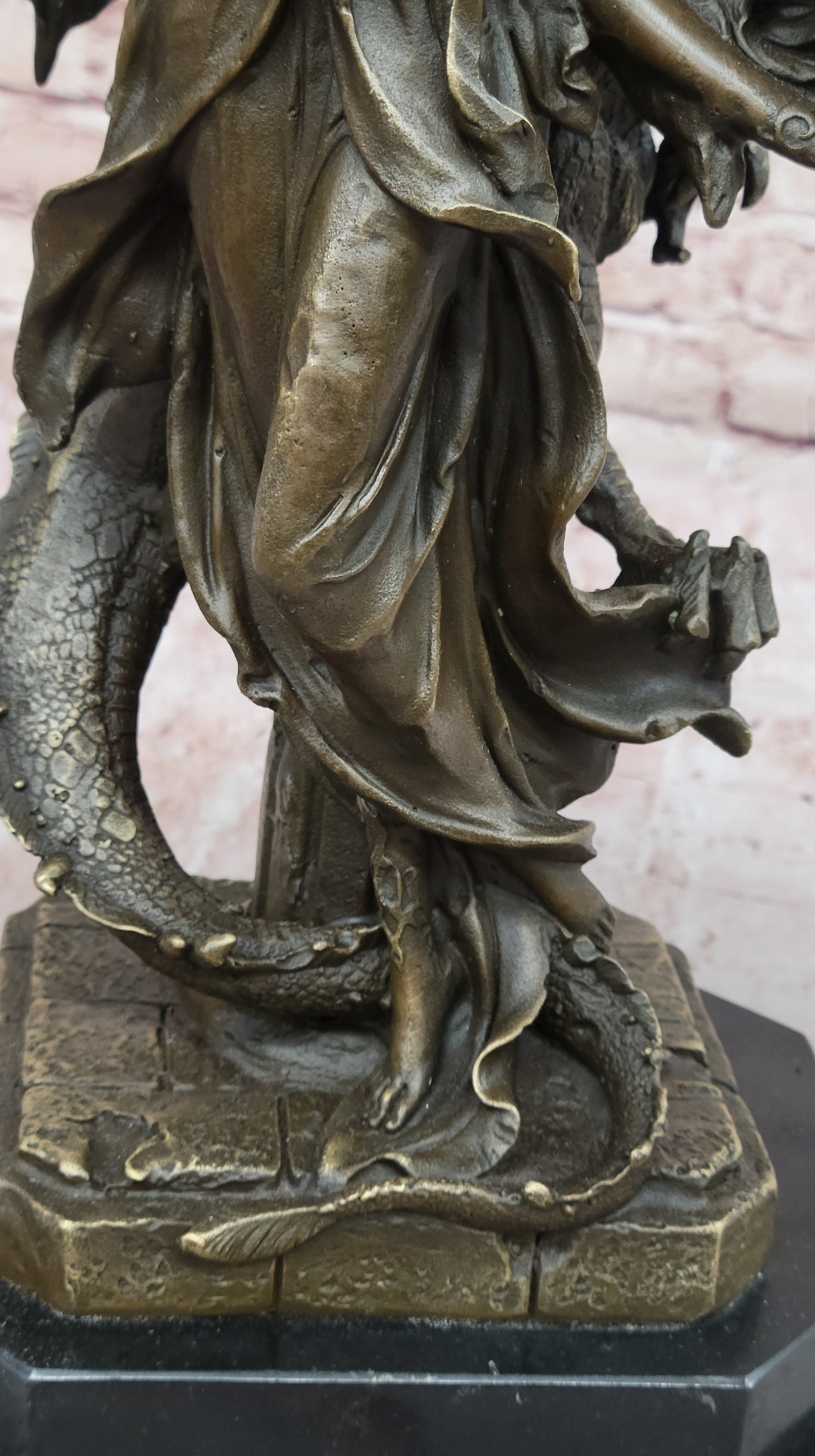 Handcrafted from 100% bronze, this sculpture has been cast using the ancient "Lost Wax Method", with a green patina enhancing the lifelike details of the dragon’s scales and the woman’s delicate form. Mounted on a black marble base and signed by the artist Jean Patoue, this work of art is a testament to the imagination and skill of its creator.Bronze Dimensions with Marble Base: 17" X 7.5"
