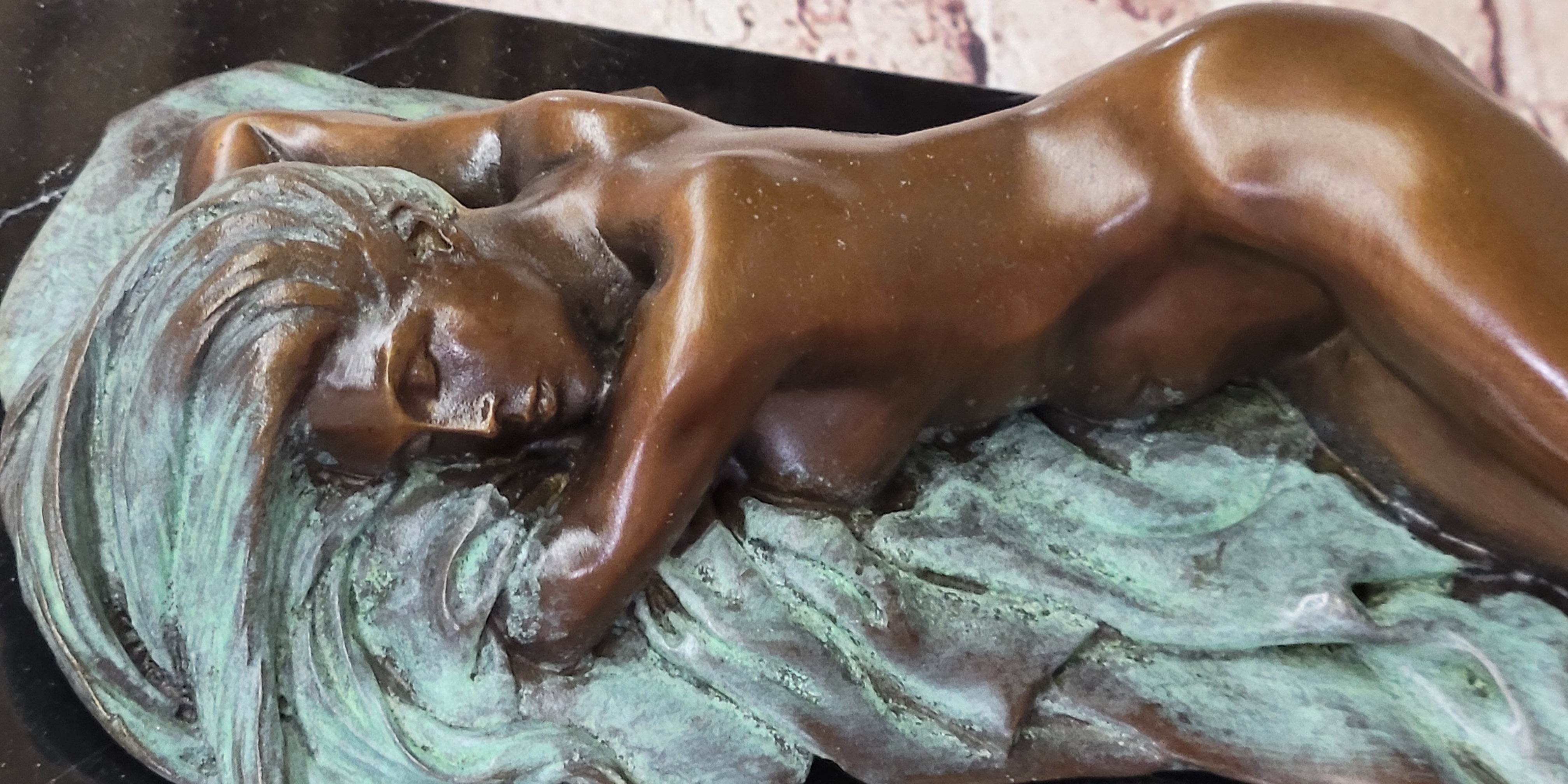 Immerse yourself in the captivating beauty of this bronze sculpture that eloquently portrays a reclining nude woman lost in the ethereal realms of her dreams. The artist masterfully captures the essence of timeless femininity, sculpting every curve with meticulous detail. The woman lies on a soft, flowing sheet, her thick, cascading hair gracefully draping over her arm as she rests her head, emanating tranquility and serenity.