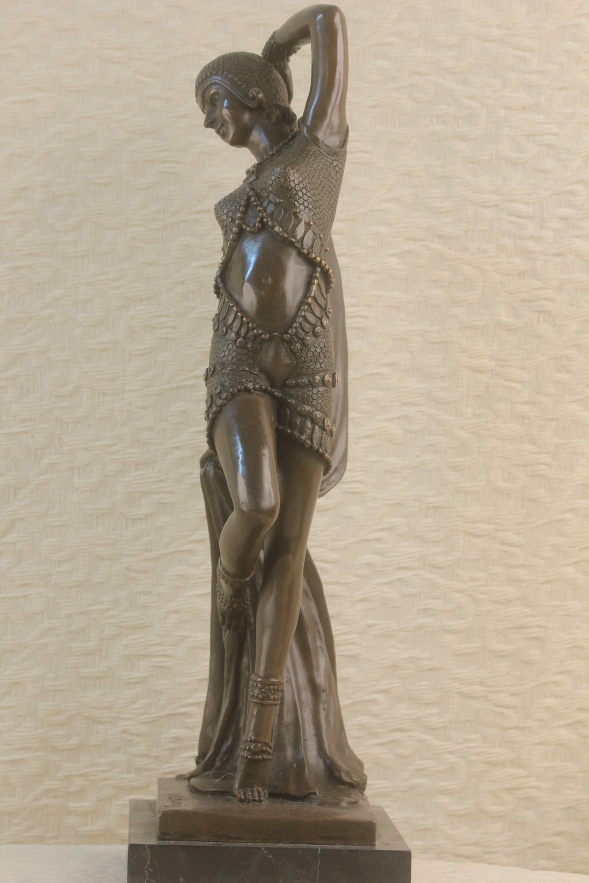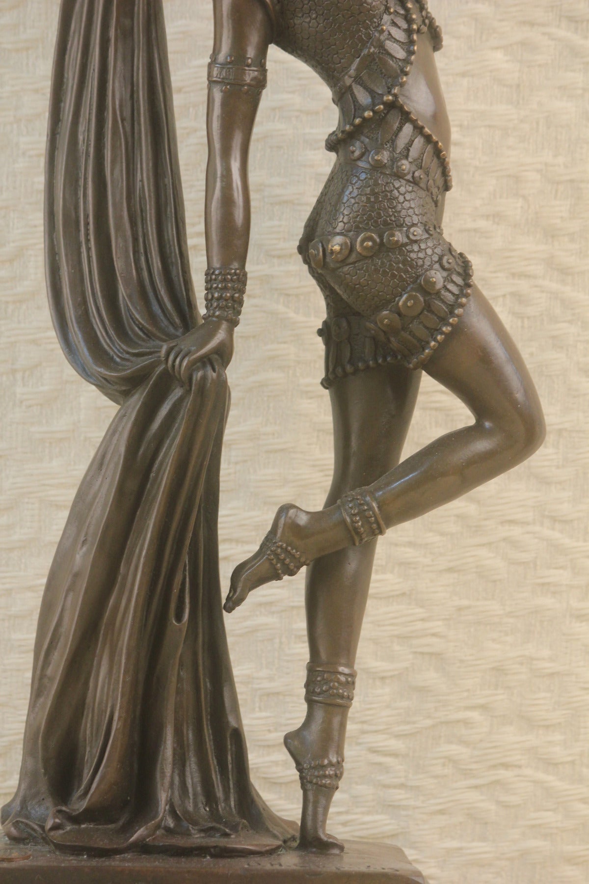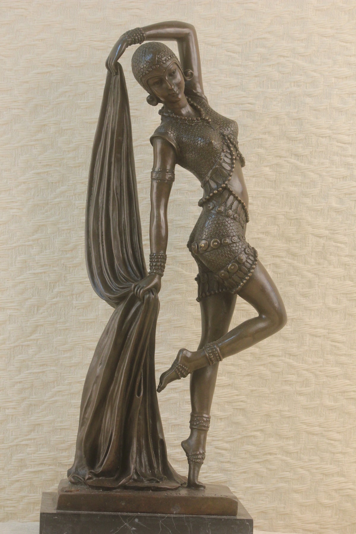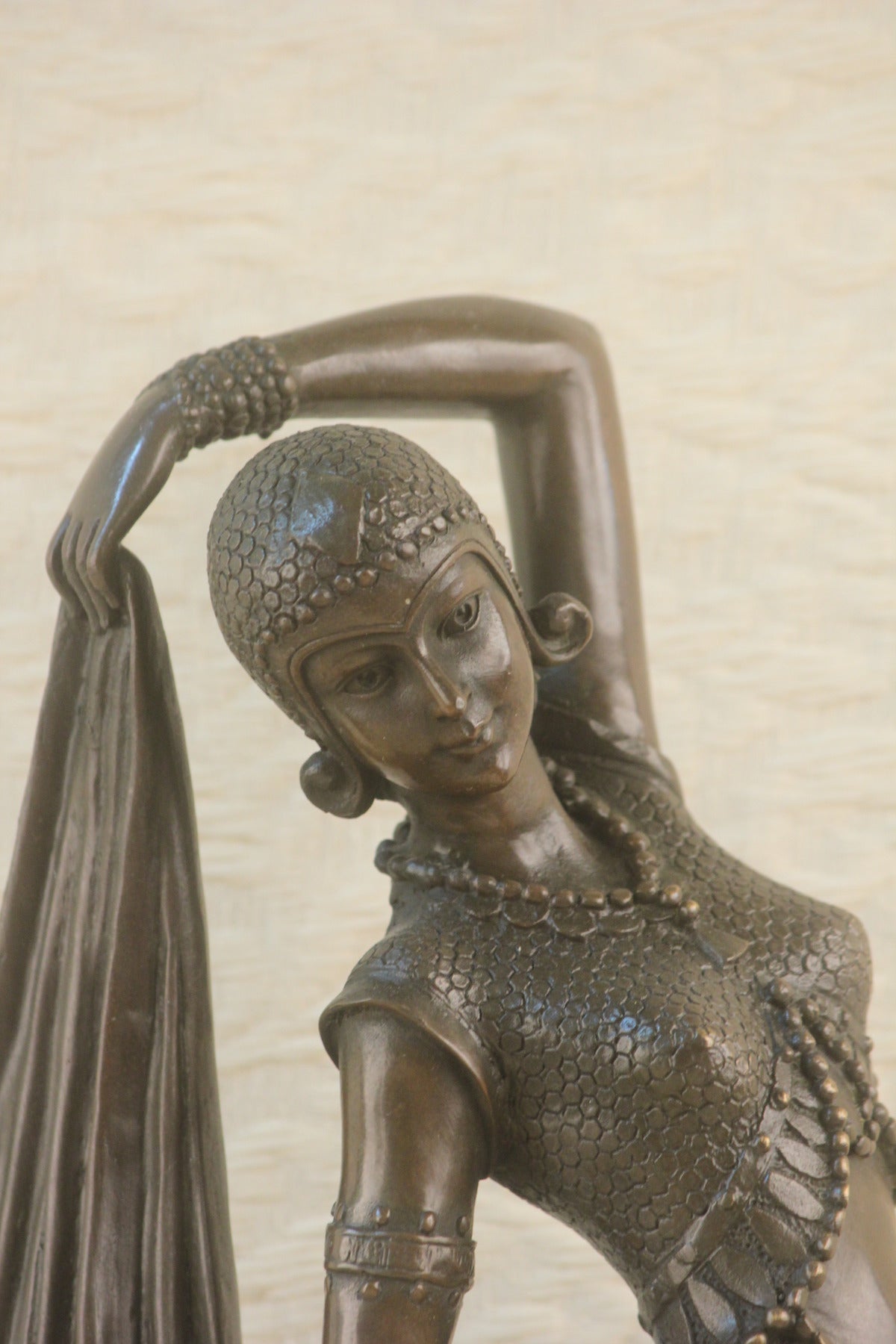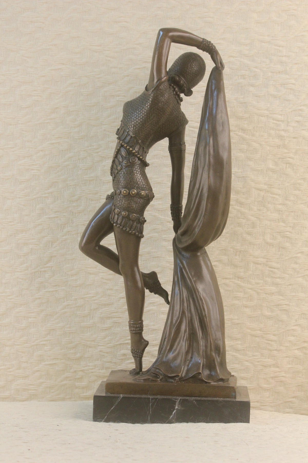 A graceful Art Deco Bronze Dancer on Marble base, Artist signed by D.H. Chiparus. This Lady Dancer wearing a long dress in a beautiful variation, wearing also a nice cap - an absolute worth seeing exhibit. The result is a high impression bronze dancer. Sculpture, stand on right tiptoe, below her, a round formed multi shift marble base. Bronze cast, finest museum quality. Artist signed by D.H. Chiparus. In comparison with the original, this Object is so filigran as possible. That's amazing! It's maden and used to display in a exhibition or for collectors using.Our own production control, saves the top quality of this beautiful bronze.Bronze Dimensions with Marble Base:Height 17" x Width 7"