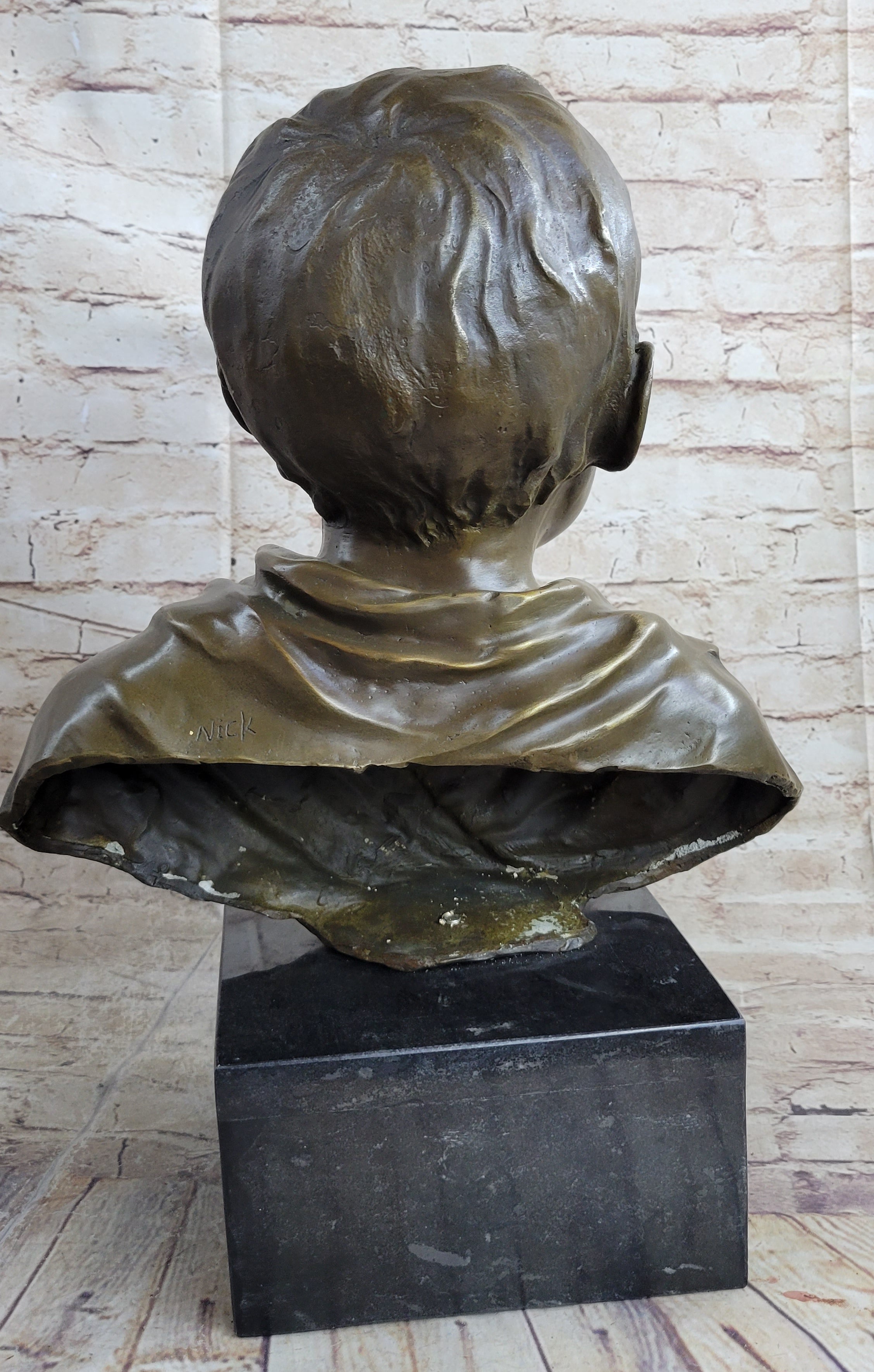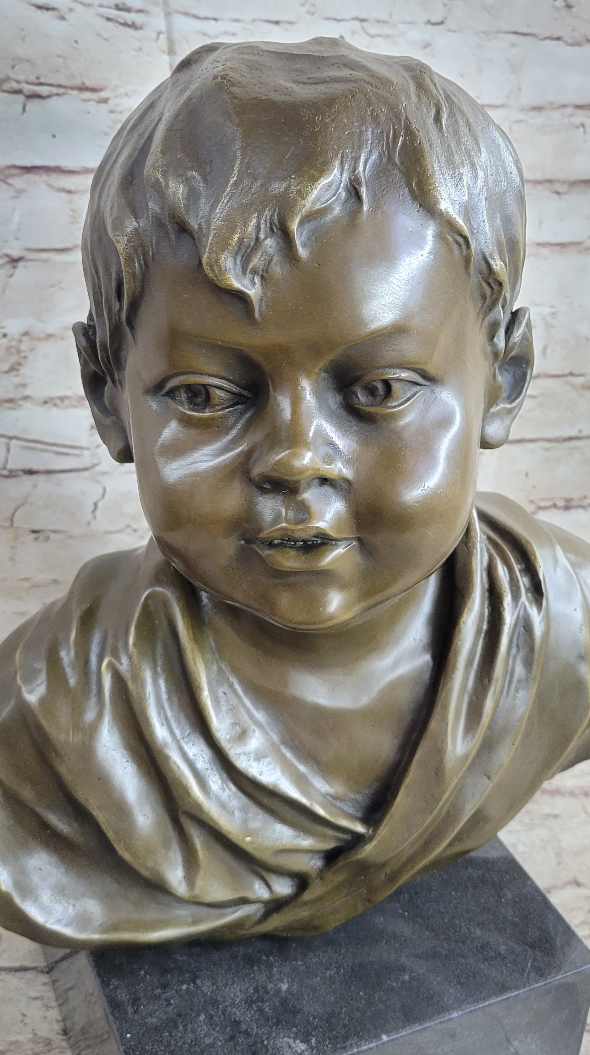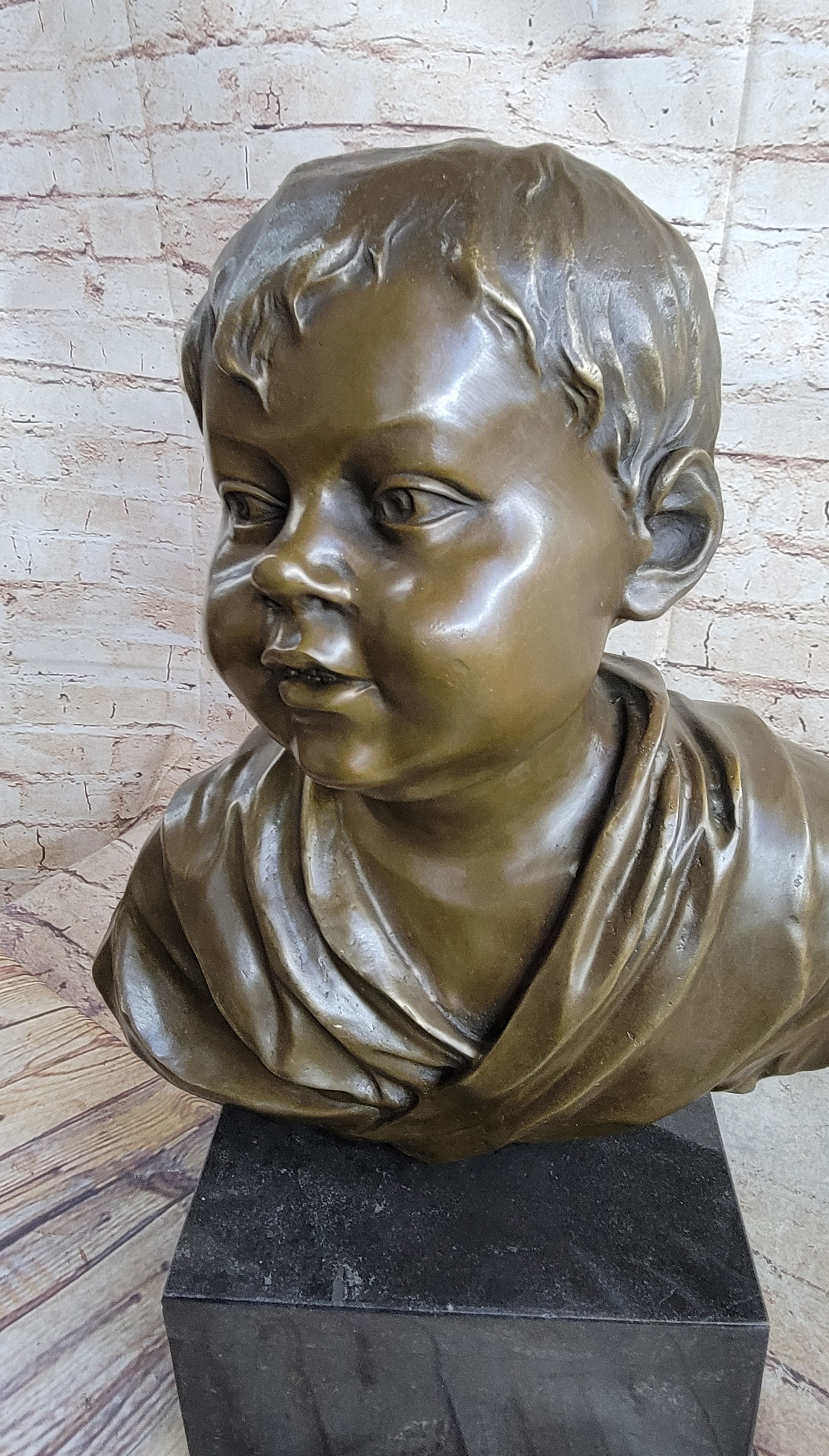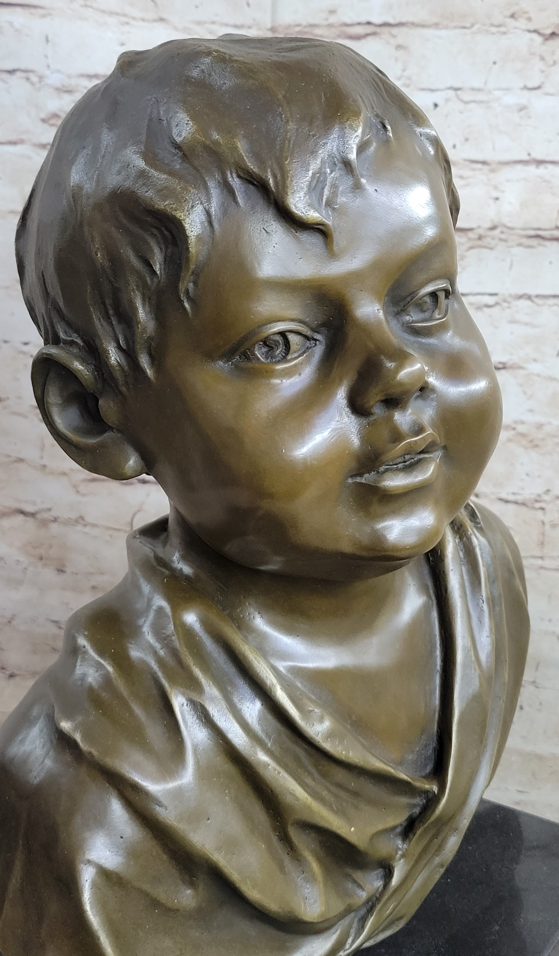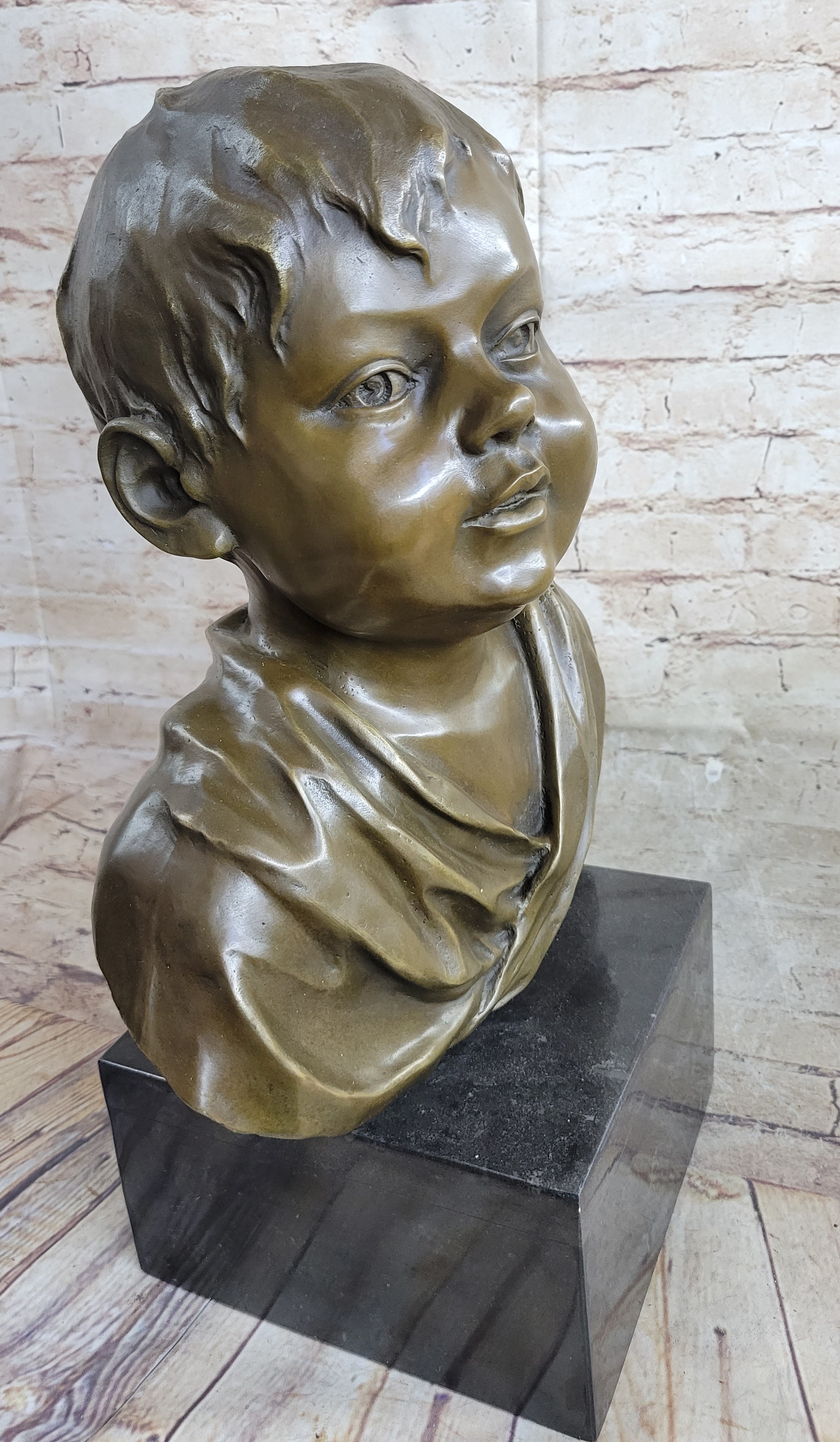 Bronze Metal Bust Statue Sculpture of Young Boy Child on Marble Base Signed Original Art