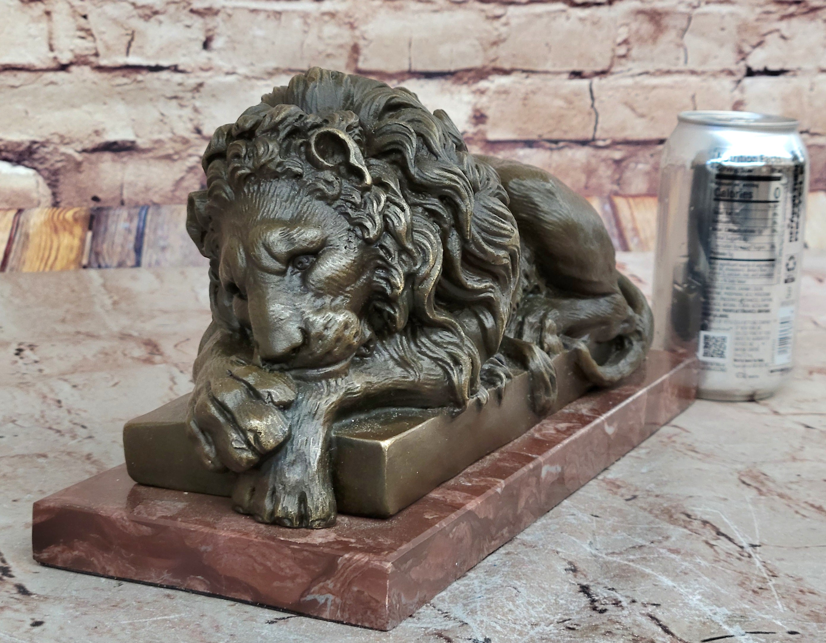 Bronze Metal Guardian Lion Licking his Paw Sculpture Statue on Marble base