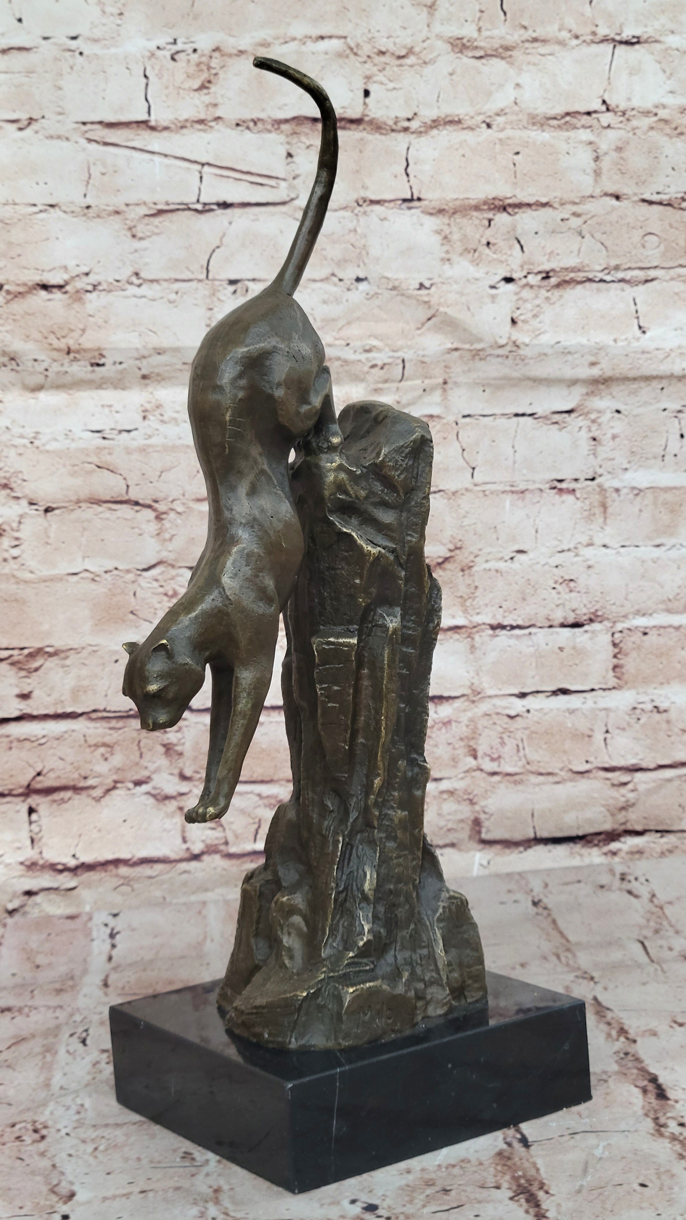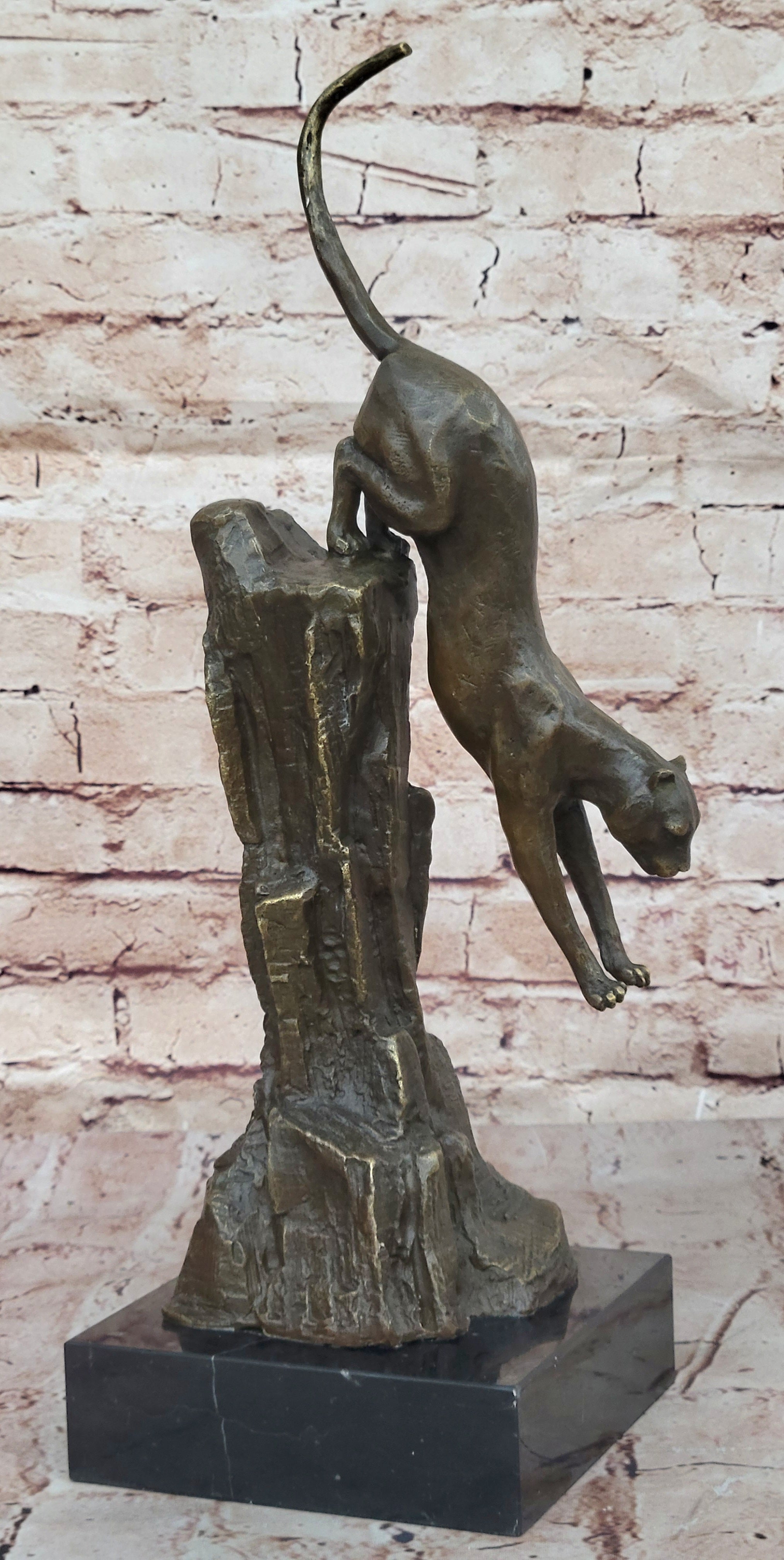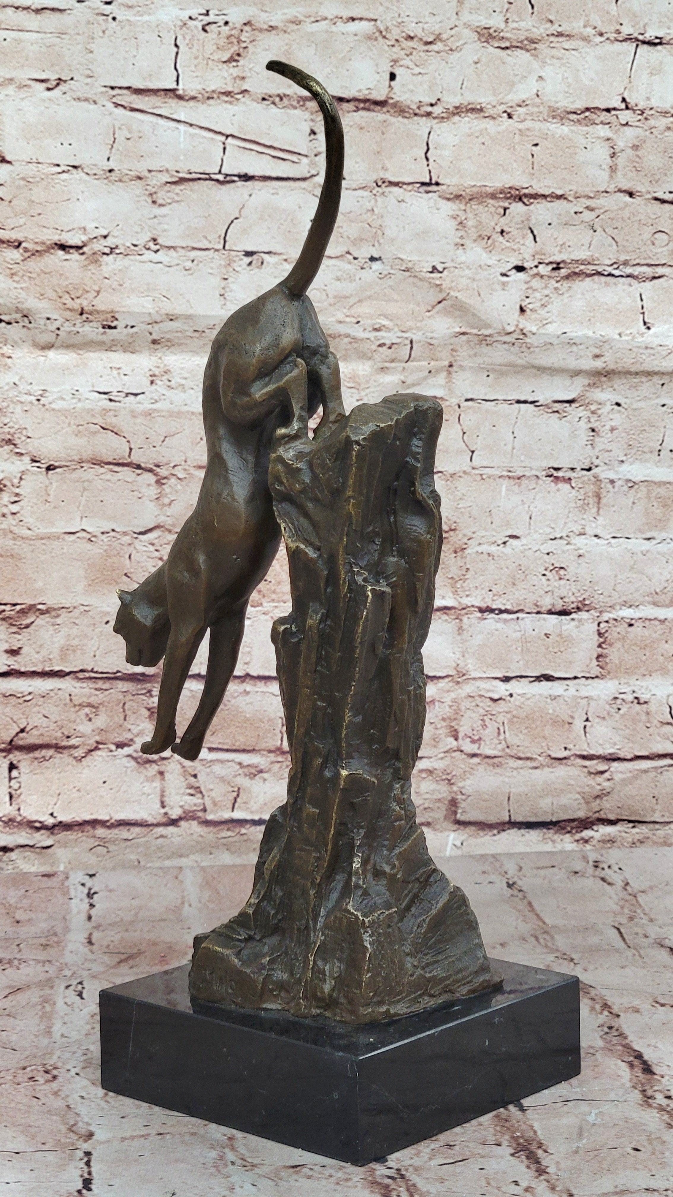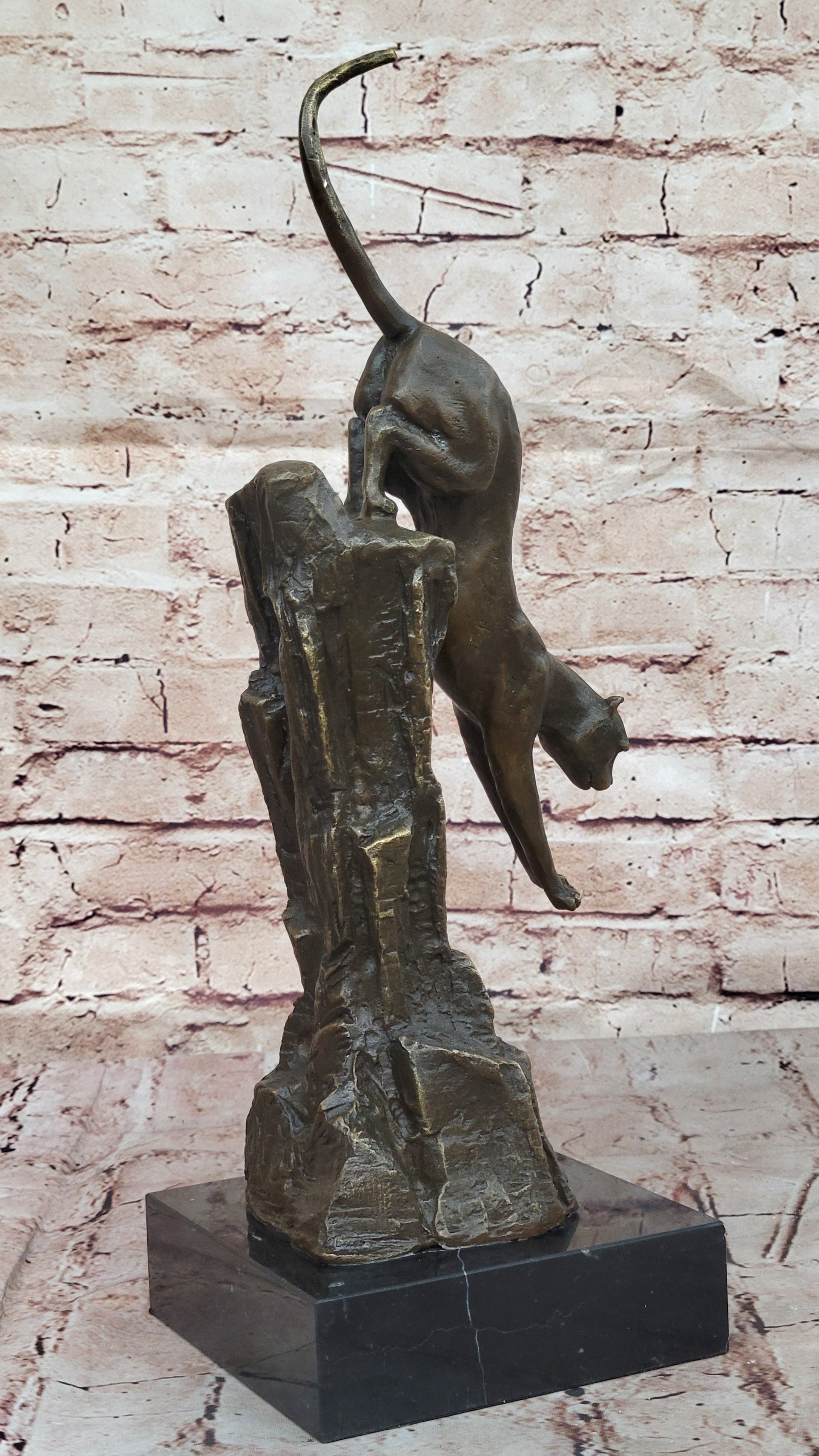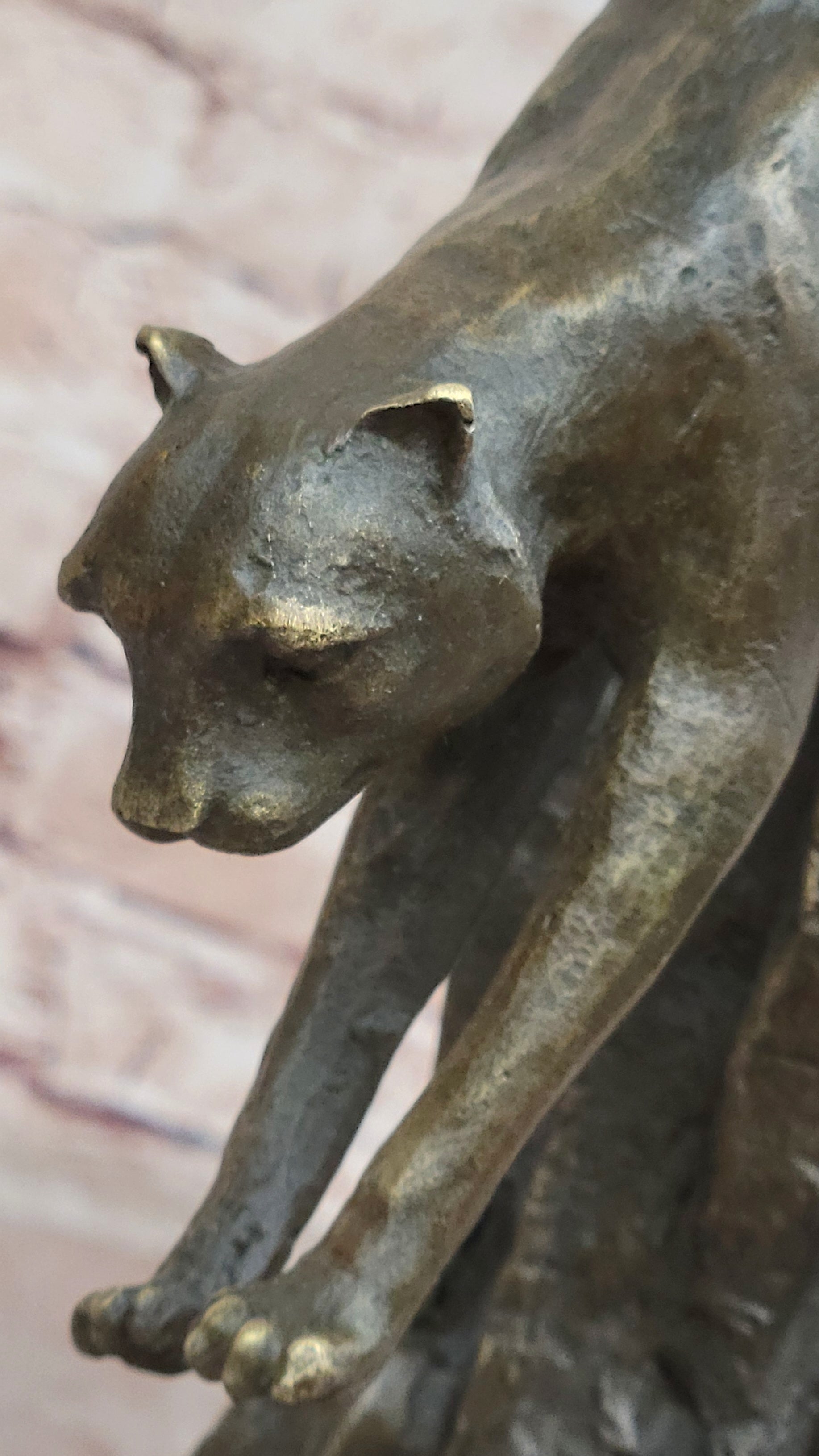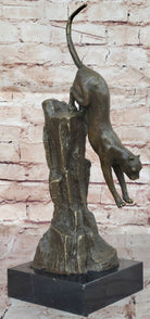 Bronze Mountain Lion Sculpture Cougar Descending Rock on Marble Base