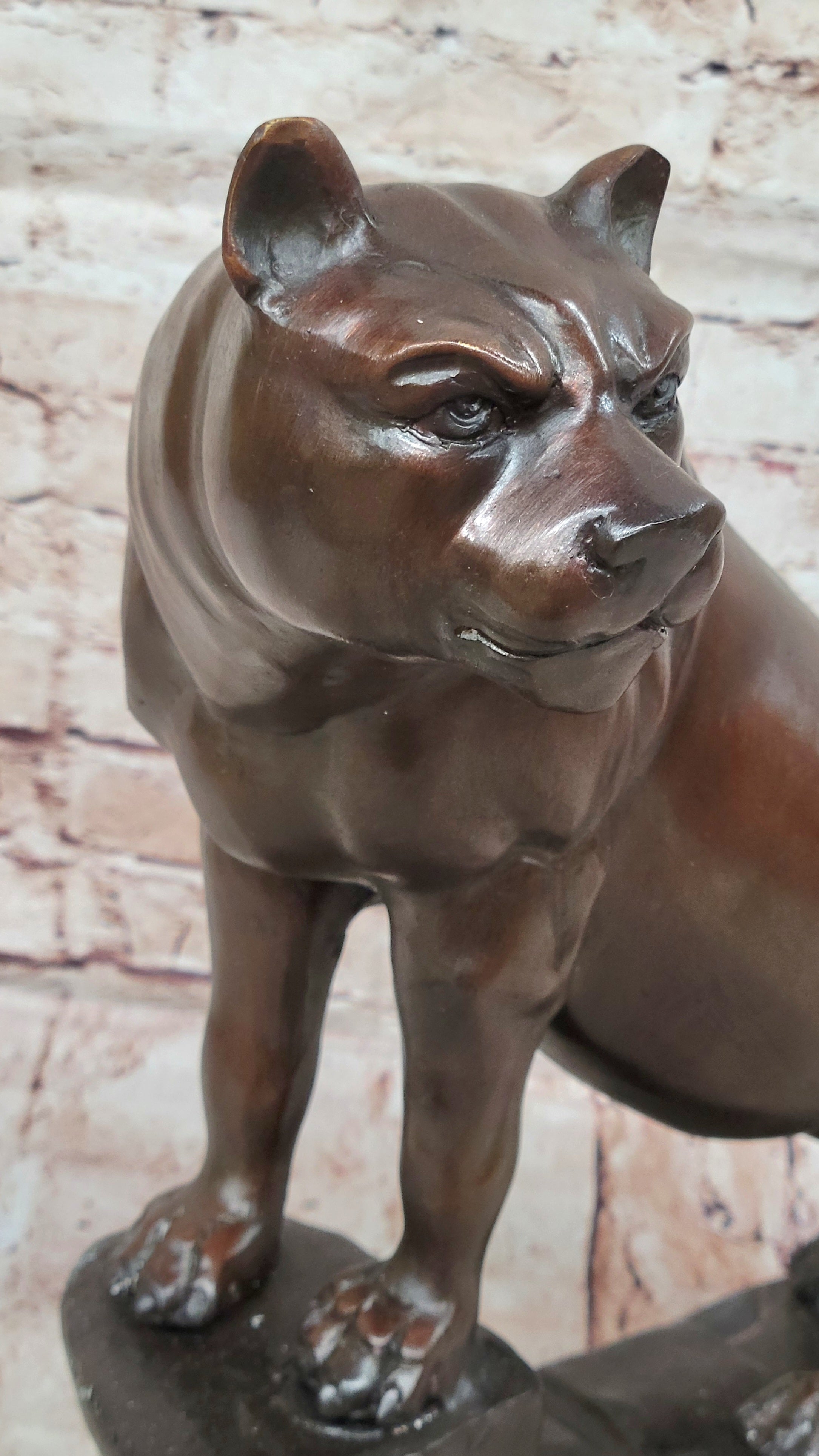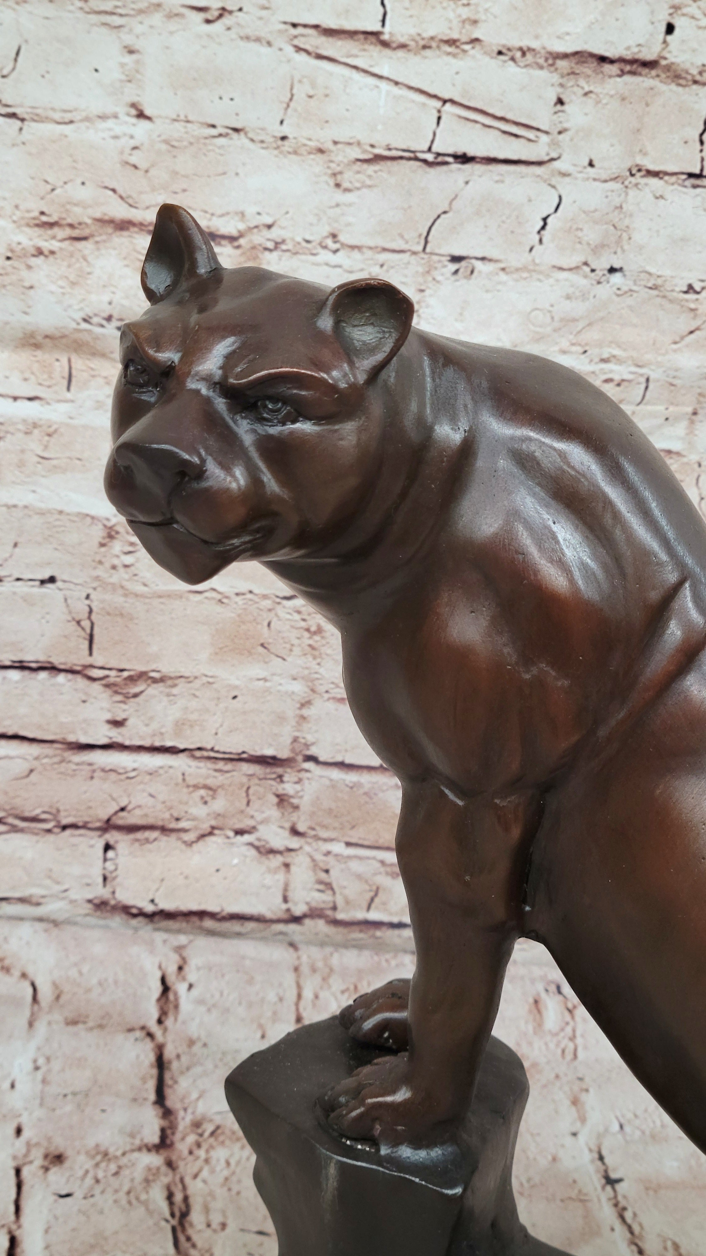 Each sculpture is handmade using the ancient lost wax method, ensuring precision and authenticity in every curve and contour. The rich brown patina enhances the natural textures of the puma’s body, giving the bronze depth and warmth. Mounted securely on a solid black marble base, the work carries both presence and durability, ideal for display in home or office settings.